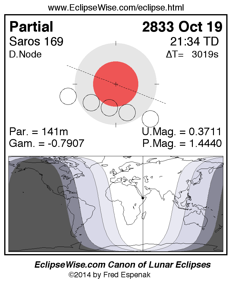 The partial lunar eclipse of 2833 Oct 19 is preceded two weeks earlier by a total solar eclipse on 2833 Oct 04.