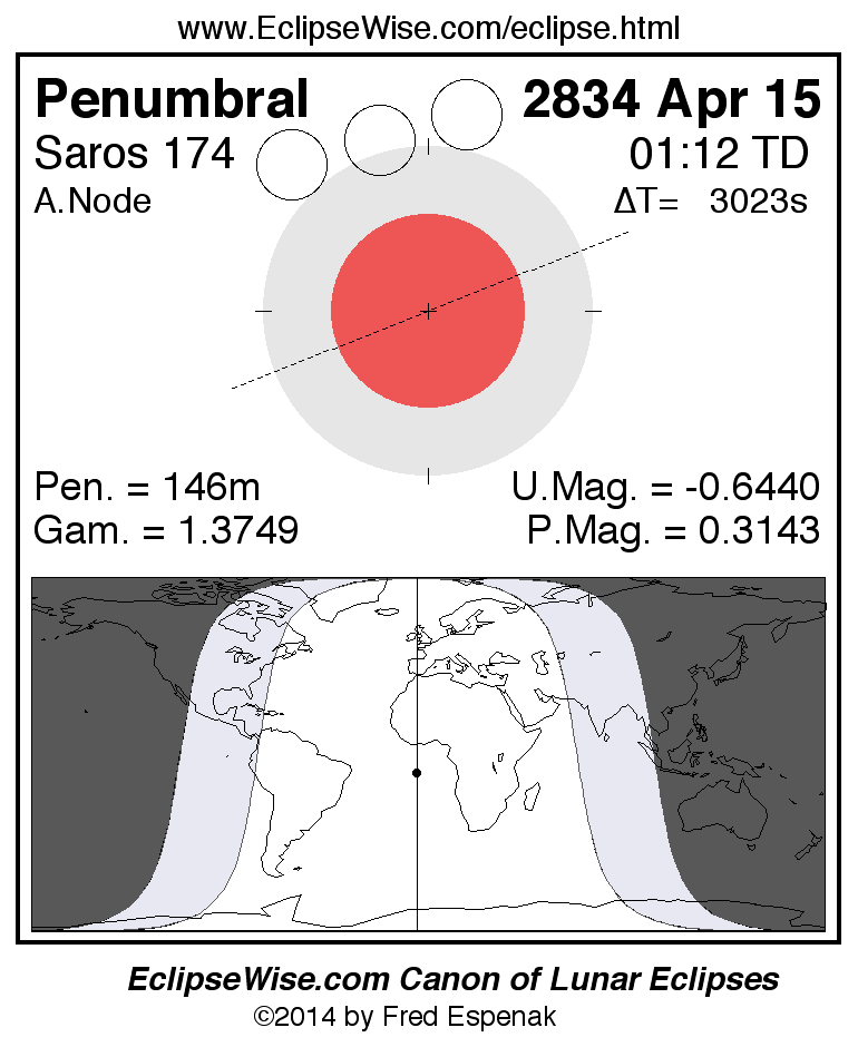 Another lunar eclipse occurs one synodic month before the 2834 Apr 15 eclipse. It is the penumbral lunar eclipse of 2834 Mar 16.