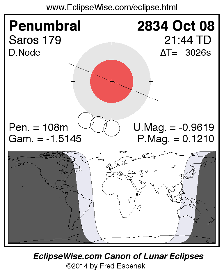 The instant of greatest eclipse takes place on 2834 Oct 08 at 21:43:33 TD (20:53:08 UT1).