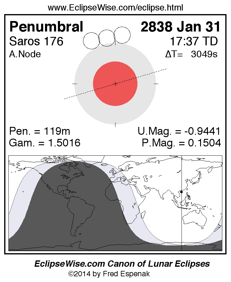 Another lunar eclipse occurs one synodic month before the 2838 Jan 31 eclipse. It is the penumbral lunar eclipse of 2838 Jan 01.