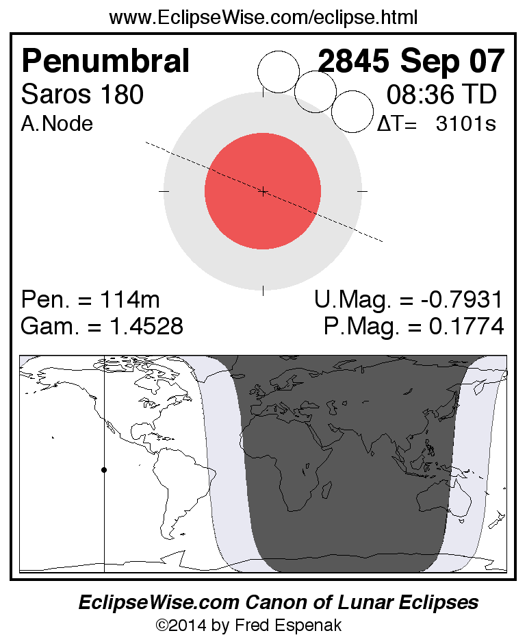 Another lunar eclipse occurs one synodic month before the 2845 Sep 07 eclipse. It is the penumbral lunar eclipse of 2845 Aug 09.