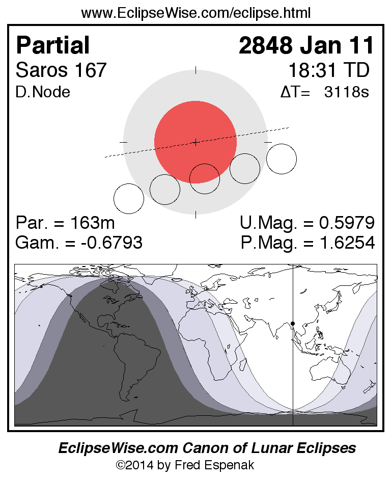 The instant of greatest eclipse takes place on 2848 Jan 11 at 18:31:24 TD (17:39:27 UT1).