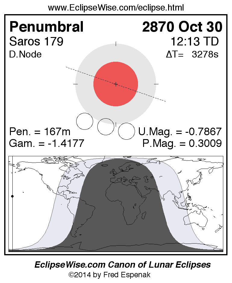 Another lunar eclipse occurs one synodic month before the 2870 Oct 30 eclipse. It is the penumbral lunar eclipse of 2870 Sep 30.