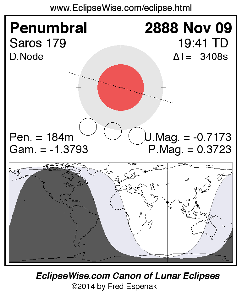 Another lunar eclipse occurs one synodic month before the 2888 Nov 09 eclipse. It is the penumbral lunar eclipse of 2888 Oct 11.