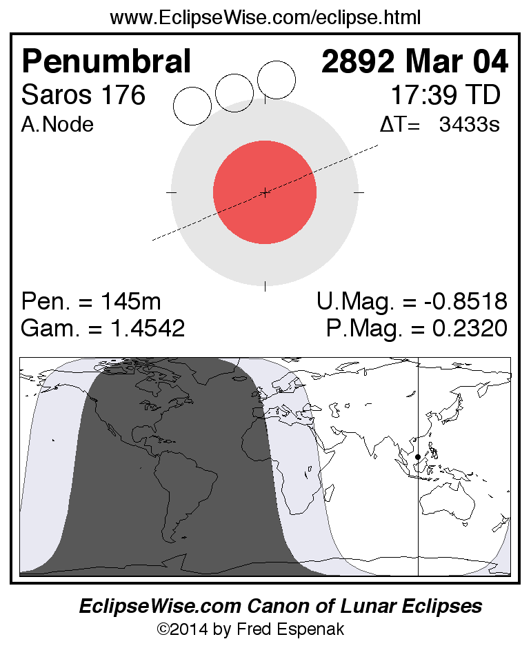 Another lunar eclipse occurs one synodic month before the 2892 Mar 04 eclipse. It is the penumbral lunar eclipse of 2892 Feb 04.