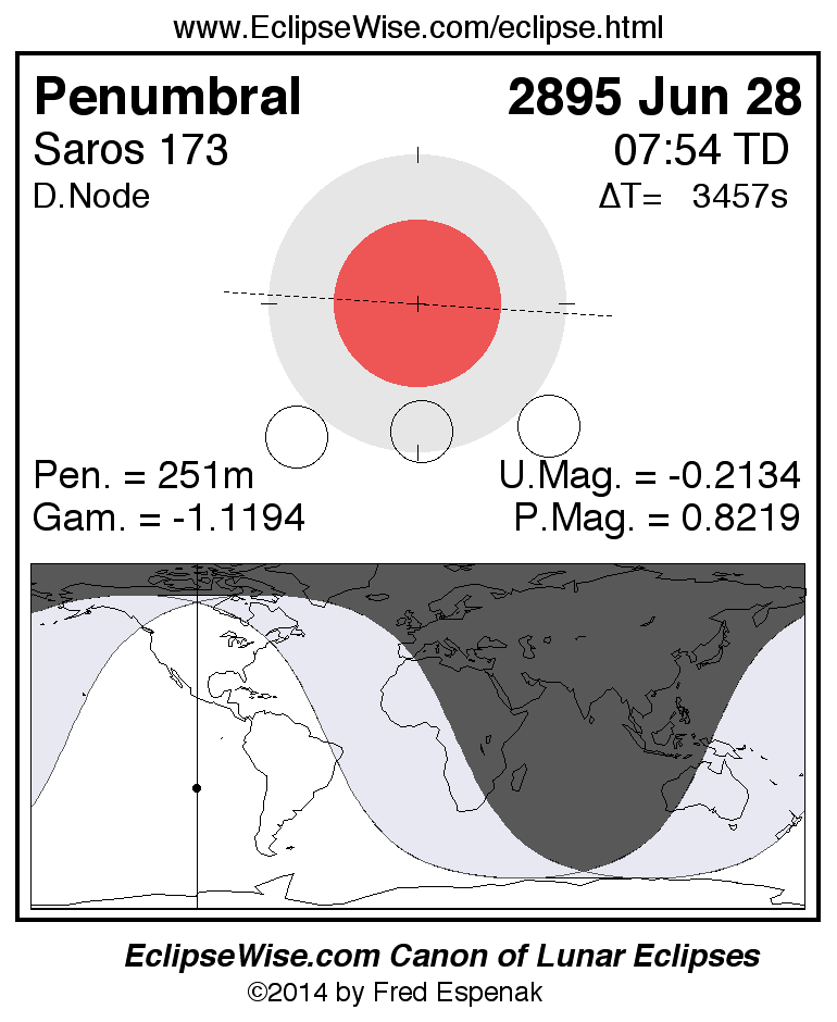 The penumbral lunar eclipse of 2895 Jun 28 is preceded two weeks earlier by a total solar eclipse on 2895 Jun 14.