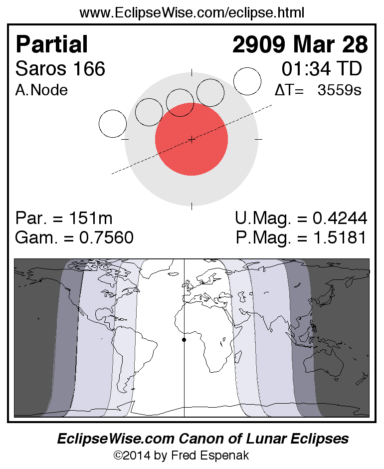 The instant of greatest eclipse takes place on 2909 Mar 28 at 01:34:24 TD (00:35:05 UT1).