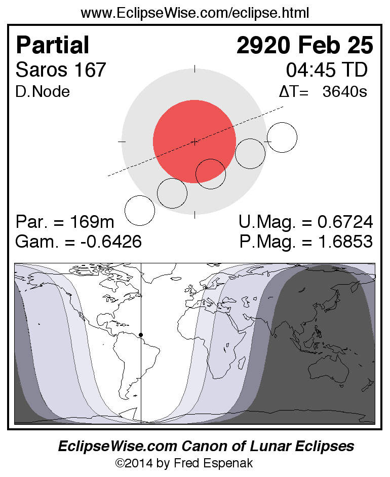 The instant of greatest eclipse takes place on 2920 Feb 25 at 04:45:26 TD (03:44:46 UT1).