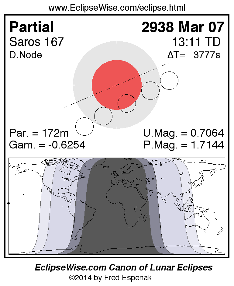 The instant of greatest eclipse takes place on 2938 Mar 07 at 13:10:59 TD (12:08:02 UT1).
