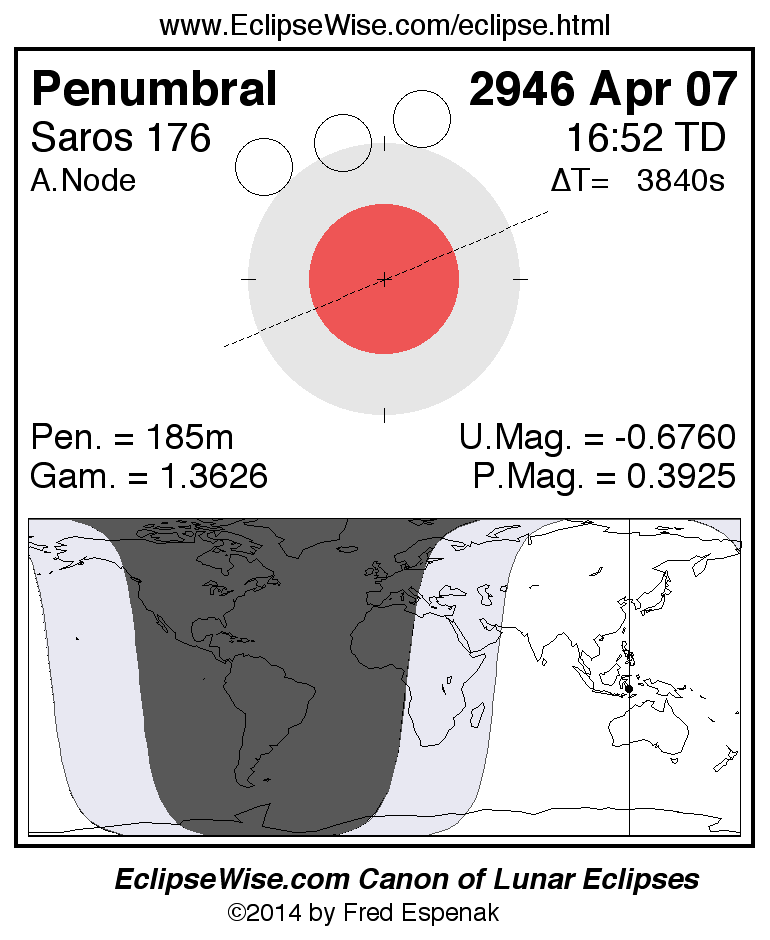 The penumbral lunar eclipse of 2946 Apr 07 is preceded two weeks earlier by a total solar eclipse on 2946 Mar 24.