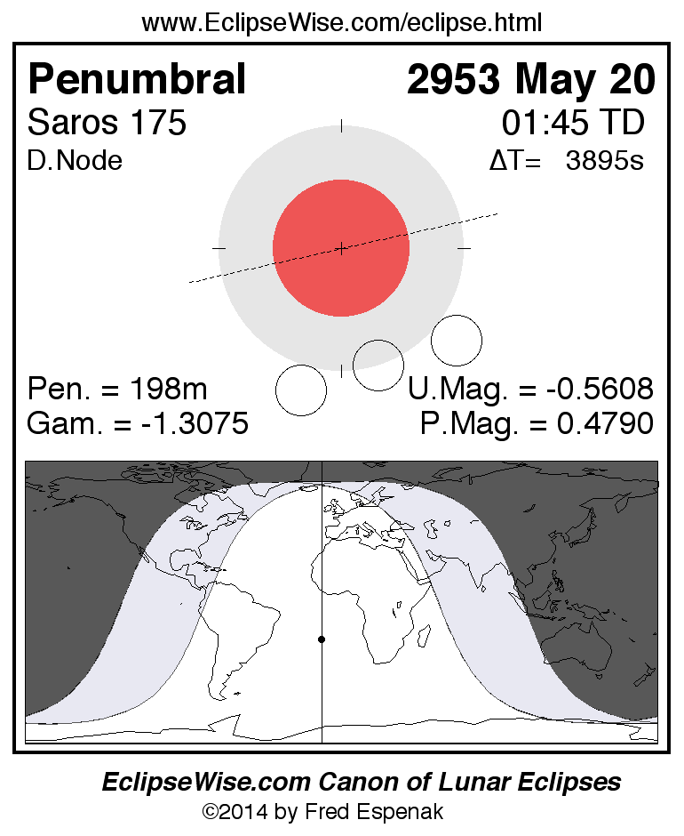 Another lunar eclipse occurs one synodic month before the 2953 May 20 eclipse. It is the penumbral lunar eclipse of 2953 Apr 20.