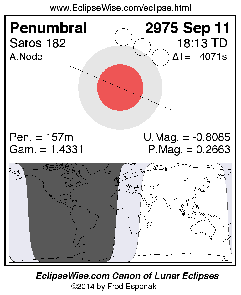Another lunar eclipse occurs one synodic month before the 2975 Sep 11 eclipse. It is the penumbral lunar eclipse of 2975 Aug 13.
