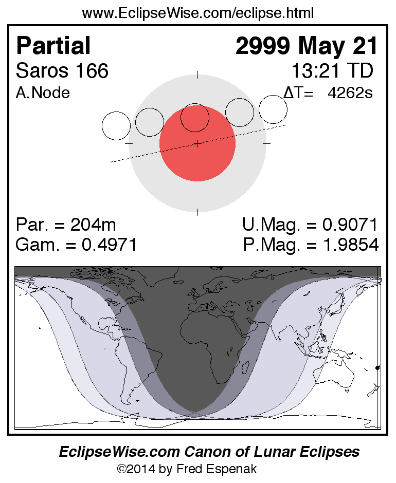 The partial lunar eclipse of 2999 May 21 is preceded two weeks earlier by a total solar eclipse on 2999 May 06.