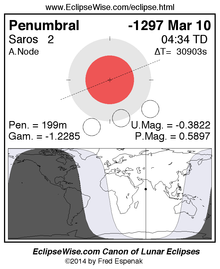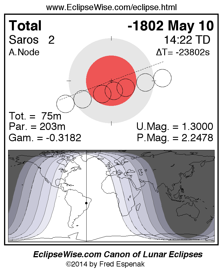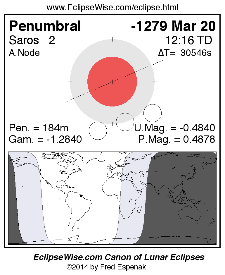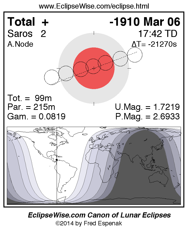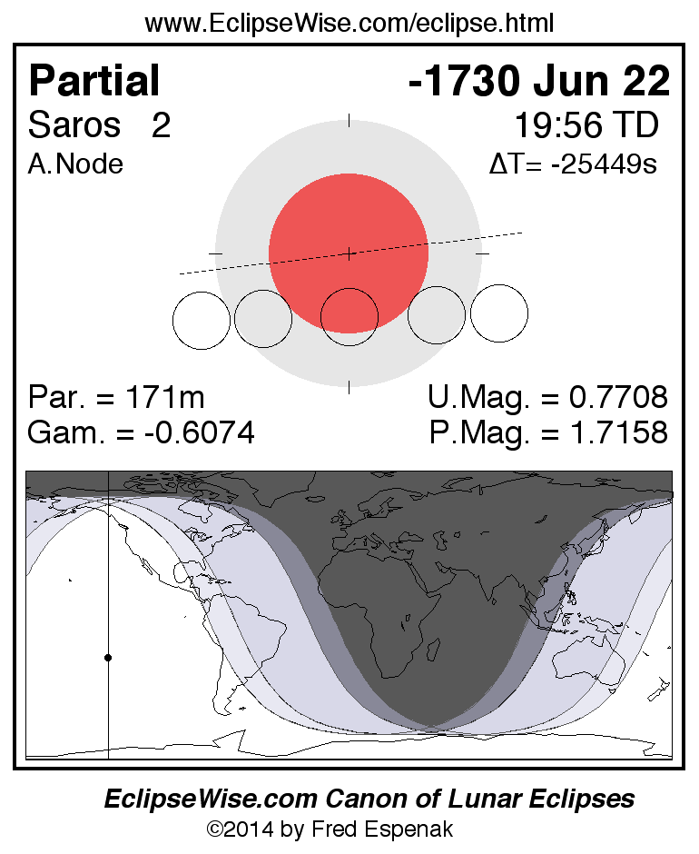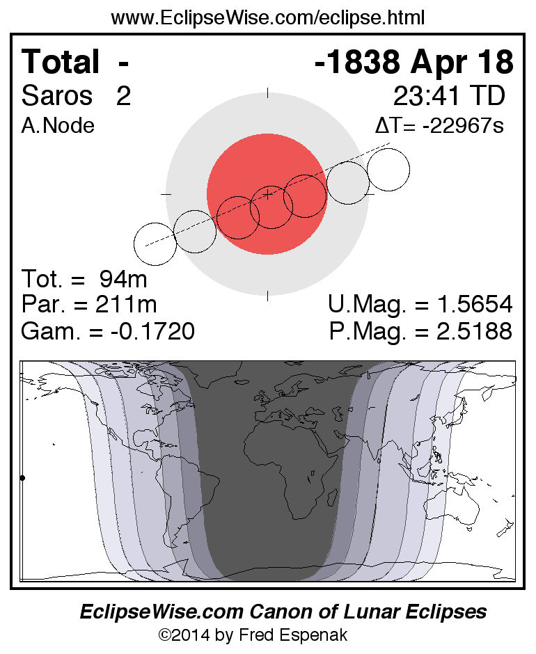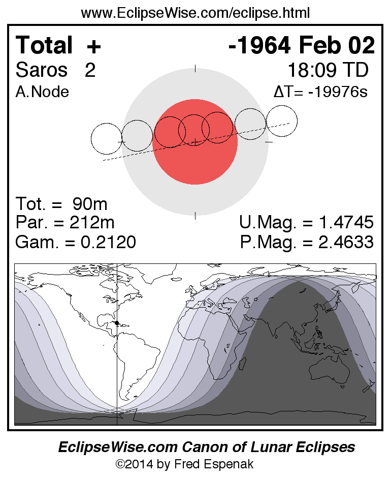 A panorama of all lunar eclipses belonging to Saros 2 is presented here. Each figure shows the Moon's path with respect to Earth's penumbral and umbral shadows. Below the path is a map depicting the geographic region of visibility for the eclipse. The date and time are given for the instant of Greatest Eclipse. Every figure serves as a hyperlink to the EclipseWise Prime page for that eclipse with a larger figure and complete details for the eclipse. Visit the Key to Lunar Eclipse Figures for a detailed explanation of these diagrams. Near the bottom of this page are a series of hyperlinks for more on lunar eclipses.