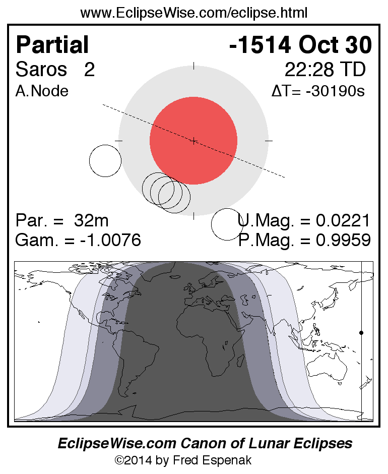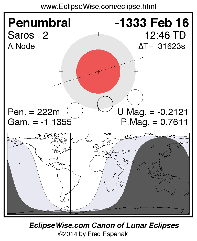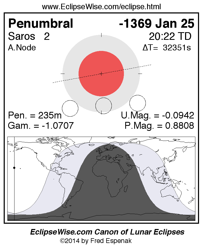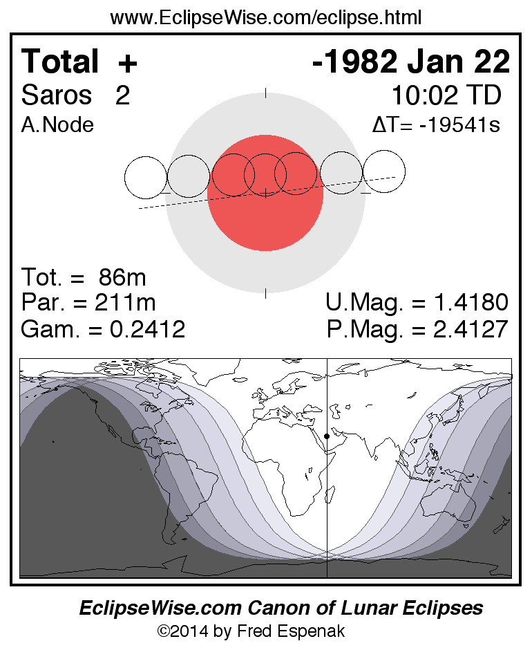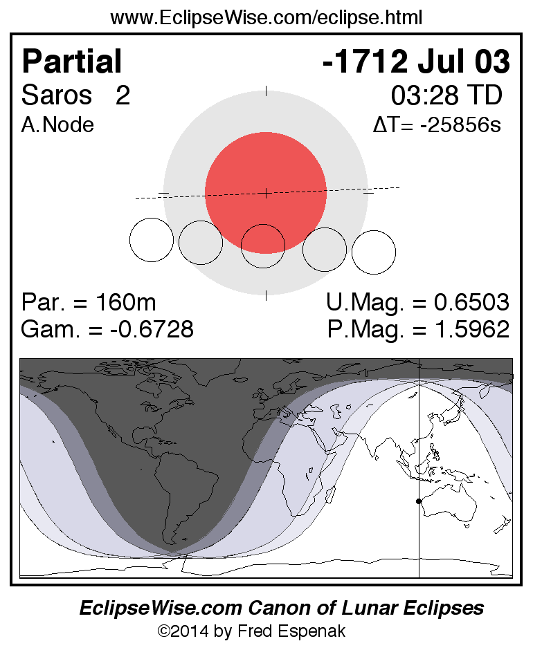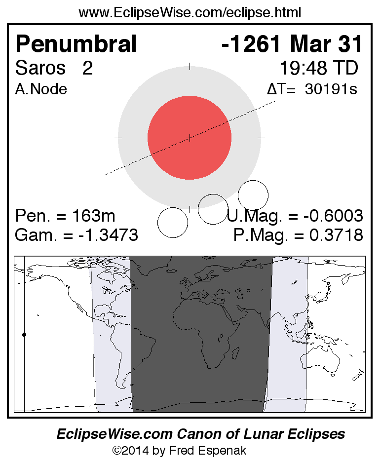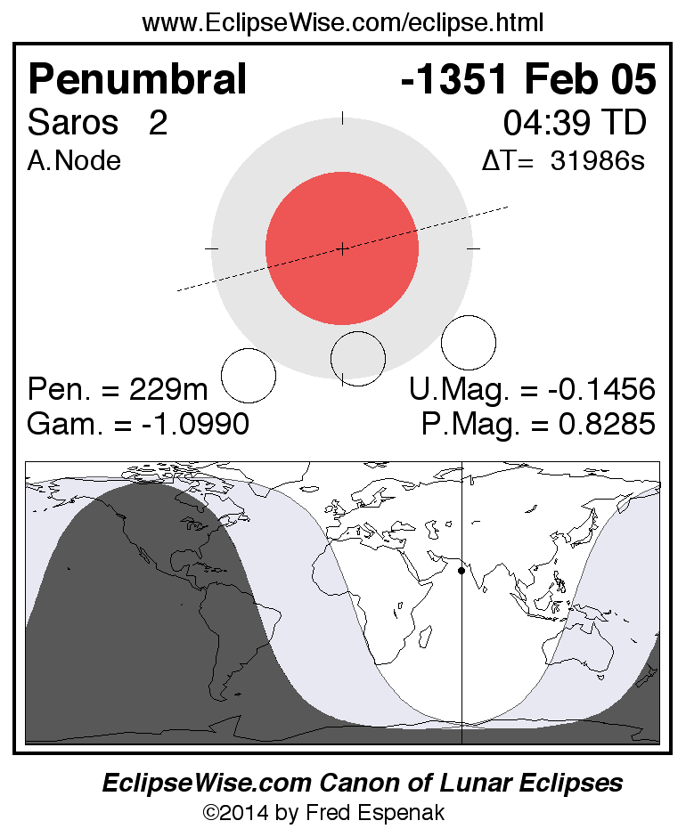 A panorama of all lunar eclipses belonging to Saros 2 is presented here. Each figure shows the Moon's path with respect to Earth's penumbral and umbral shadows. Below the path is a map depicting the geographic region of visibility for the eclipse. The date and time are given for the instant of Greatest Eclipse. Every figure serves as a hyperlink to the EclipseWise Prime page for that eclipse with a larger figure and complete details for the eclipse. Visit the Key to Lunar Eclipse Figures for a detailed explanation of these diagrams. Near the bottom of this page are a series of hyperlinks for more on lunar eclipses.