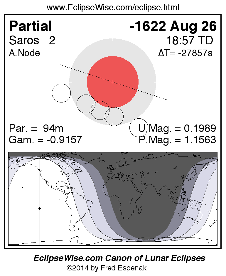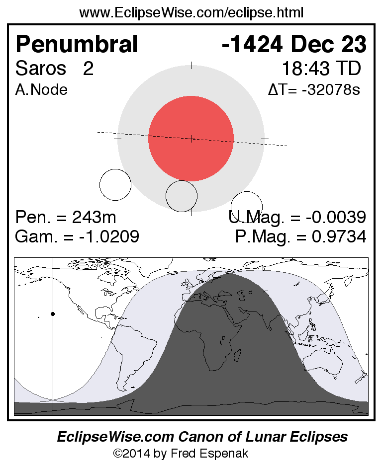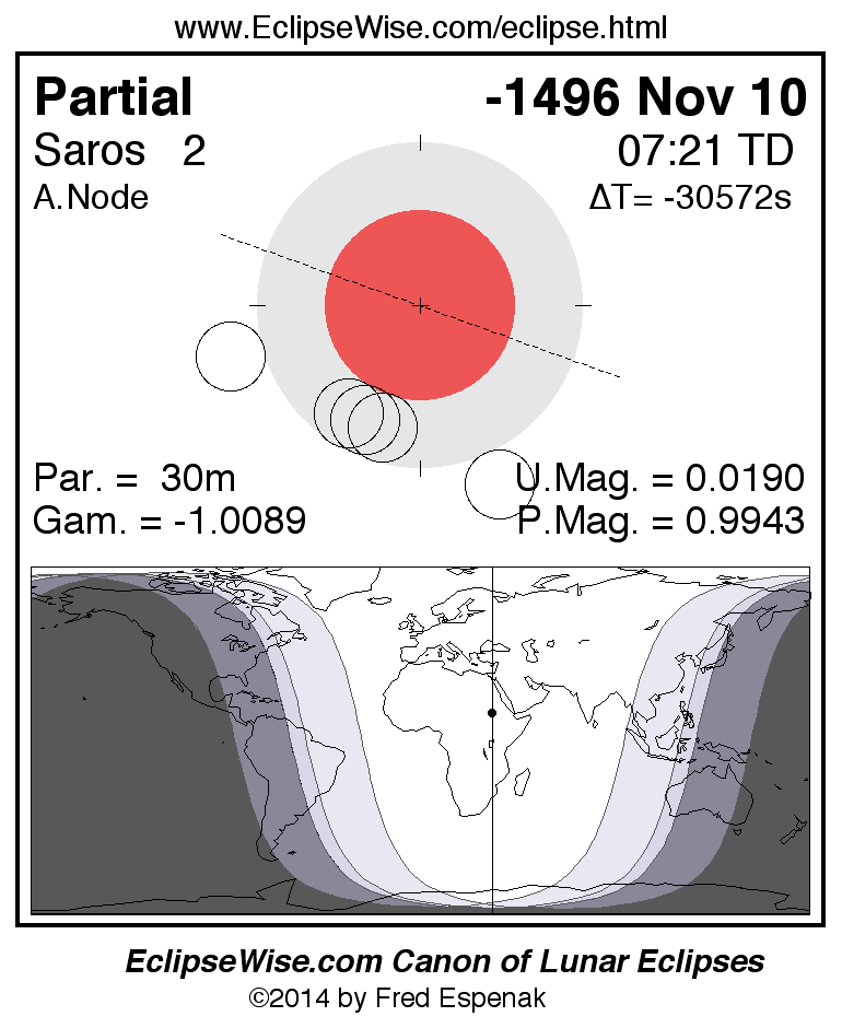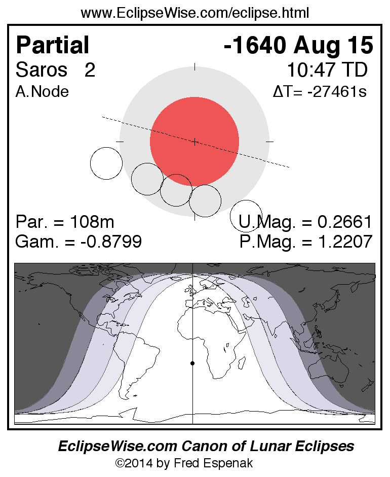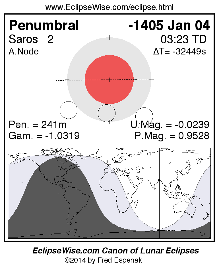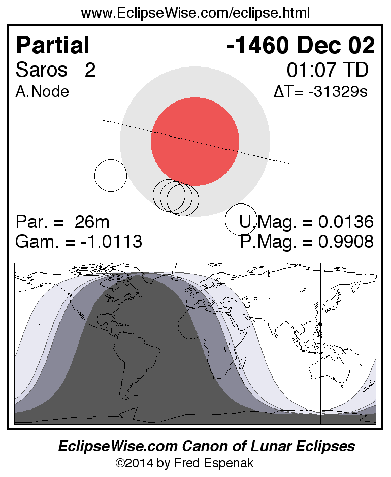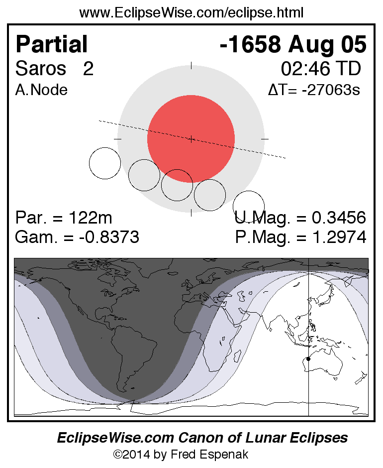 A panorama of all lunar eclipses belonging to Saros 2 is presented here. Each figure shows the Moon's path with respect to Earth's penumbral and umbral shadows. Below the path is a map depicting the geographic region of visibility for the eclipse. The date and time are given for the instant of Greatest Eclipse. Every figure serves as a hyperlink to the EclipseWise Prime page for that eclipse with a larger figure and complete details for the eclipse. Visit the Key to Lunar Eclipse Figures for a detailed explanation of these diagrams. Near the bottom of this page are a series of hyperlinks for more on lunar eclipses.