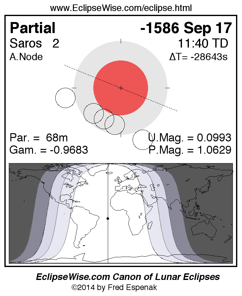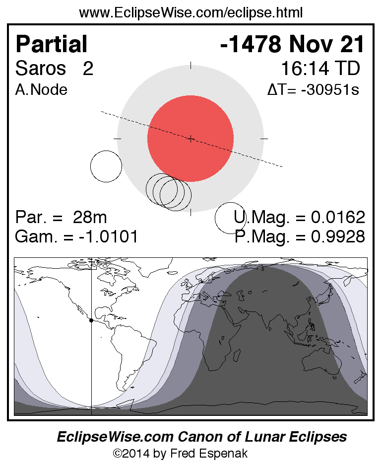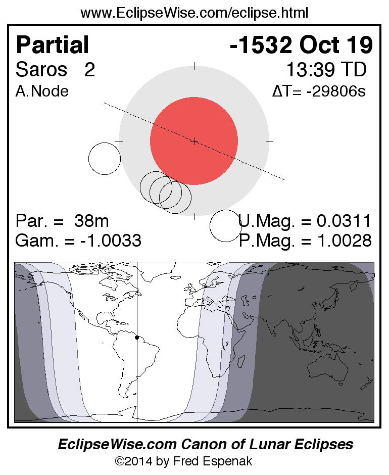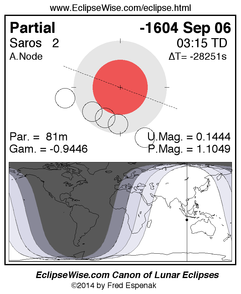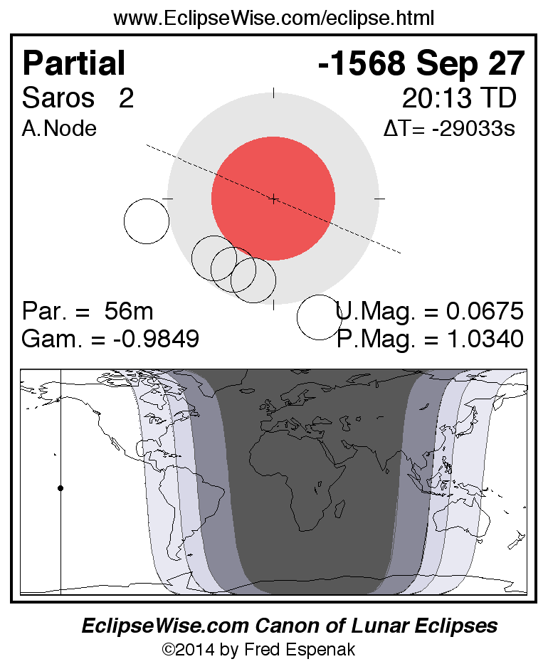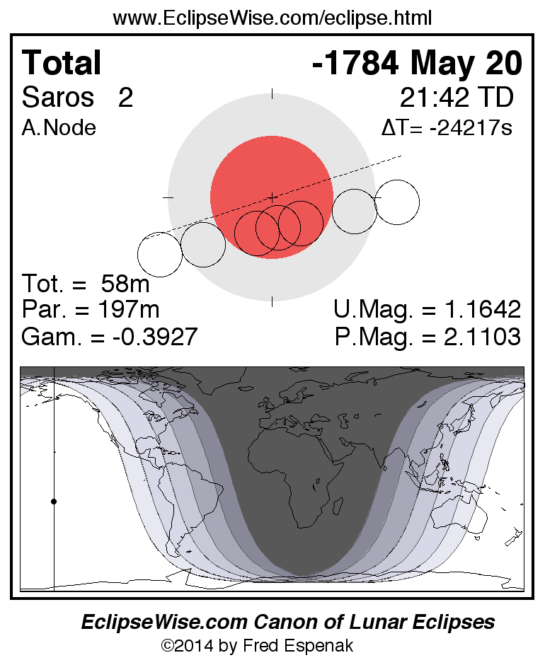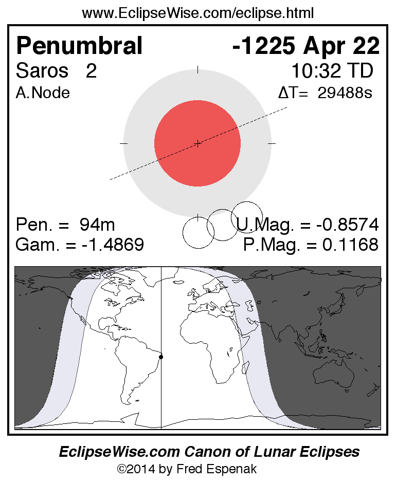 A panorama of all lunar eclipses belonging to Saros 2 is presented here. Each figure shows the Moon's path with respect to Earth's penumbral and umbral shadows. Below the path is a map depicting the geographic region of visibility for the eclipse. The date and time are given for the instant of Greatest Eclipse. Every figure serves as a hyperlink to the EclipseWise Prime page for that eclipse with a larger figure and complete details for the eclipse. Visit the Key to Lunar Eclipse Figures for a detailed explanation of these diagrams. Near the bottom of this page are a series of hyperlinks for more on lunar eclipses.