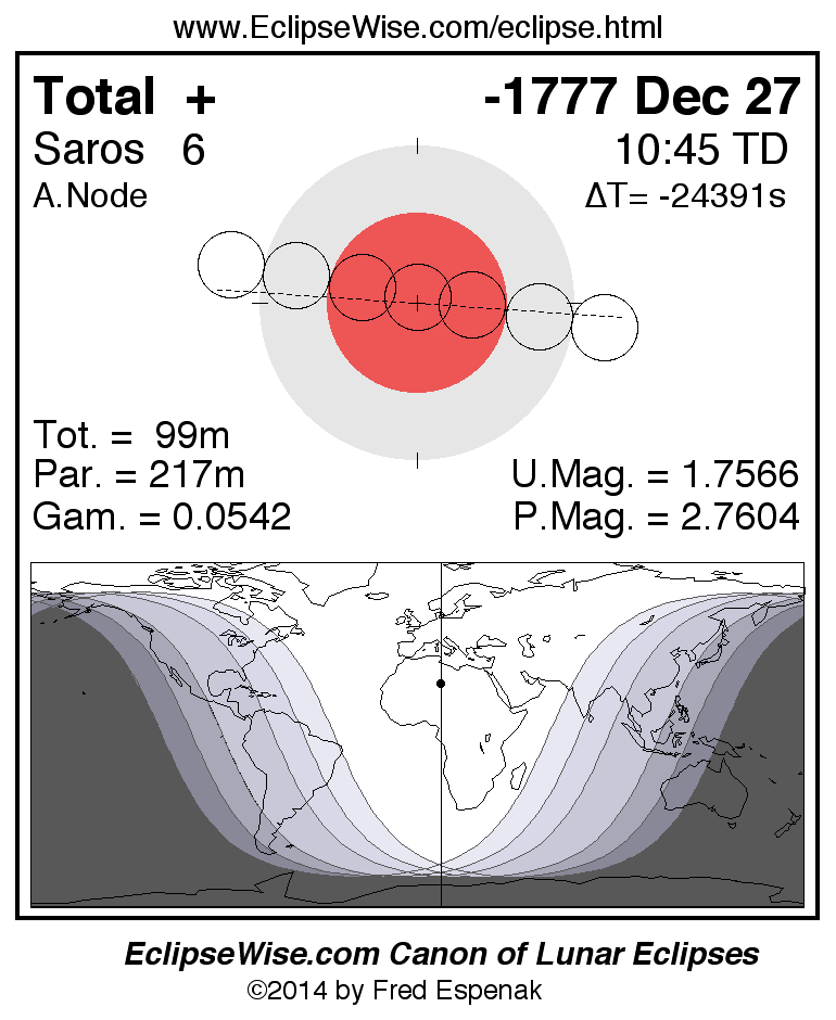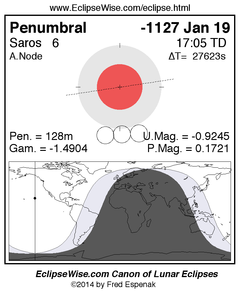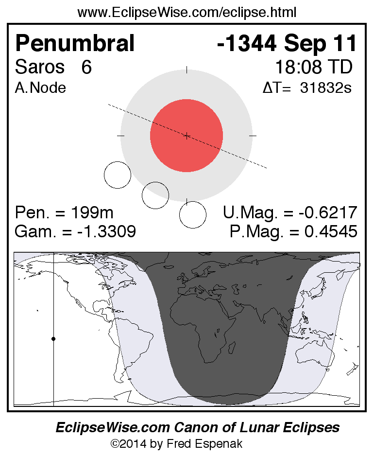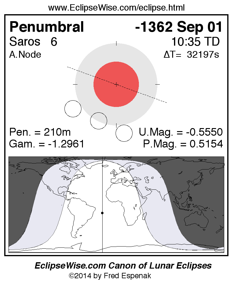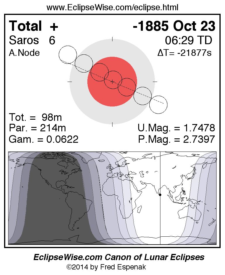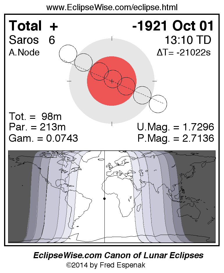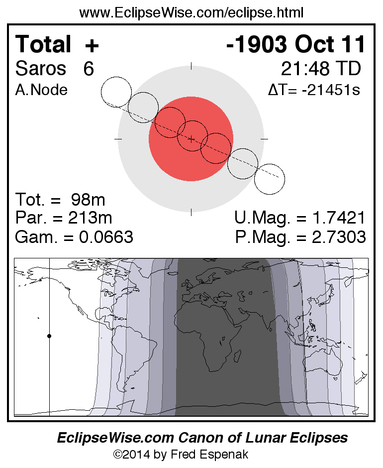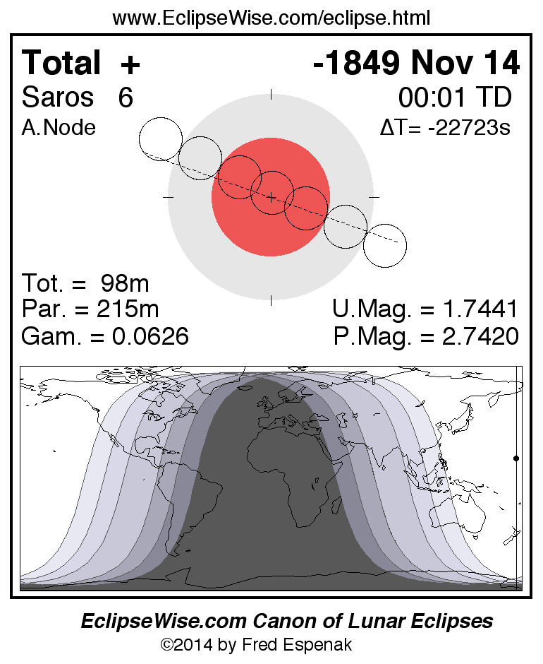 A panorama of all lunar eclipses belonging to Saros 6 is presented here. Each figure shows the Moon's path with respect to Earth's penumbral and umbral shadows. Below the path is a map depicting the geographic region of visibility for the eclipse. The date and time are given for the instant of Greatest Eclipse. Every figure serves as a hyperlink to the EclipseWise Prime page for that eclipse with a larger figure and complete details for the eclipse. Visit the Key to Lunar Eclipse Figures for a detailed explanation of these diagrams. Near the bottom of this page are a series of hyperlinks for more on lunar eclipses.