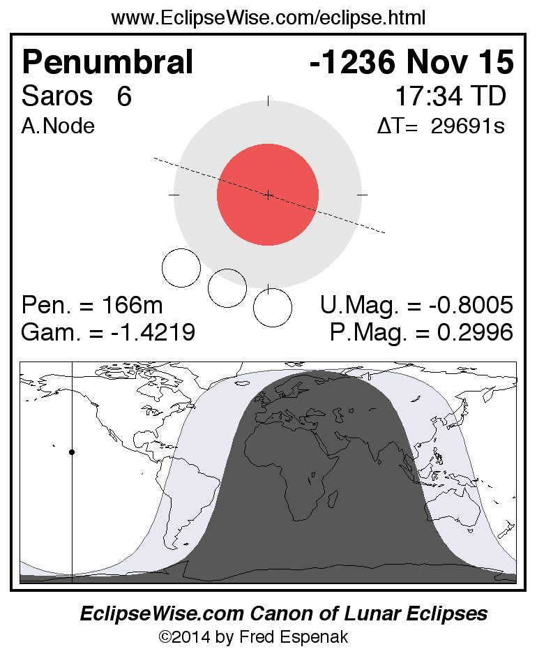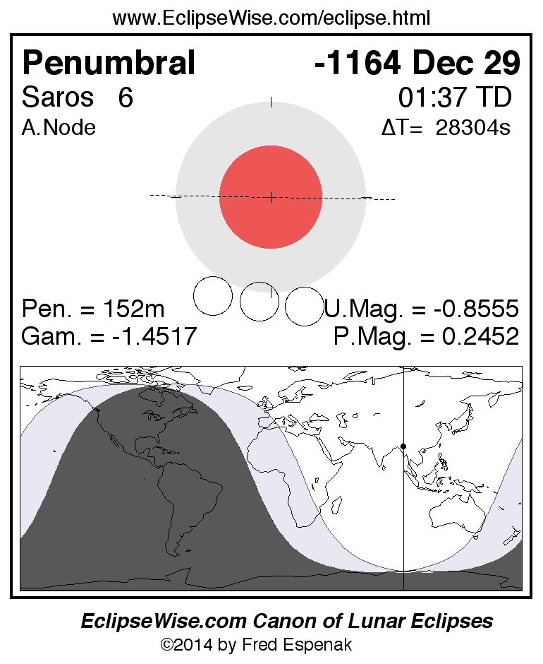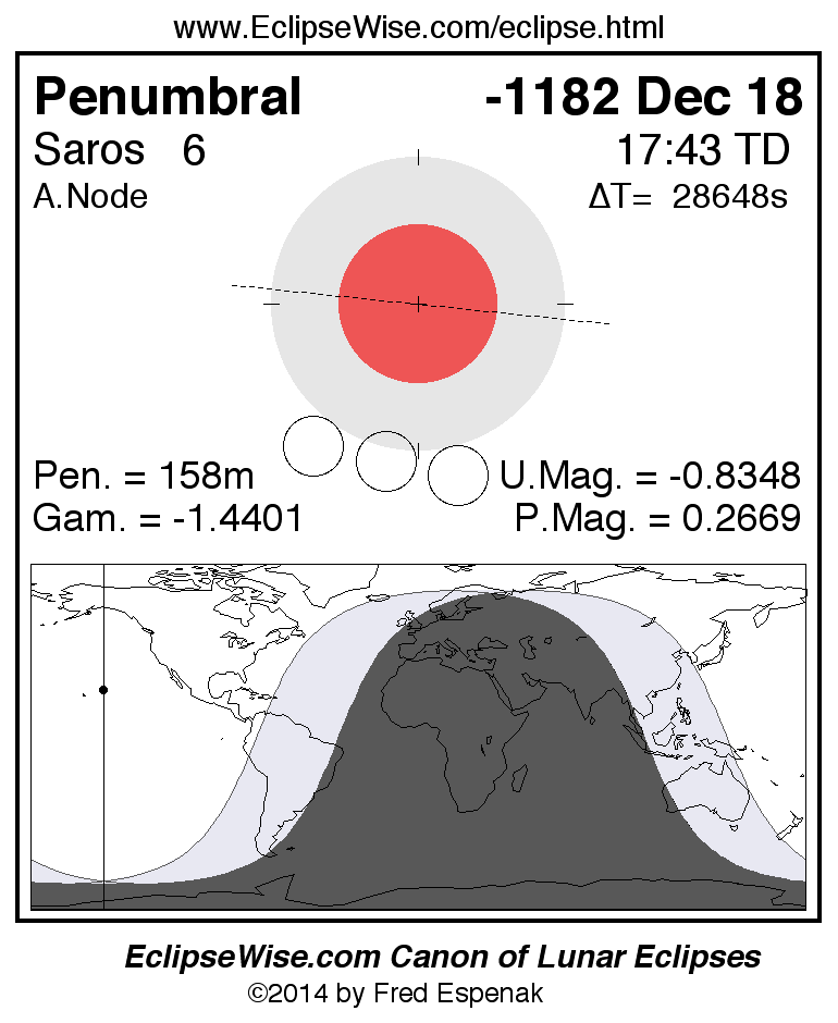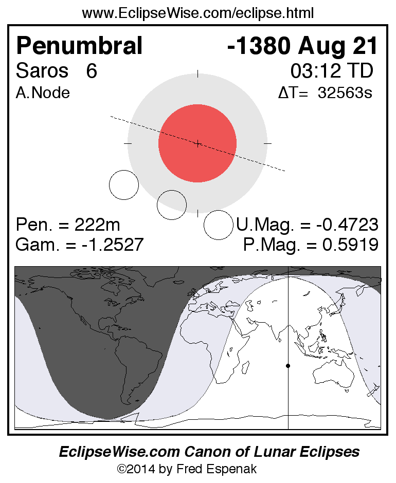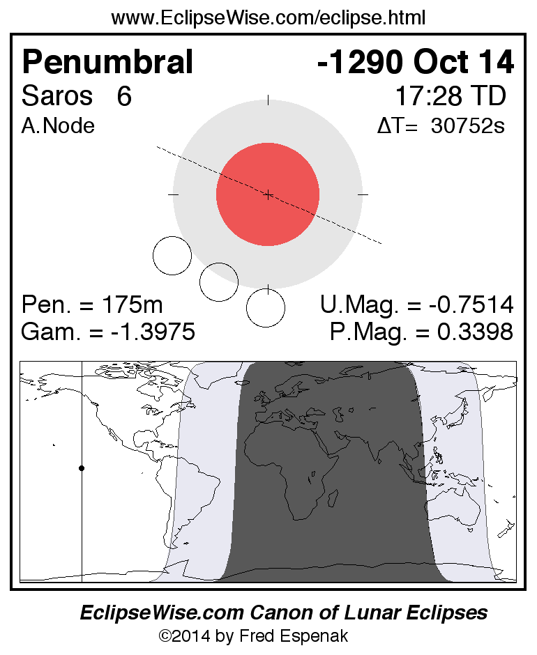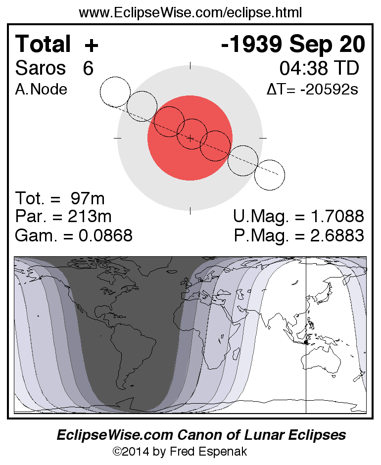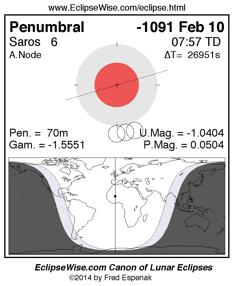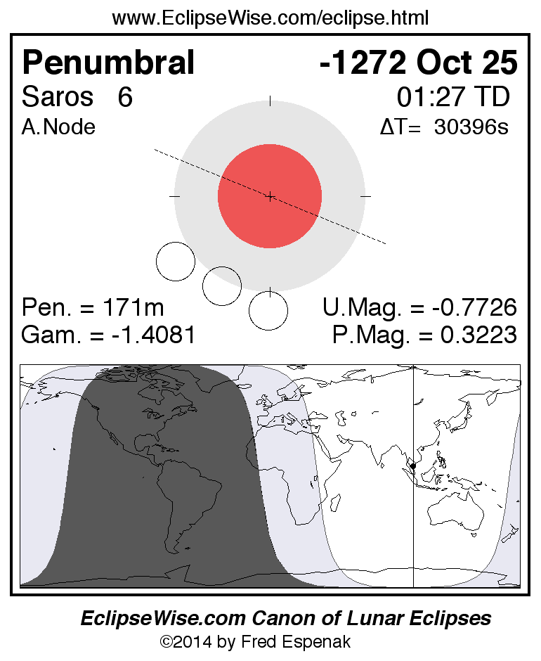 A panorama of all lunar eclipses belonging to Saros 6 is presented here. Each figure shows the Moon's path with respect to Earth's penumbral and umbral shadows. Below the path is a map depicting the geographic region of visibility for the eclipse. The date and time are given for the instant of Greatest Eclipse. Every figure serves as a hyperlink to the EclipseWise Prime page for that eclipse with a larger figure and complete details for the eclipse. Visit the Key to Lunar Eclipse Figures for a detailed explanation of these diagrams. Near the bottom of this page are a series of hyperlinks for more on lunar eclipses.