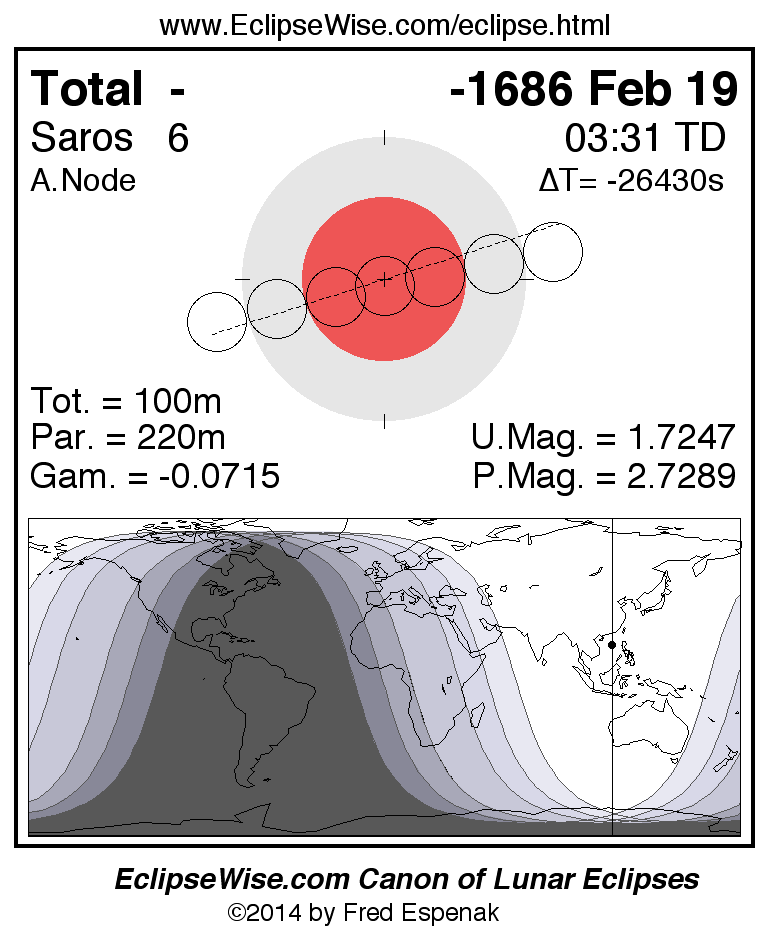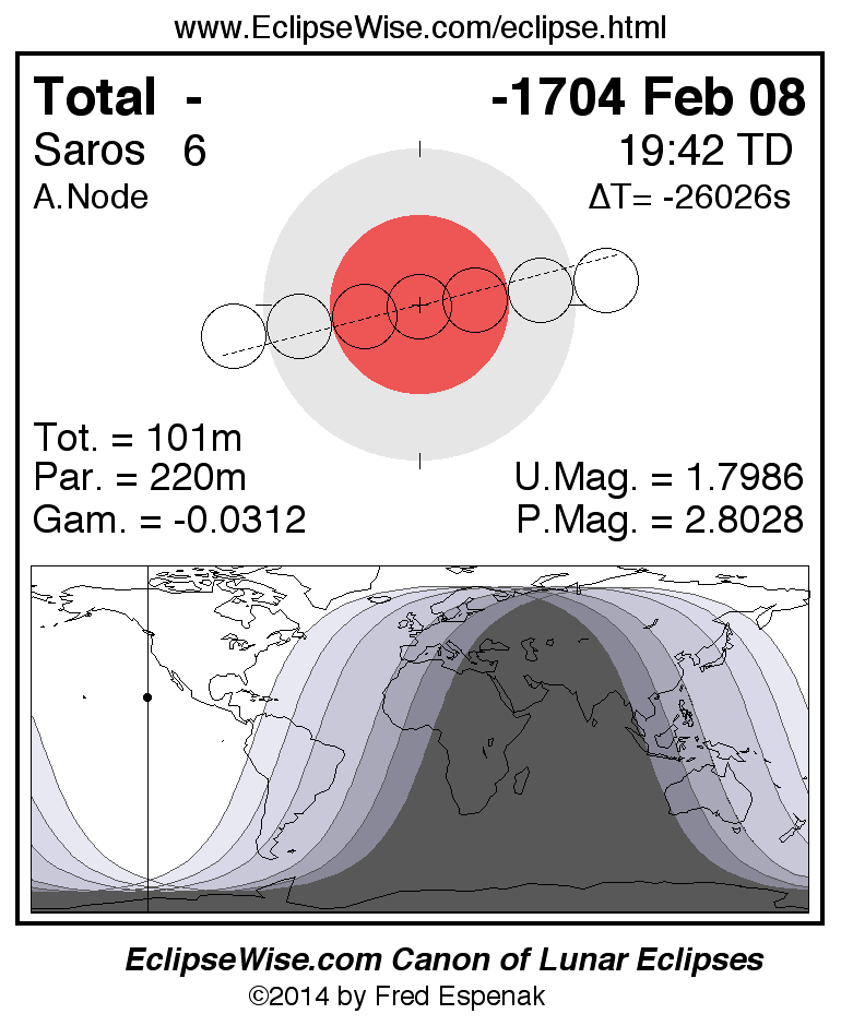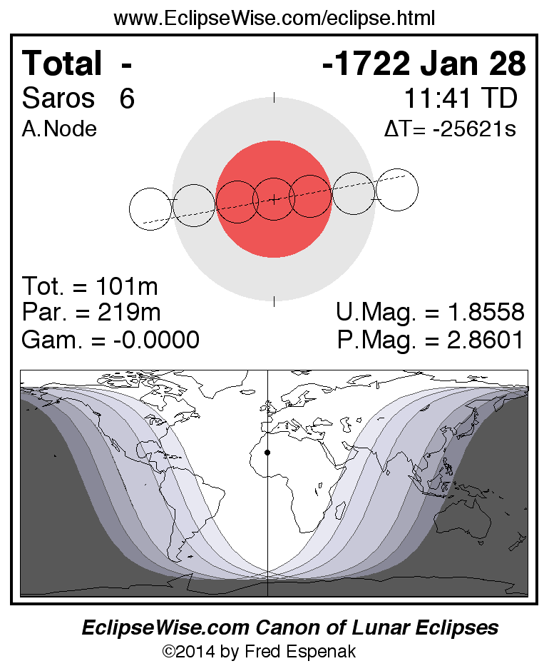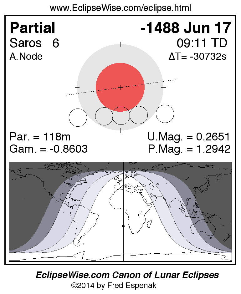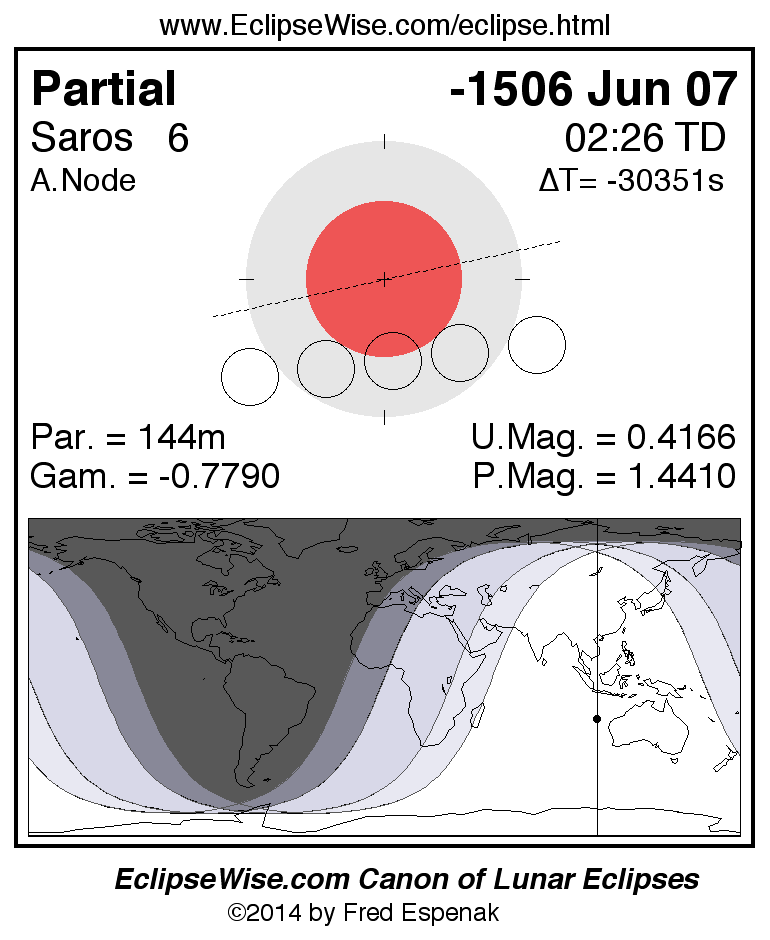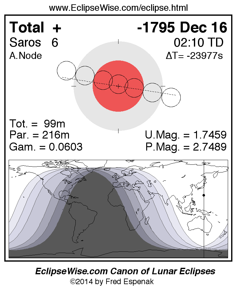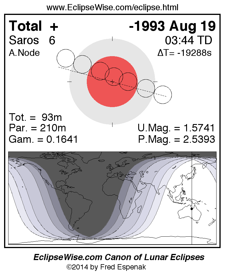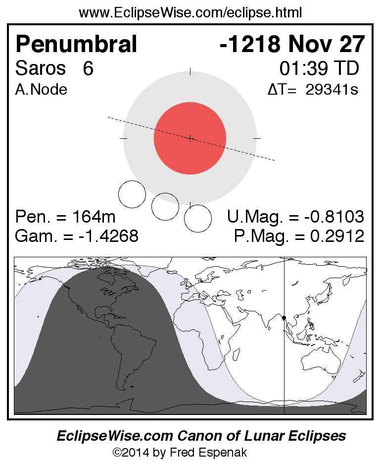 A panorama of all lunar eclipses belonging to Saros 6 is presented here. Each figure shows the Moon's path with respect to Earth's penumbral and umbral shadows. Below the path is a map depicting the geographic region of visibility for the eclipse. The date and time are given for the instant of Greatest Eclipse. Every figure serves as a hyperlink to the EclipseWise Prime page for that eclipse with a larger figure and complete details for the eclipse. Visit the Key to Lunar Eclipse Figures for a detailed explanation of these diagrams. Near the bottom of this page are a series of hyperlinks for more on lunar eclipses.