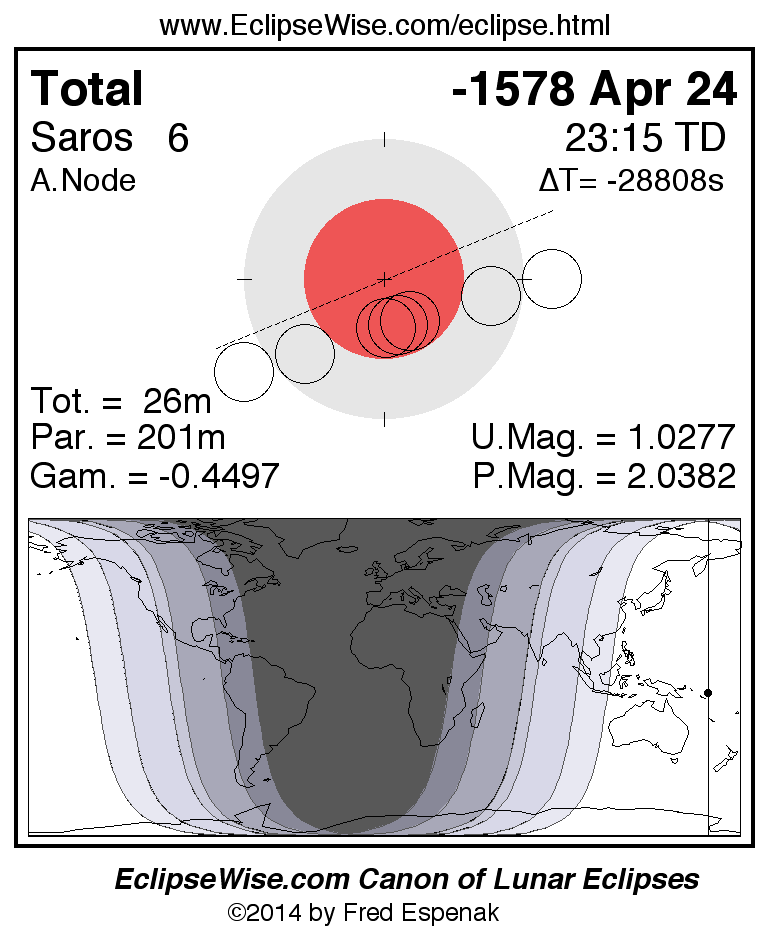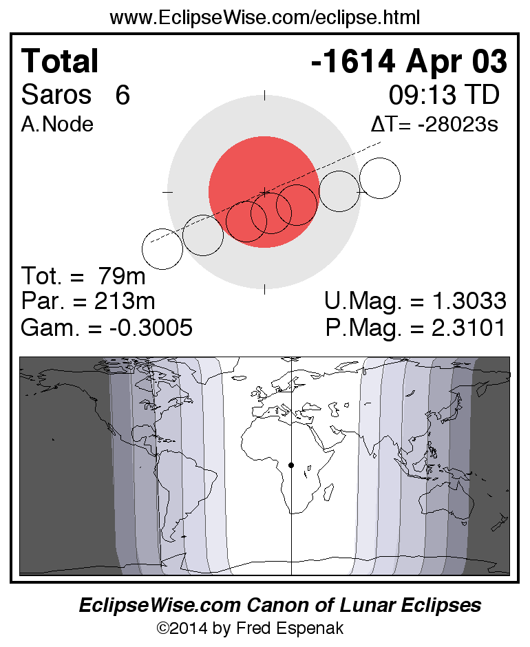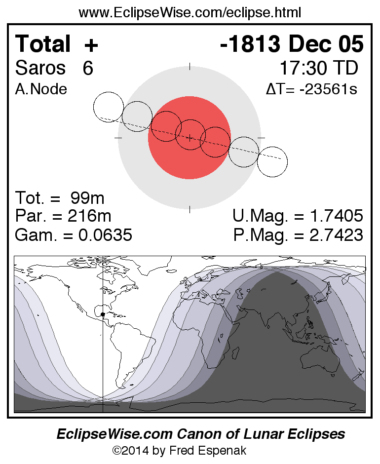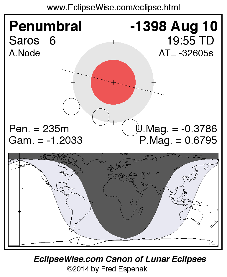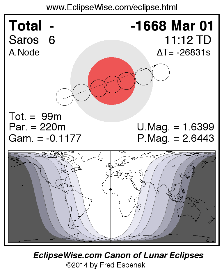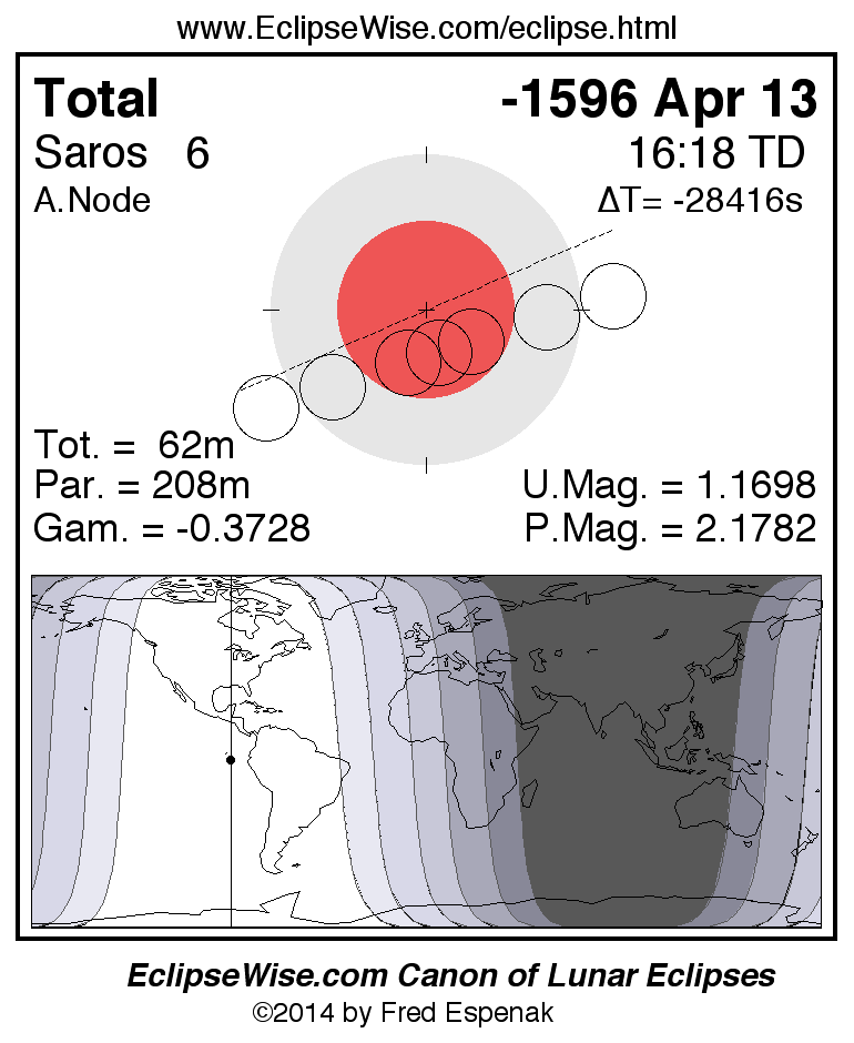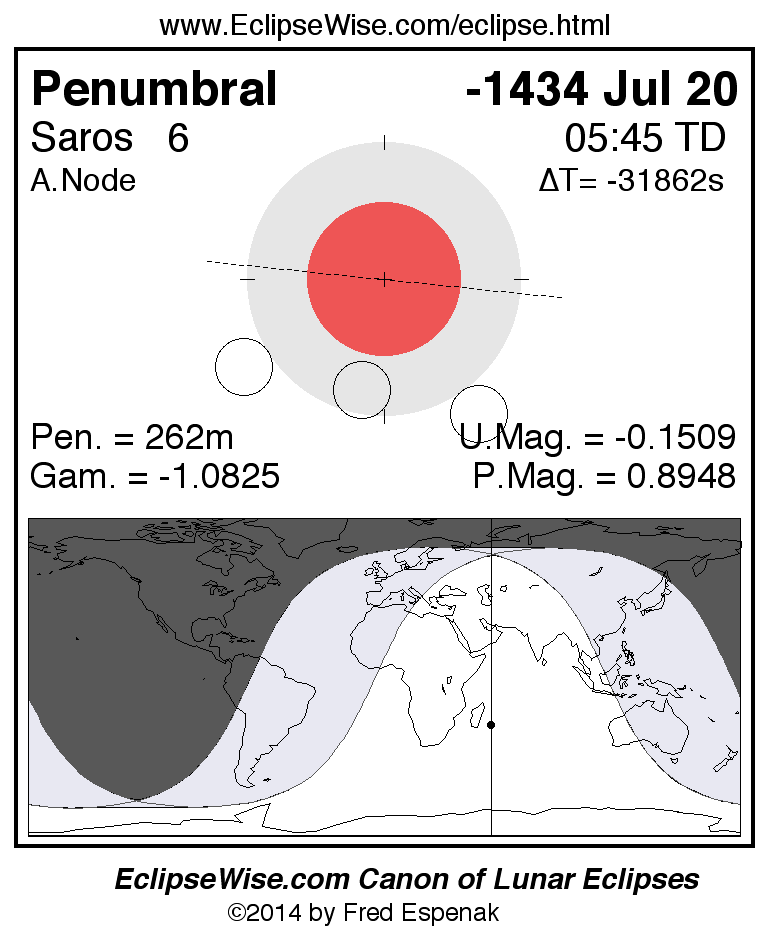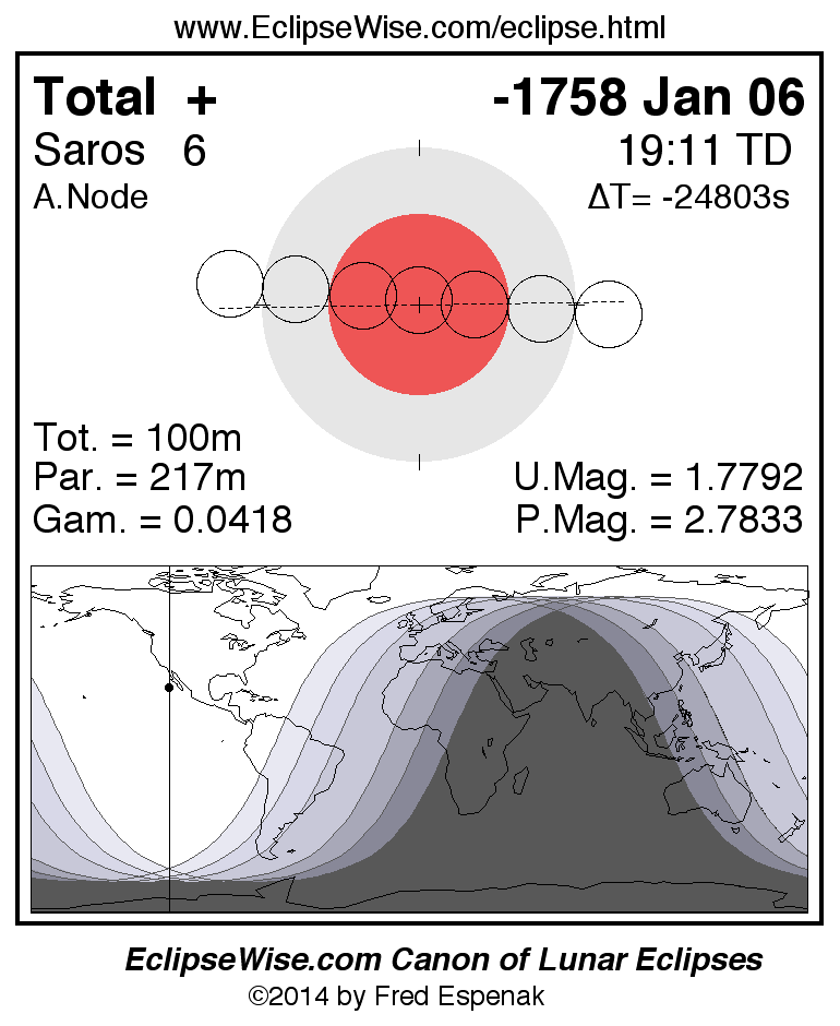 A panorama of all lunar eclipses belonging to Saros 6 is presented here. Each figure shows the Moon's path with respect to Earth's penumbral and umbral shadows. Below the path is a map depicting the geographic region of visibility for the eclipse. The date and time are given for the instant of Greatest Eclipse. Every figure serves as a hyperlink to the EclipseWise Prime page for that eclipse with a larger figure and complete details for the eclipse. Visit the Key to Lunar Eclipse Figures for a detailed explanation of these diagrams. Near the bottom of this page are a series of hyperlinks for more on lunar eclipses.