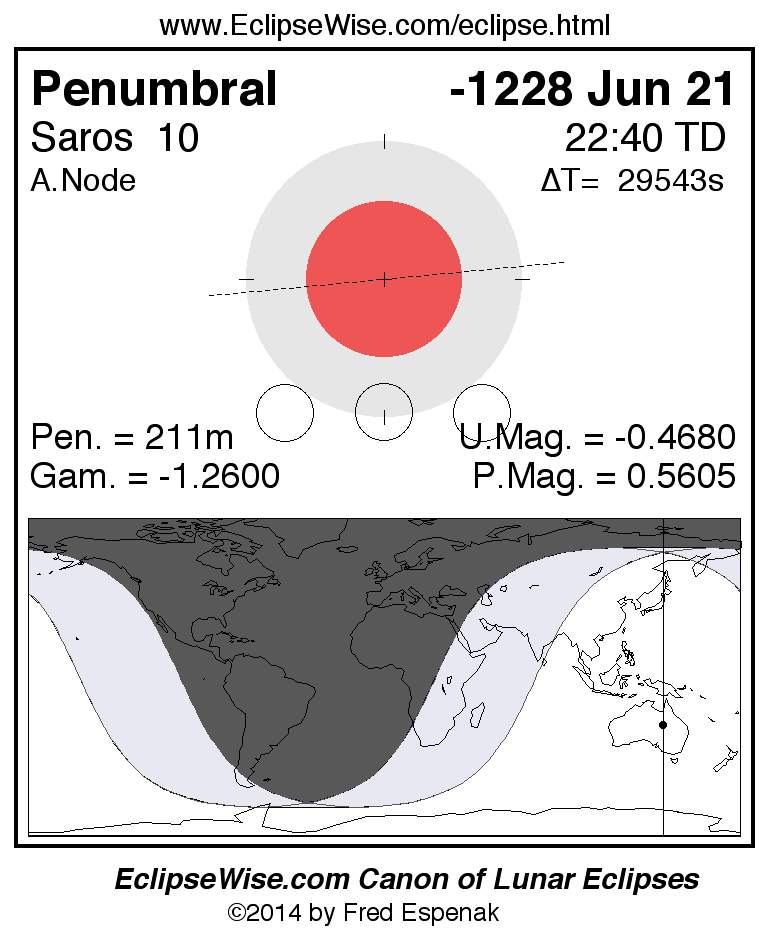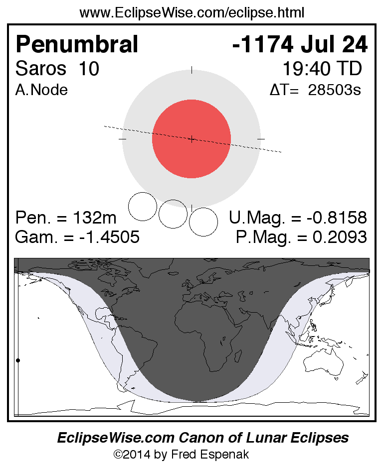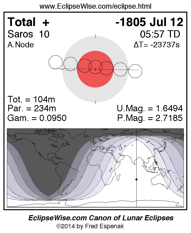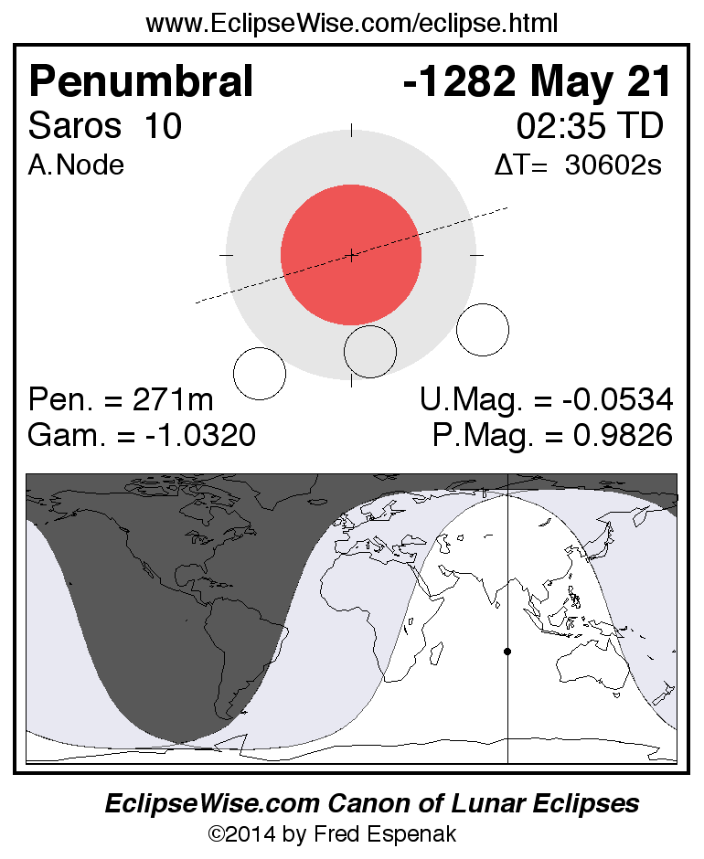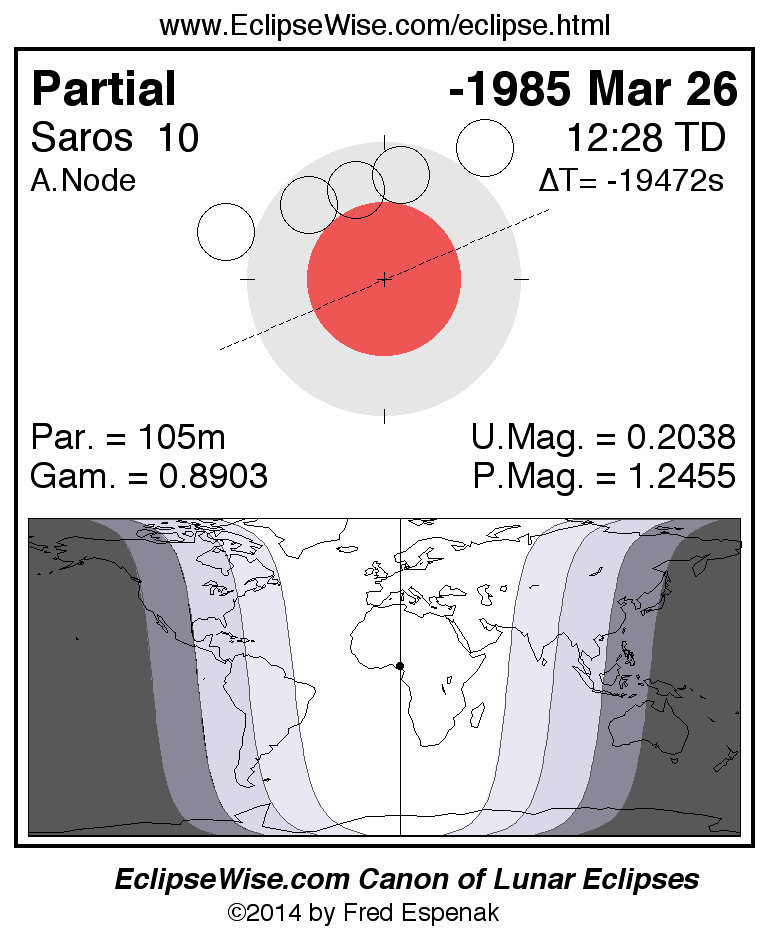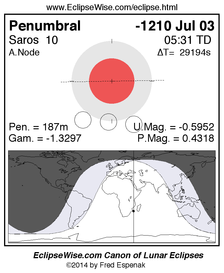 A panorama of all lunar eclipses belonging to Saros 10 is presented here. Each figure shows the Moon's path with respect to Earth's penumbral and umbral shadows. Below the path is a map depicting the geographic region of visibility for the eclipse. The date and time are given for the instant of Greatest Eclipse. Every figure serves as a hyperlink to the EclipseWise Prime page for that eclipse with a larger figure and complete details for the eclipse. Visit the Key to Lunar Eclipse Figures for a detailed explanation of these diagrams. Near the bottom of this page are a series of hyperlinks for more on lunar eclipses.