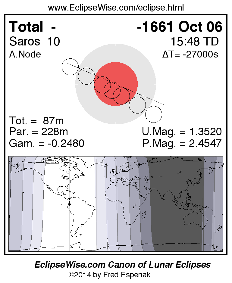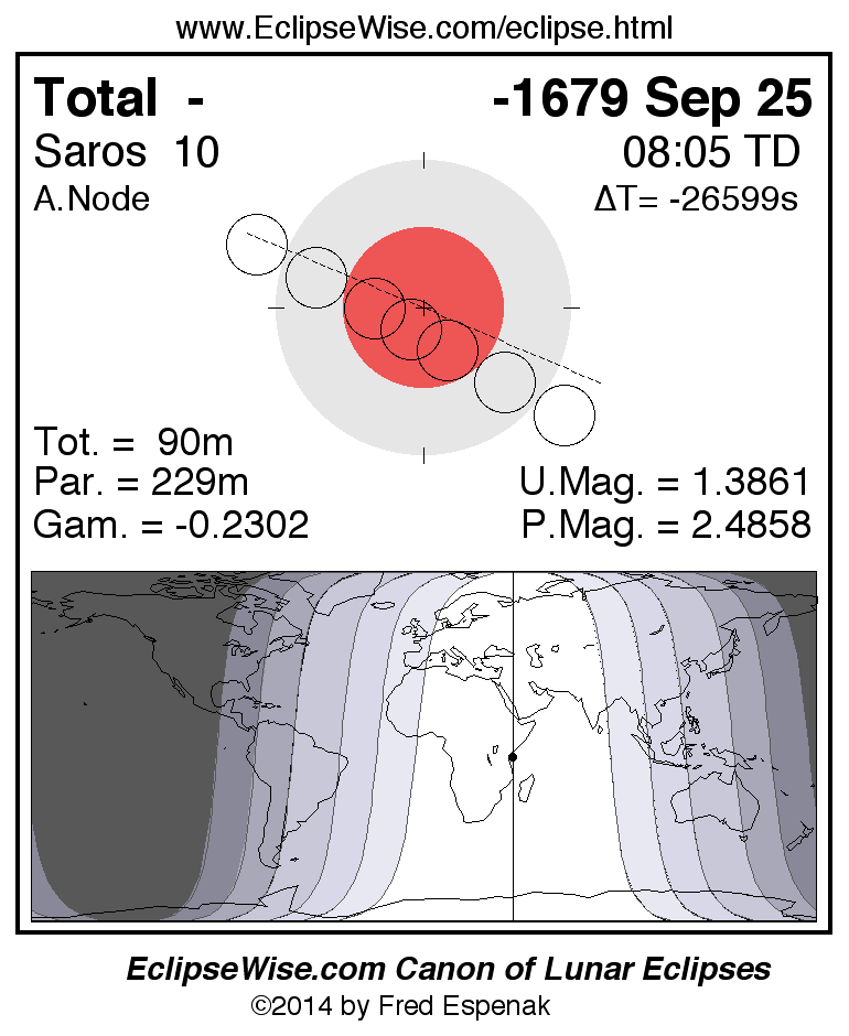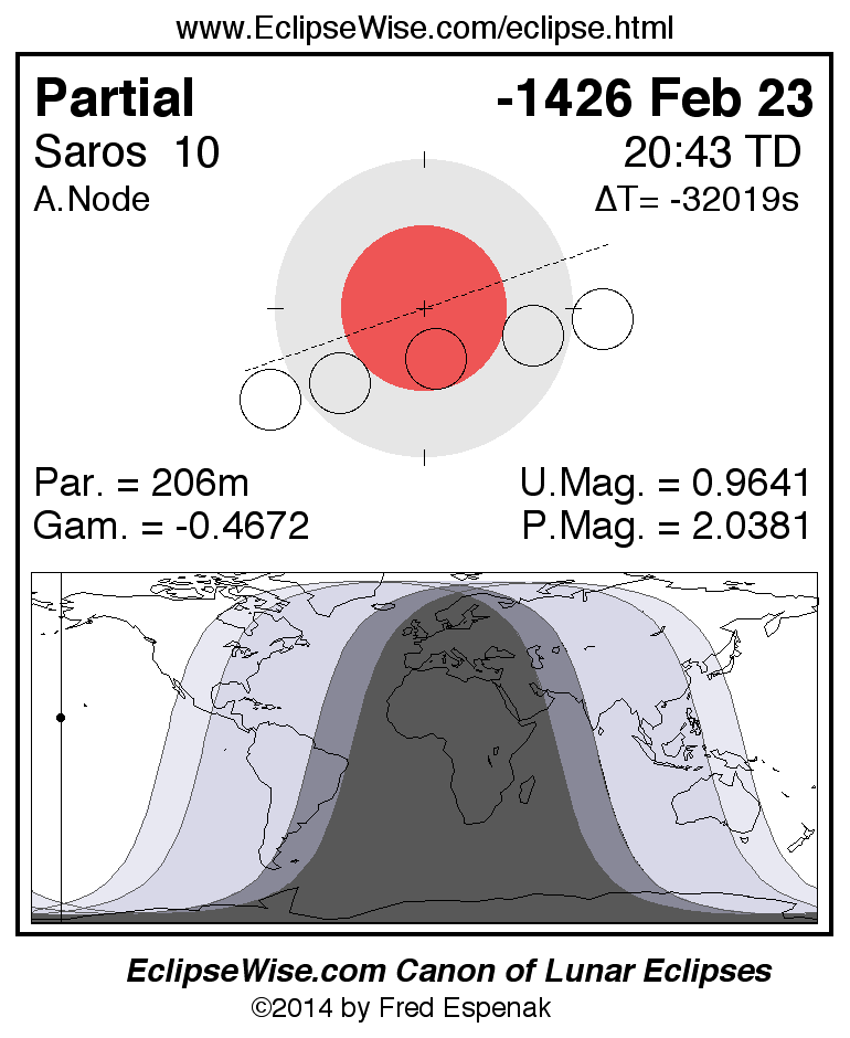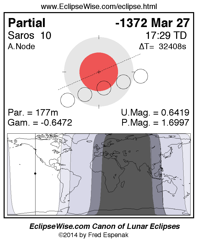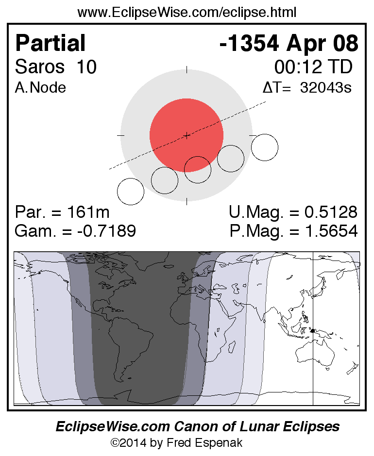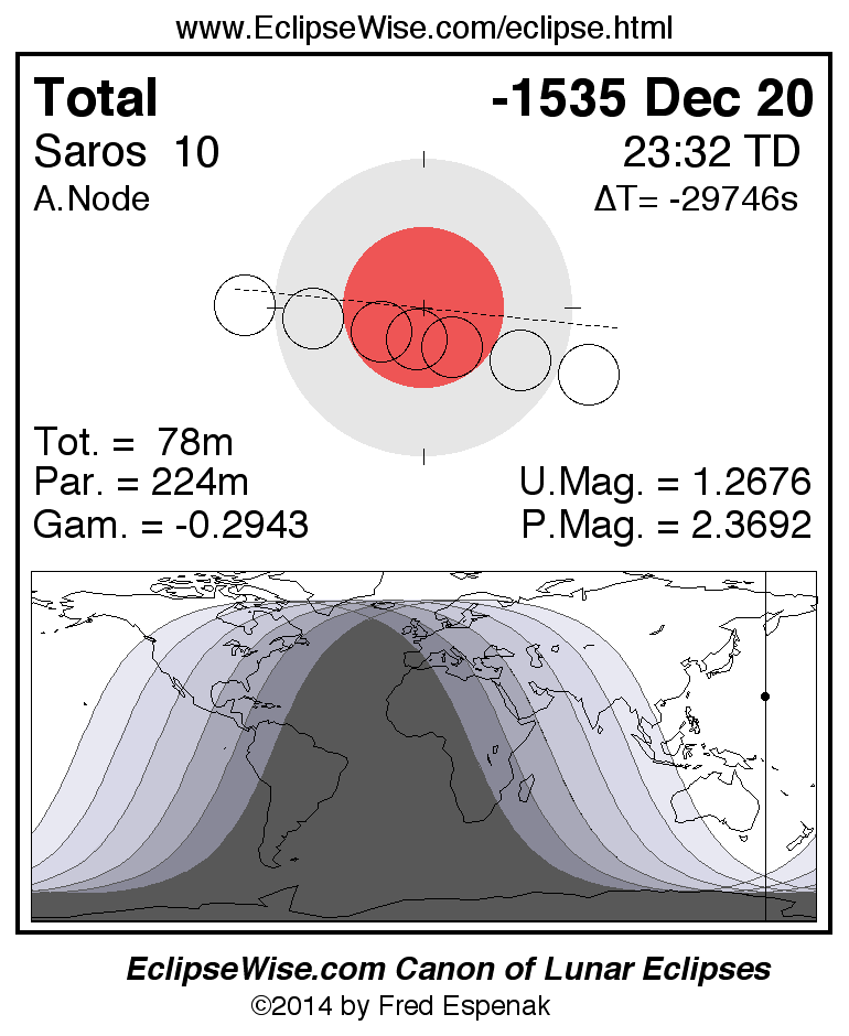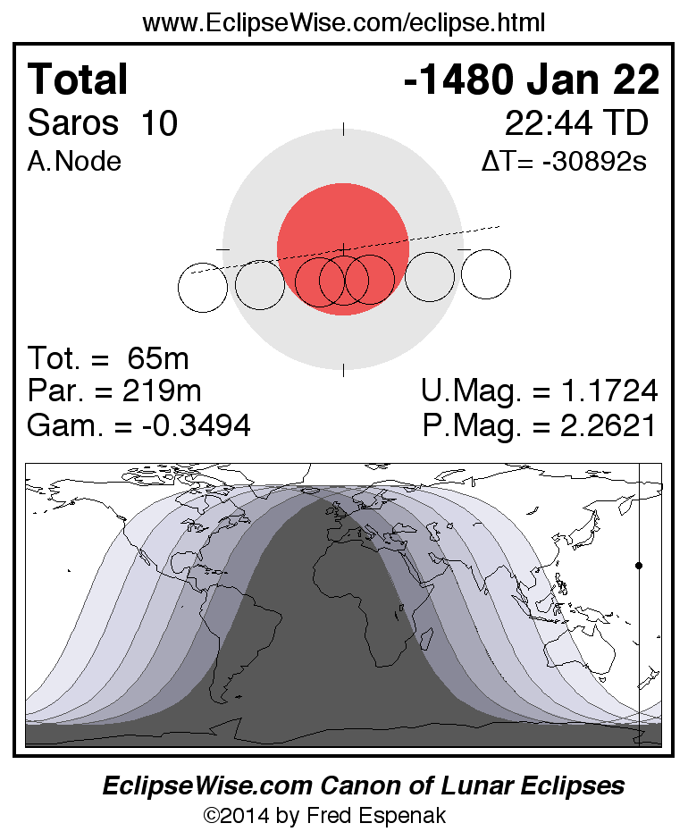 A panorama of all lunar eclipses belonging to Saros 10 is presented here. Each figure shows the Moon's path with respect to Earth's penumbral and umbral shadows. Below the path is a map depicting the geographic region of visibility for the eclipse. The date and time are given for the instant of Greatest Eclipse. Every figure serves as a hyperlink to the EclipseWise Prime page for that eclipse with a larger figure and complete details for the eclipse. Visit the Key to Lunar Eclipse Figures for a detailed explanation of these diagrams. Near the bottom of this page are a series of hyperlinks for more on lunar eclipses.