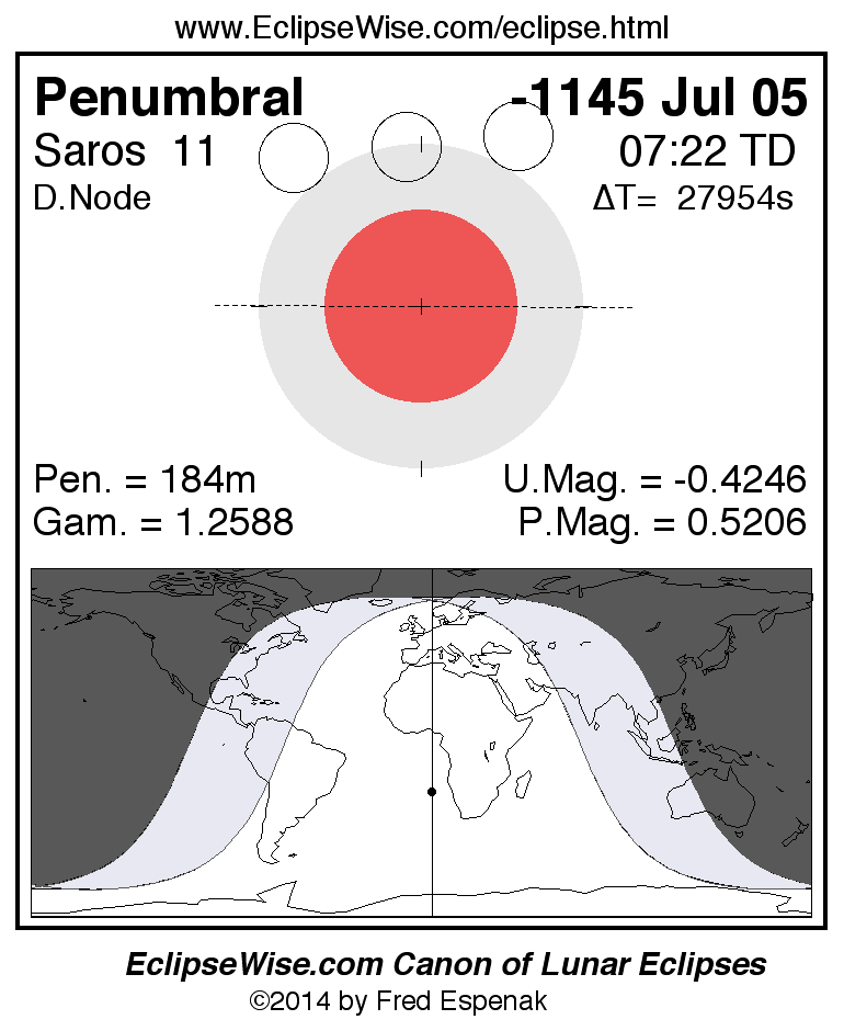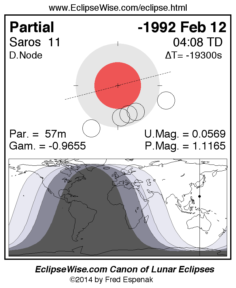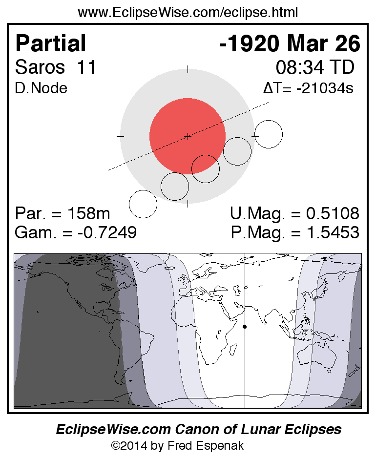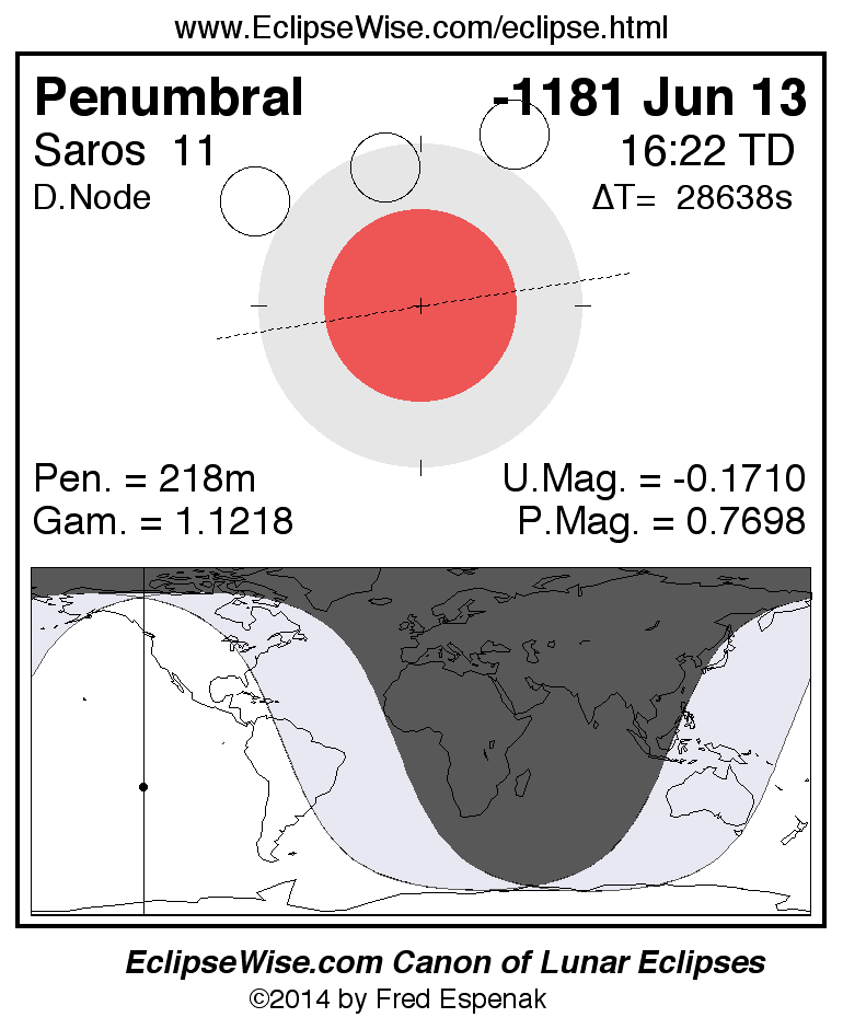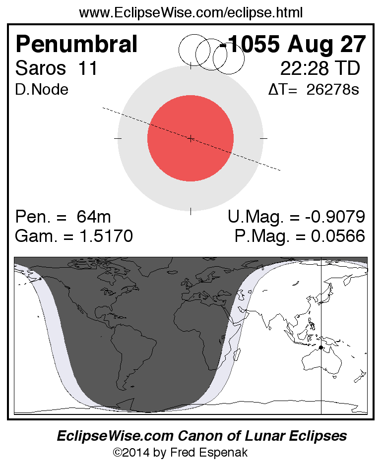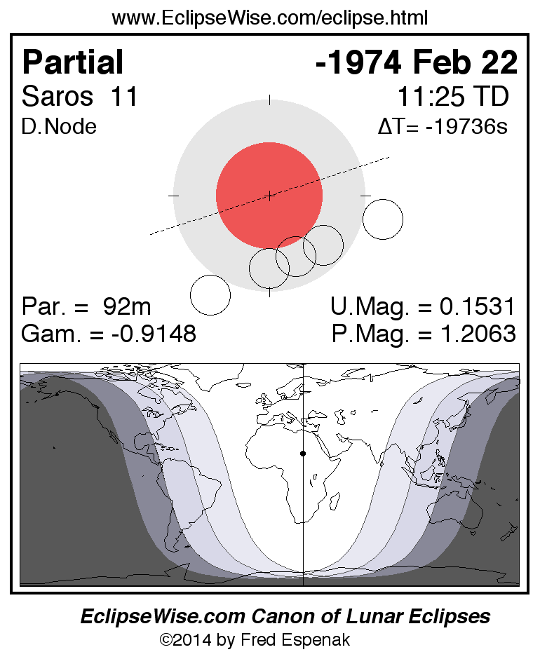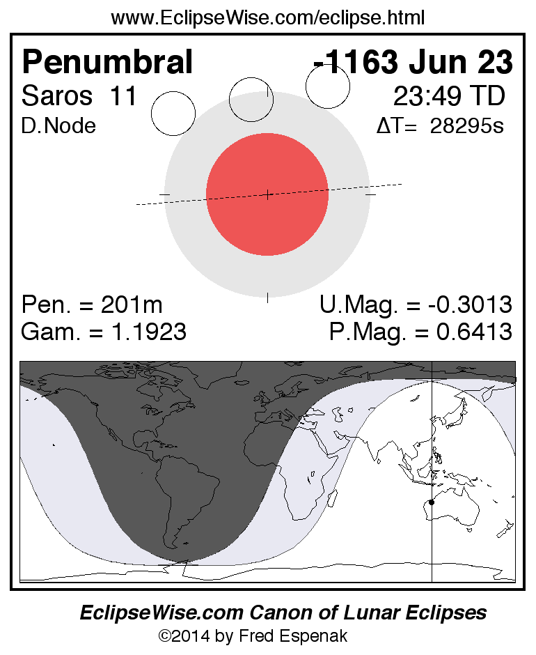 A panorama of all lunar eclipses belonging to Saros 11 is presented here. Each figure shows the Moon's path with respect to Earth's penumbral and umbral shadows. Below the path is a map depicting the geographic region of visibility for the eclipse. The date and time are given for the instant of Greatest Eclipse. Every figure serves as a hyperlink to the EclipseWise Prime page for that eclipse with a larger figure and complete details for the eclipse. Visit the Key to Lunar Eclipse Figures for a detailed explanation of these diagrams. Near the bottom of this page are a series of hyperlinks for more on lunar eclipses.