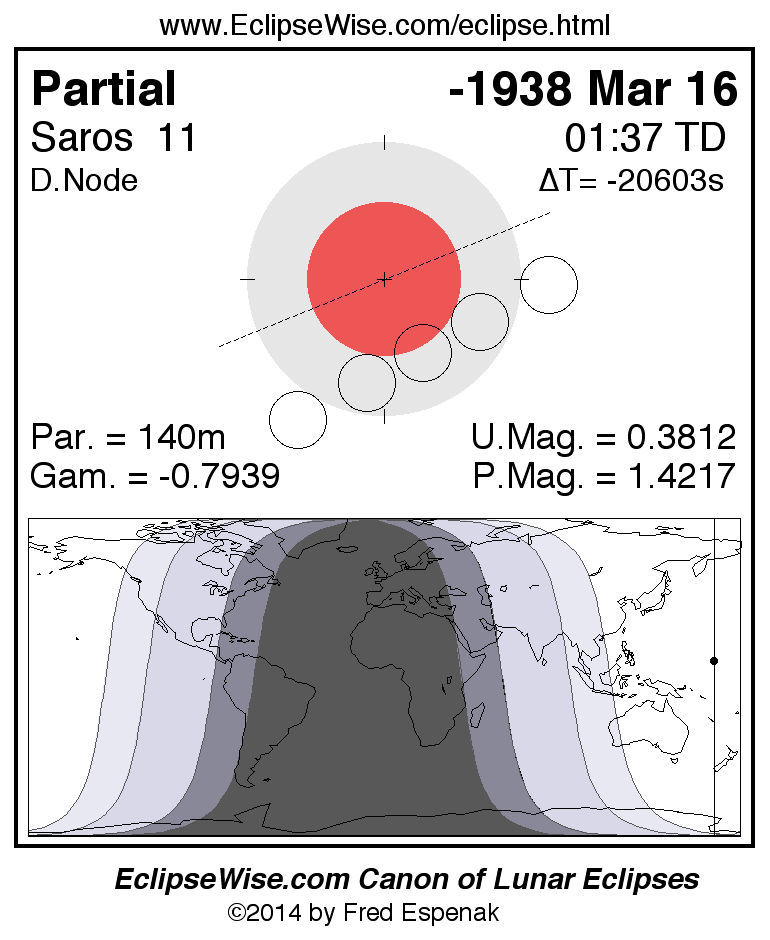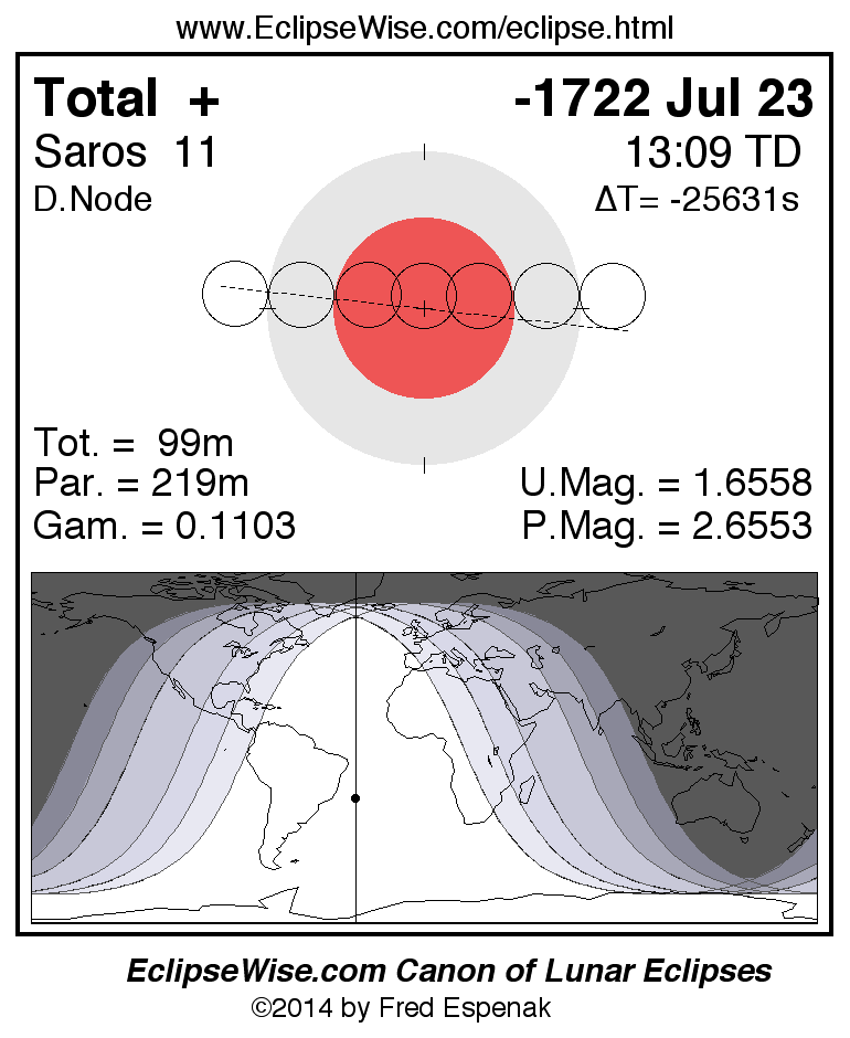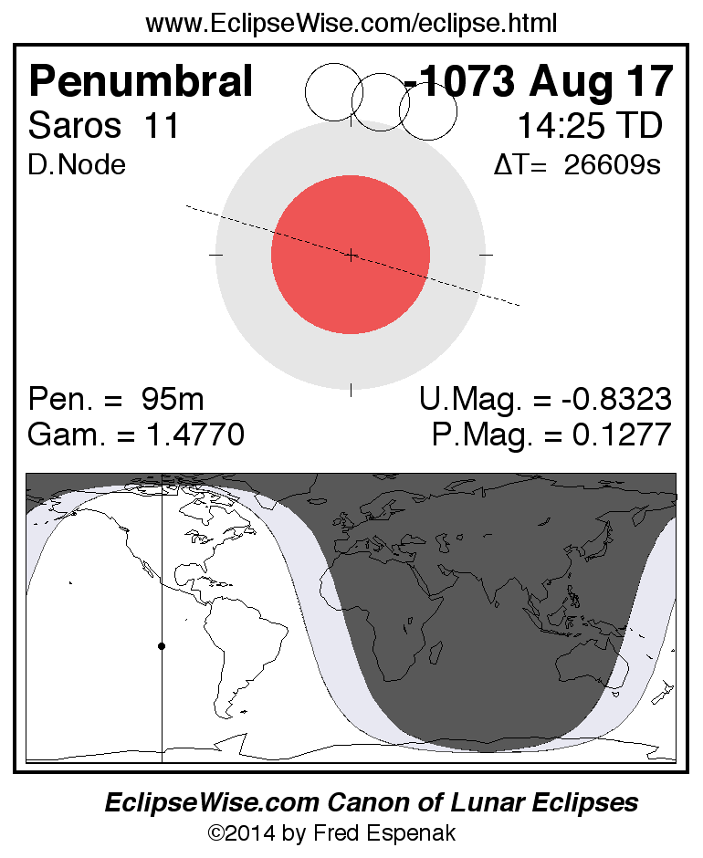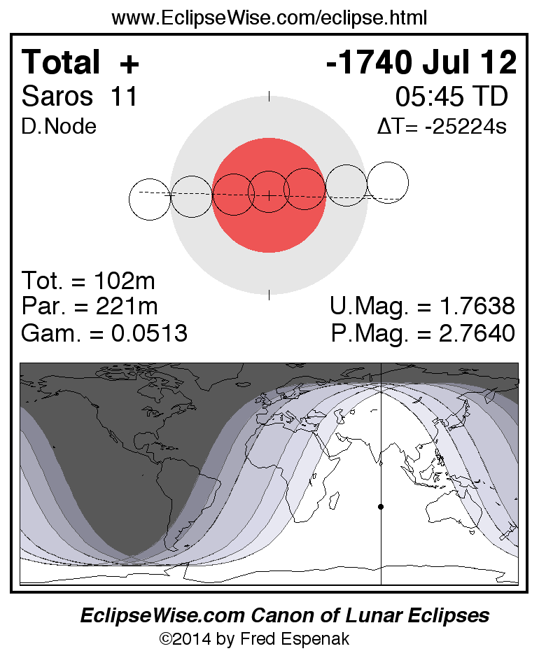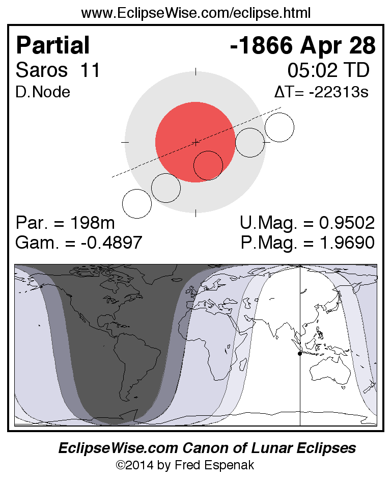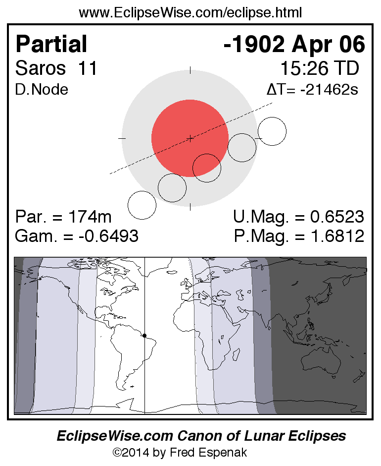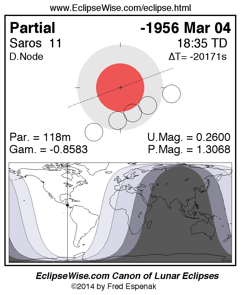 A panorama of all lunar eclipses belonging to Saros 11 is presented here. Each figure shows the Moon's path with respect to Earth's penumbral and umbral shadows. Below the path is a map depicting the geographic region of visibility for the eclipse. The date and time are given for the instant of Greatest Eclipse. Every figure serves as a hyperlink to the EclipseWise Prime page for that eclipse with a larger figure and complete details for the eclipse. Visit the Key to Lunar Eclipse Figures for a detailed explanation of these diagrams. Near the bottom of this page are a series of hyperlinks for more on lunar eclipses.