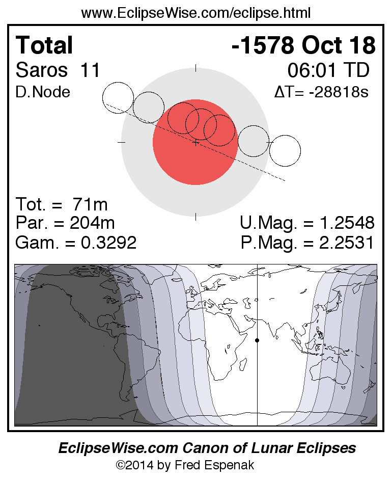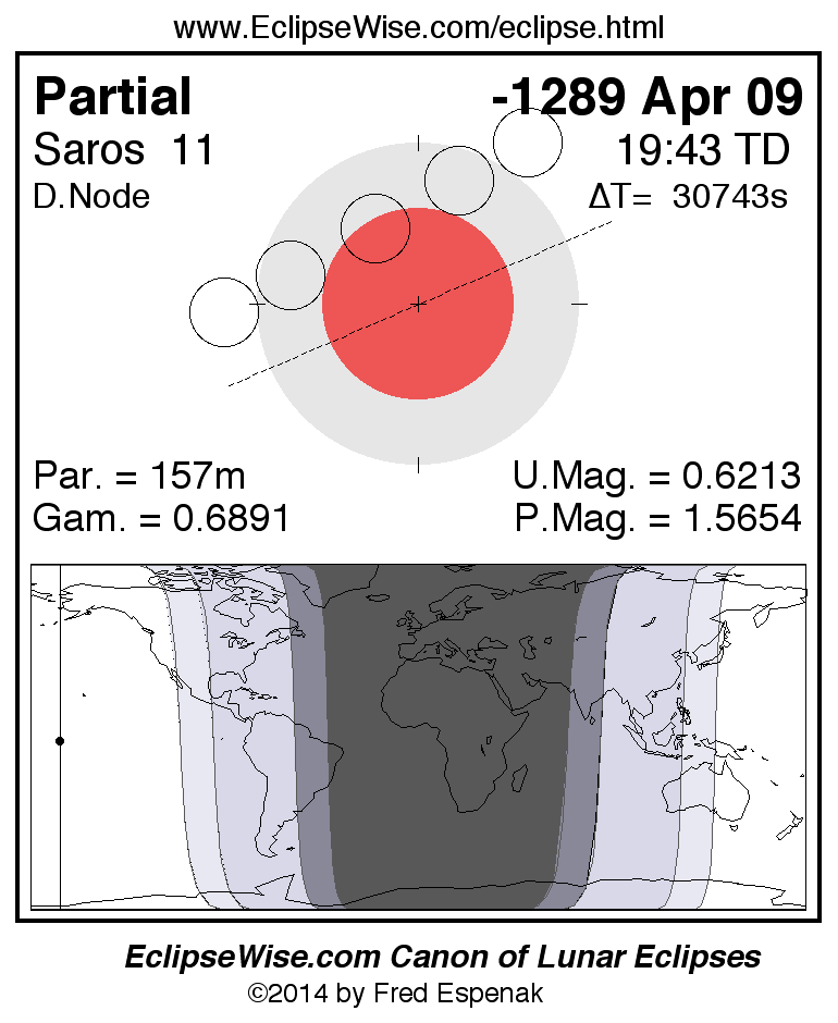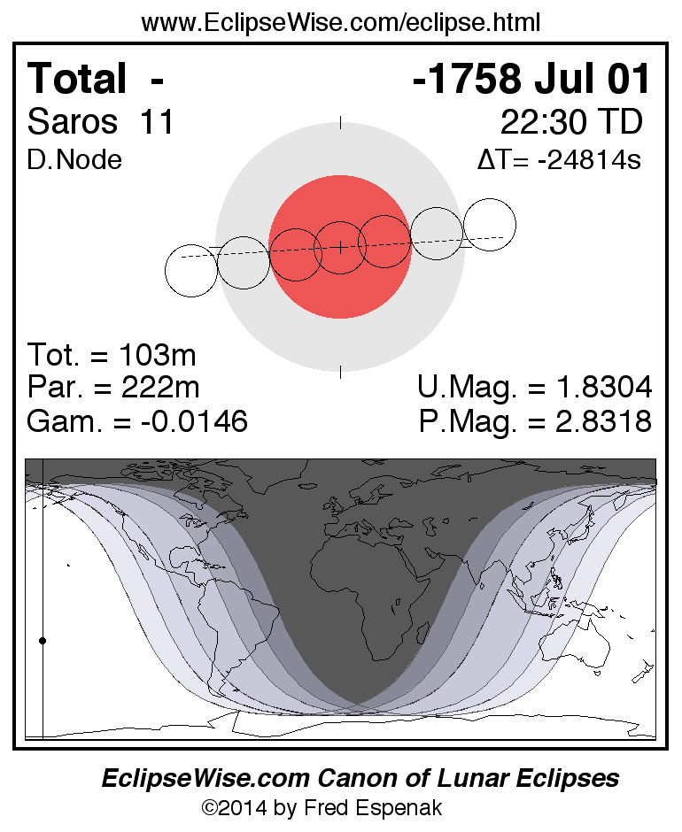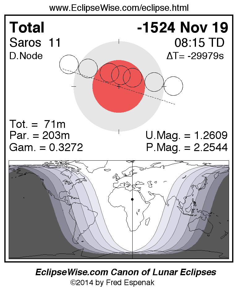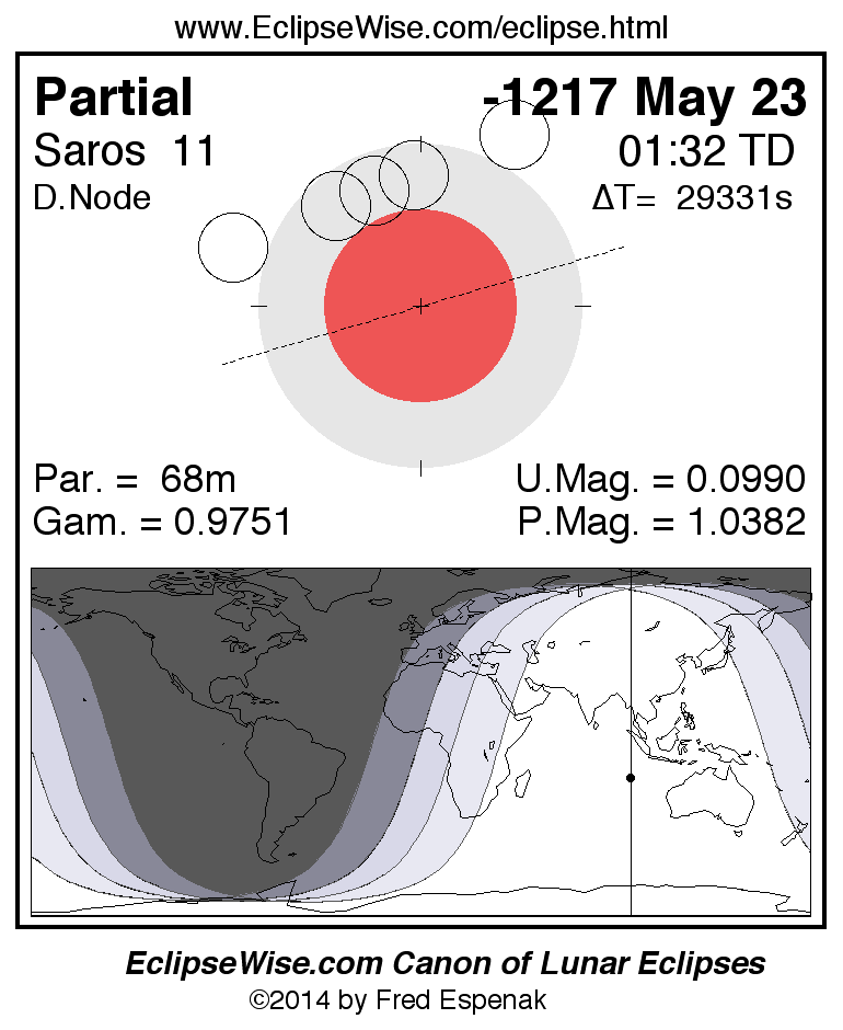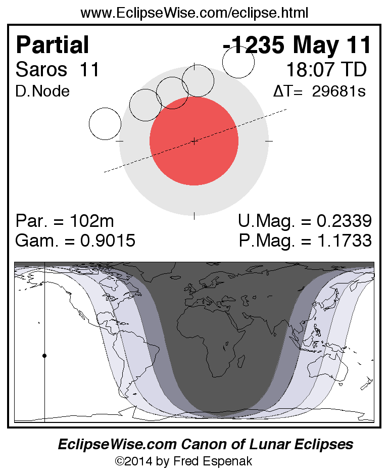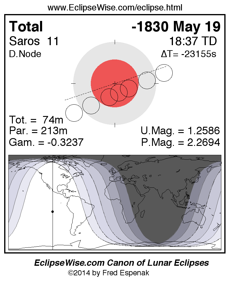 A panorama of all lunar eclipses belonging to Saros 11 is presented here. Each figure shows the Moon's path with respect to Earth's penumbral and umbral shadows. Below the path is a map depicting the geographic region of visibility for the eclipse. The date and time are given for the instant of Greatest Eclipse. Every figure serves as a hyperlink to the EclipseWise Prime page for that eclipse with a larger figure and complete details for the eclipse. Visit the Key to Lunar Eclipse Figures for a detailed explanation of these diagrams. Near the bottom of this page are a series of hyperlinks for more on lunar eclipses.