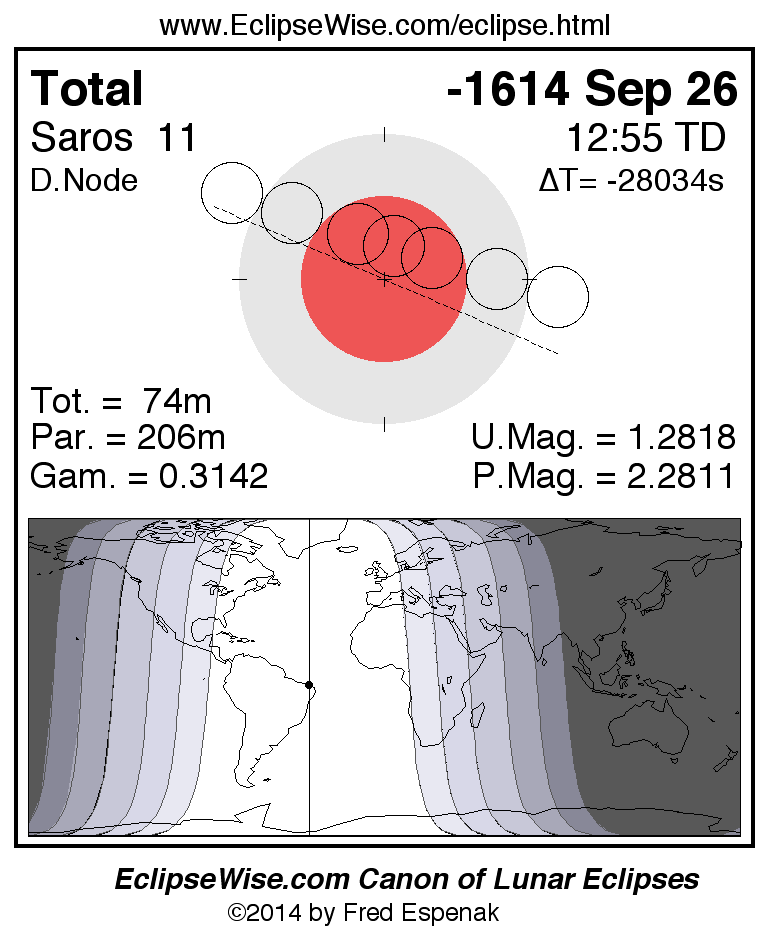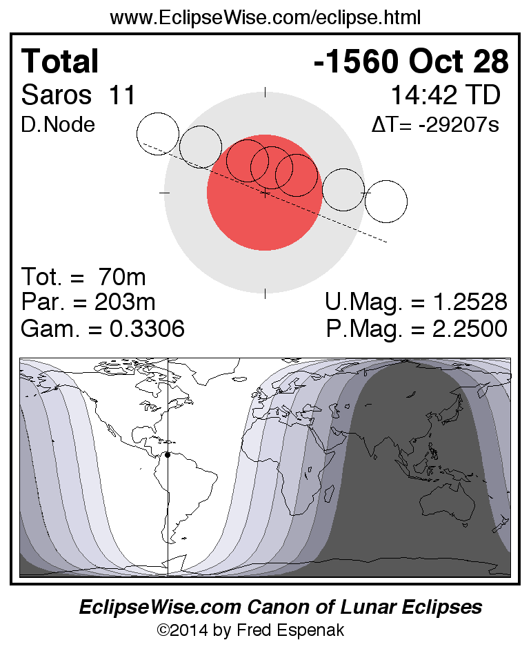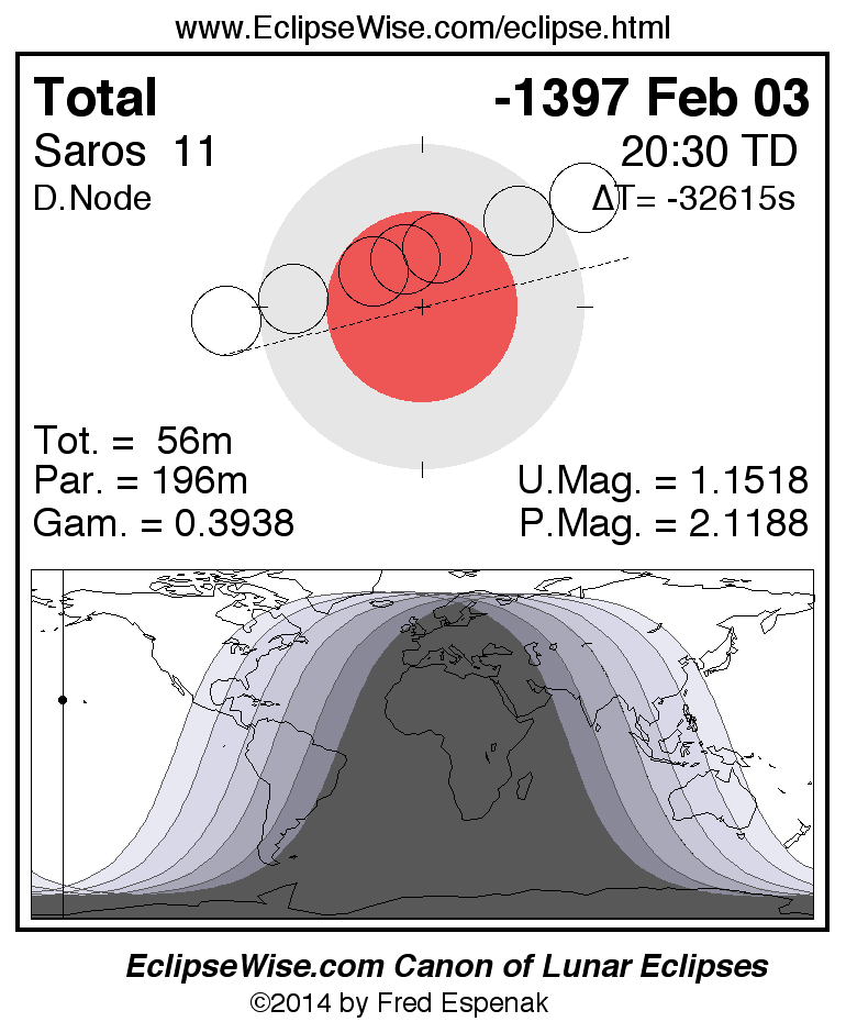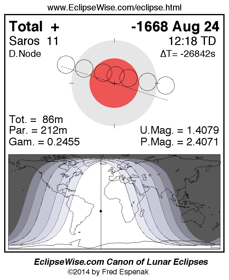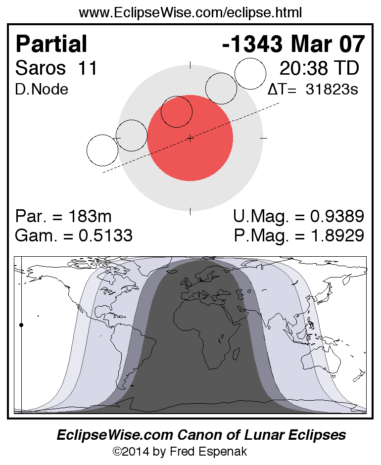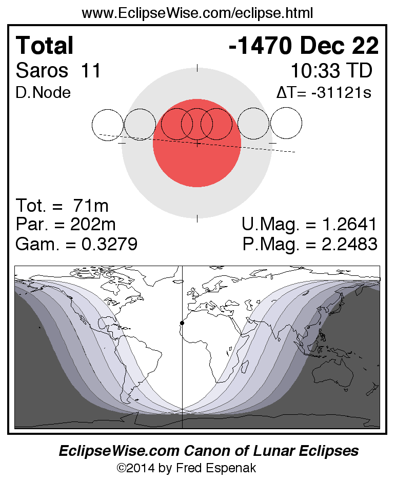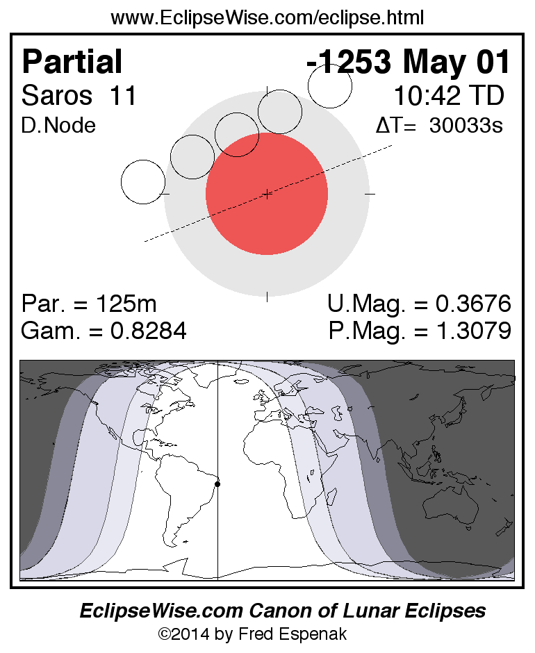 A panorama of all lunar eclipses belonging to Saros 11 is presented here. Each figure shows the Moon's path with respect to Earth's penumbral and umbral shadows. Below the path is a map depicting the geographic region of visibility for the eclipse. The date and time are given for the instant of Greatest Eclipse. Every figure serves as a hyperlink to the EclipseWise Prime page for that eclipse with a larger figure and complete details for the eclipse. Visit the Key to Lunar Eclipse Figures for a detailed explanation of these diagrams. Near the bottom of this page are a series of hyperlinks for more on lunar eclipses.