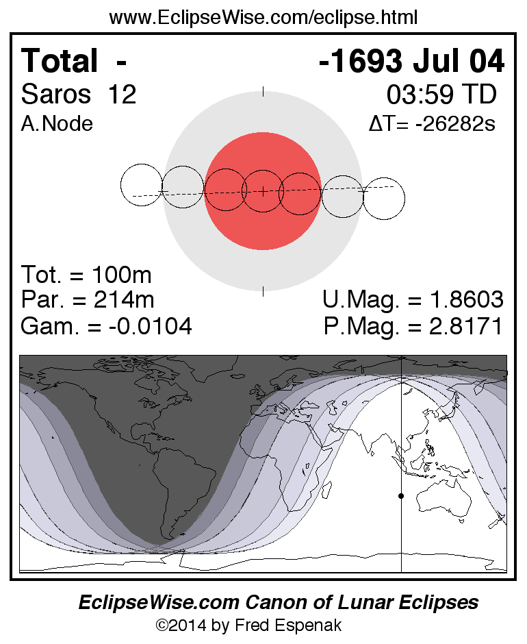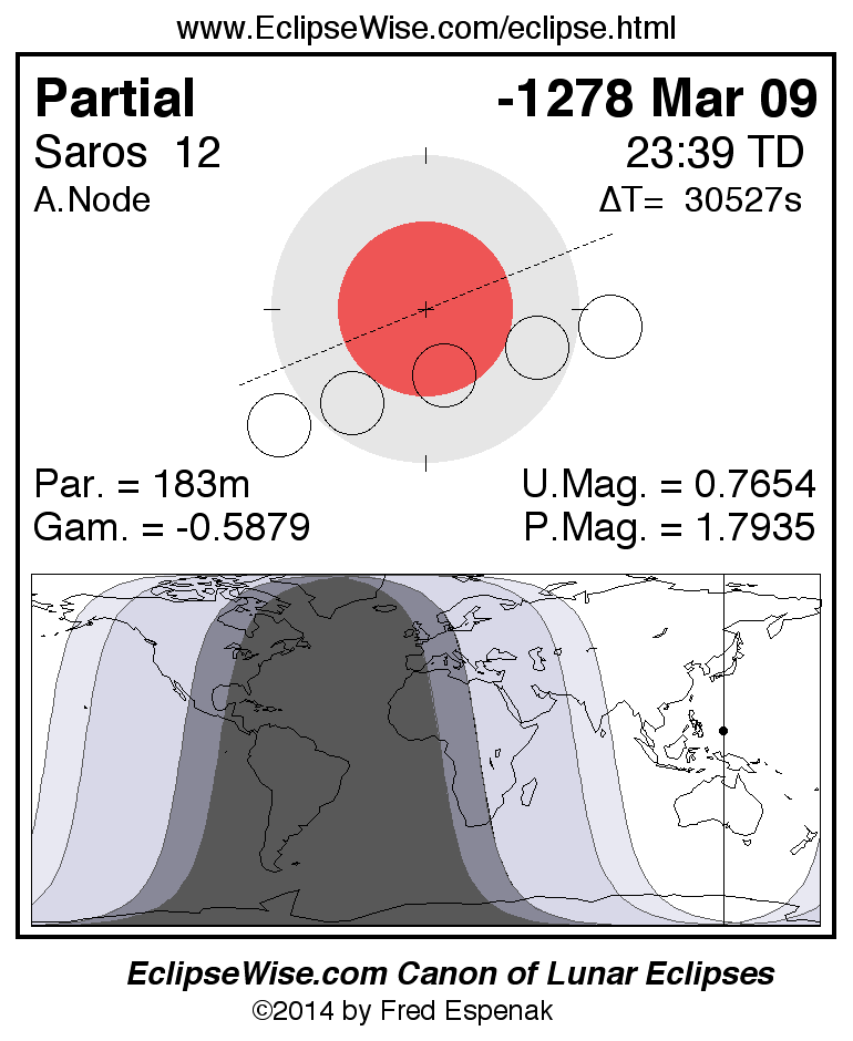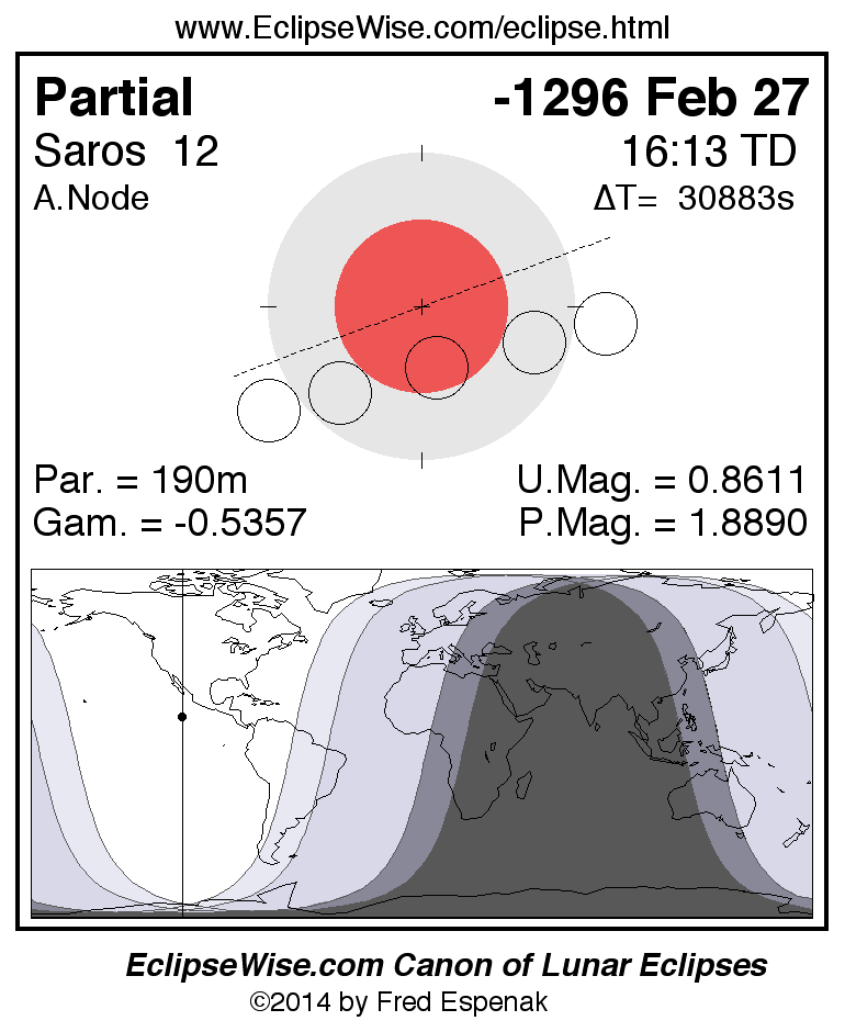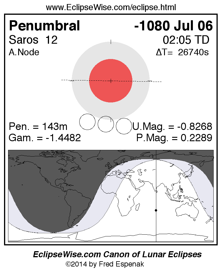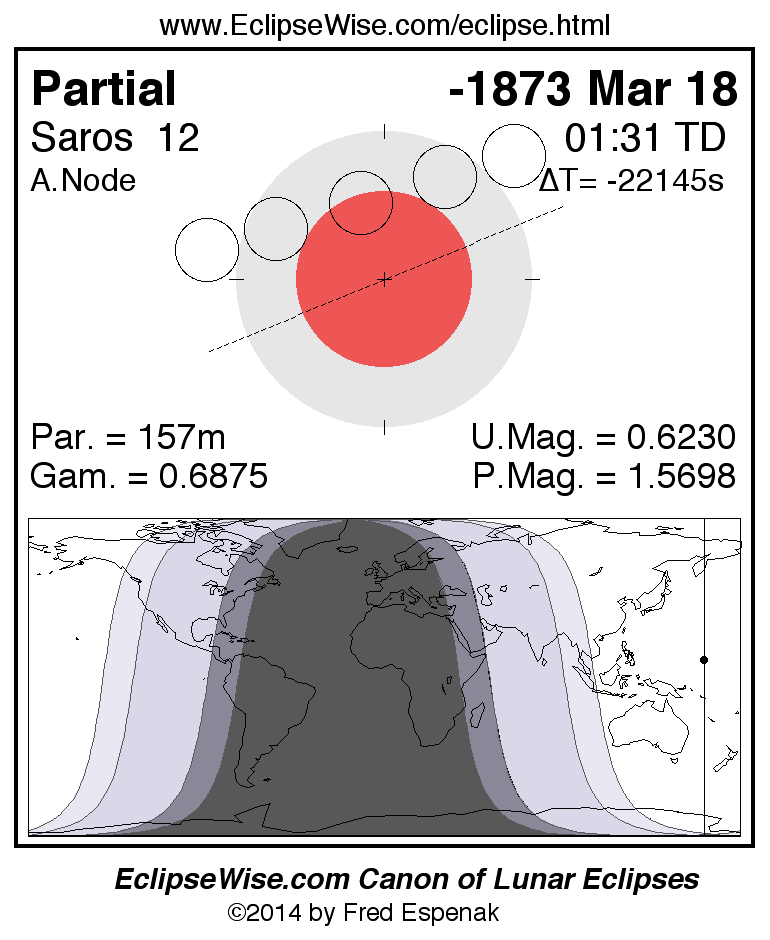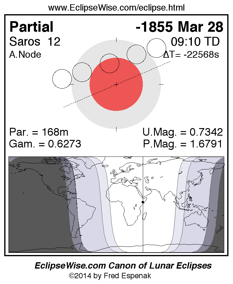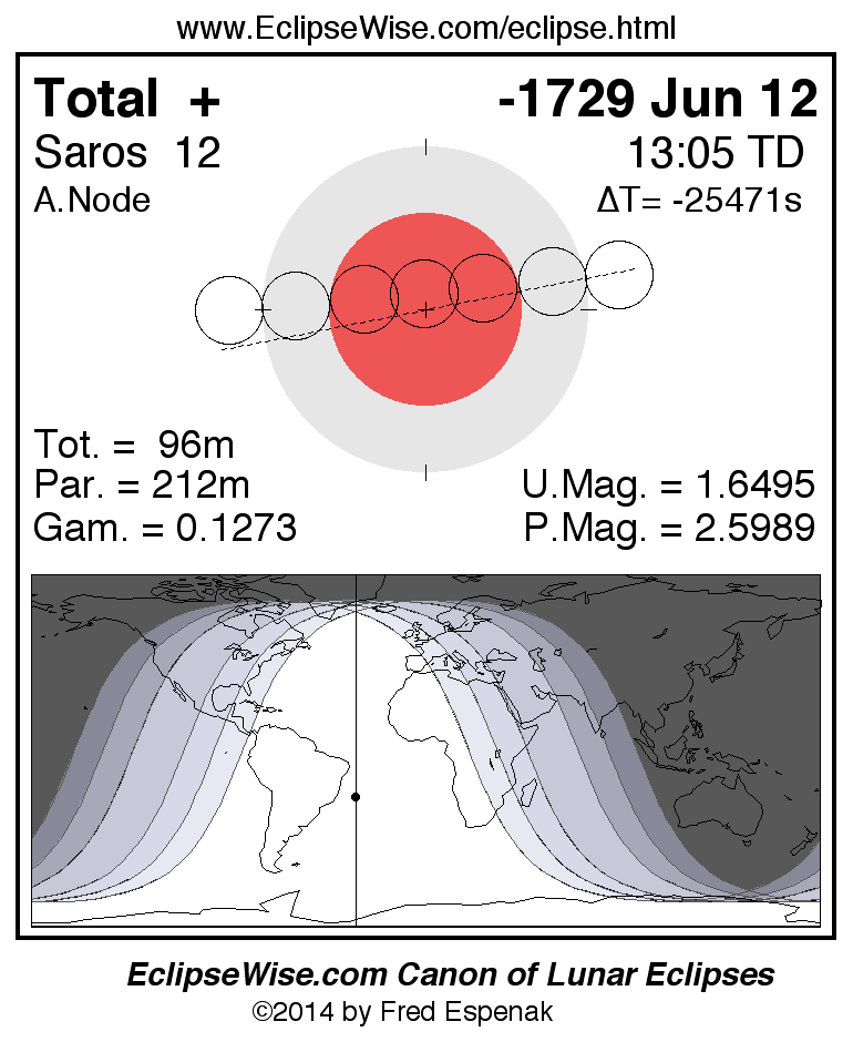 A panorama of all lunar eclipses belonging to Saros 12 is presented here. Each figure shows the Moon's path with respect to Earth's penumbral and umbral shadows. Below the path is a map depicting the geographic region of visibility for the eclipse. The date and time are given for the instant of Greatest Eclipse. Every figure serves as a hyperlink to the EclipseWise Prime page for that eclipse with a larger figure and complete details for the eclipse. Visit the Key to Lunar Eclipse Figures for a detailed explanation of these diagrams. Near the bottom of this page are a series of hyperlinks for more on lunar eclipses.