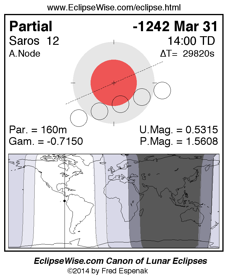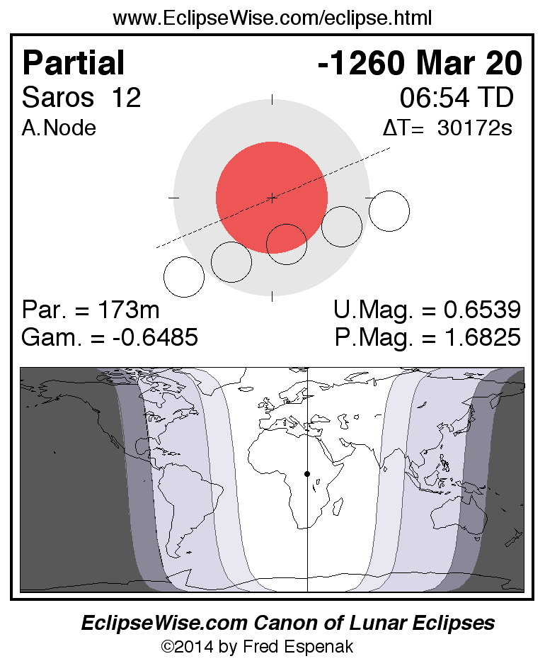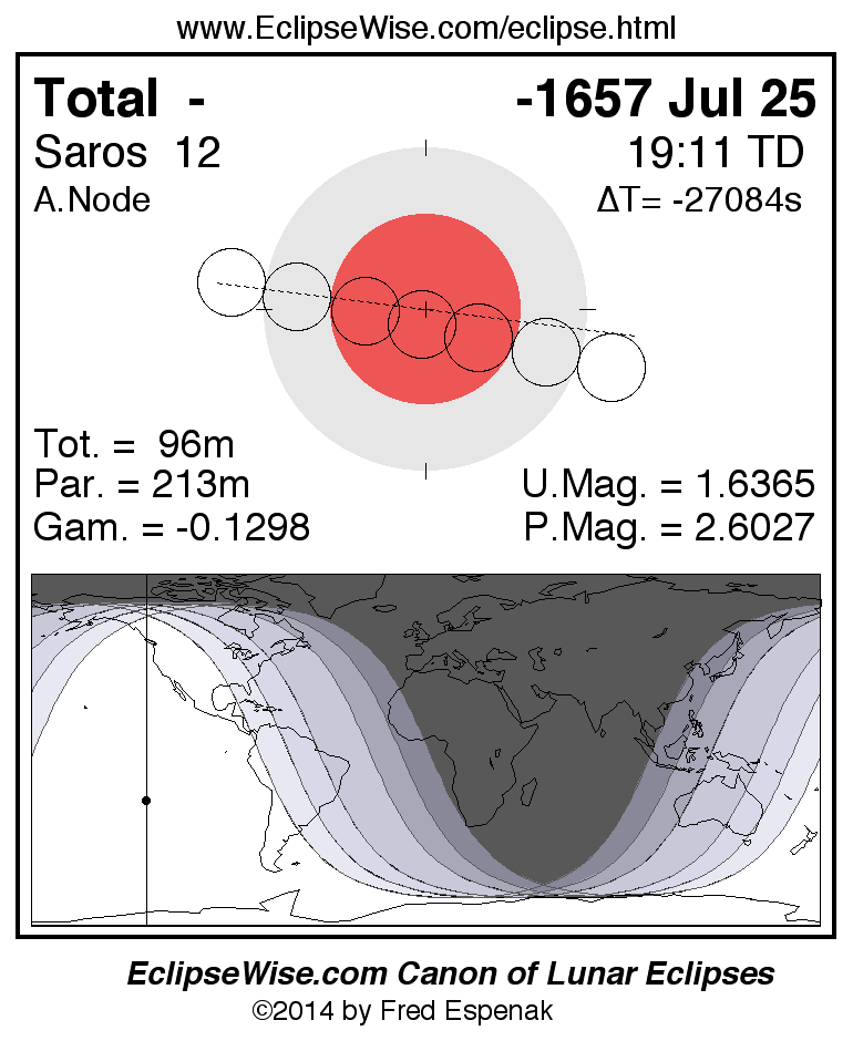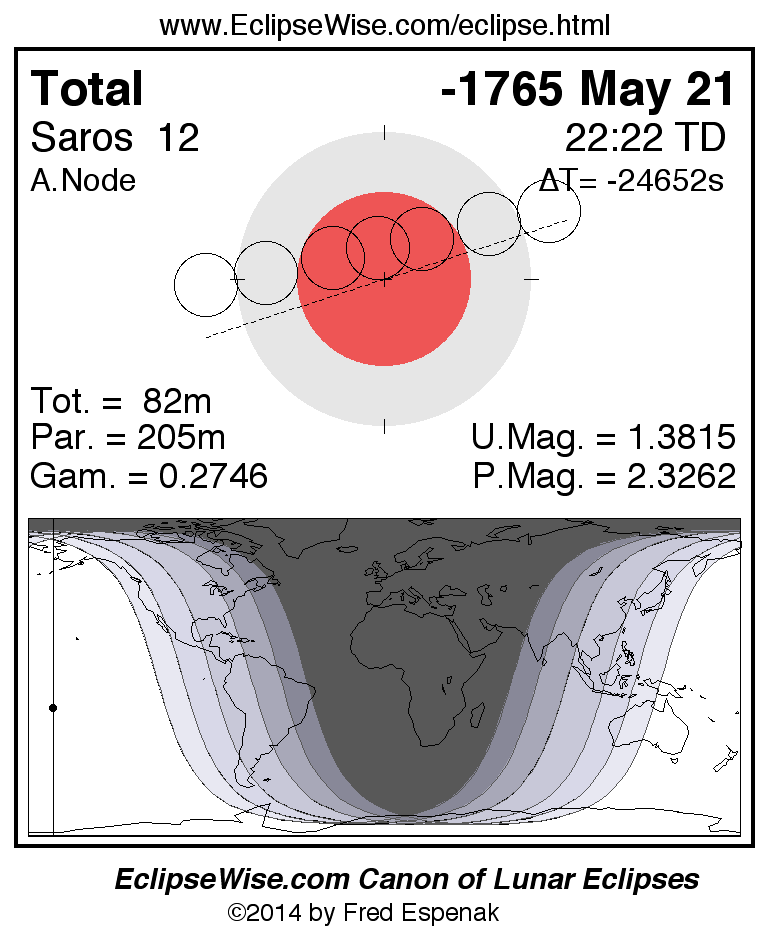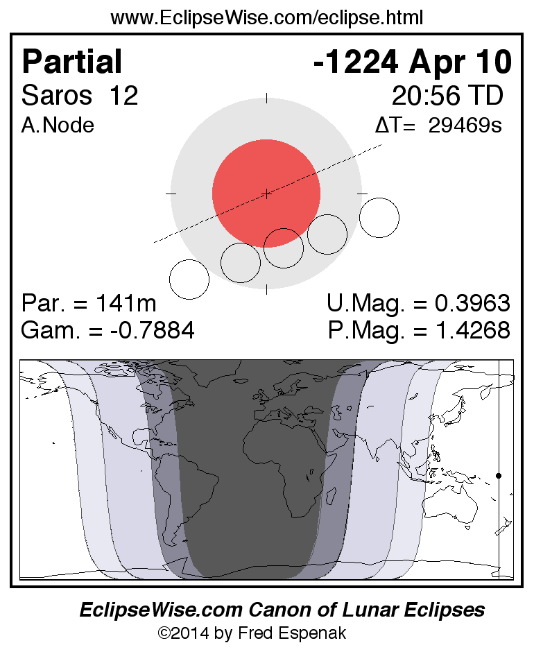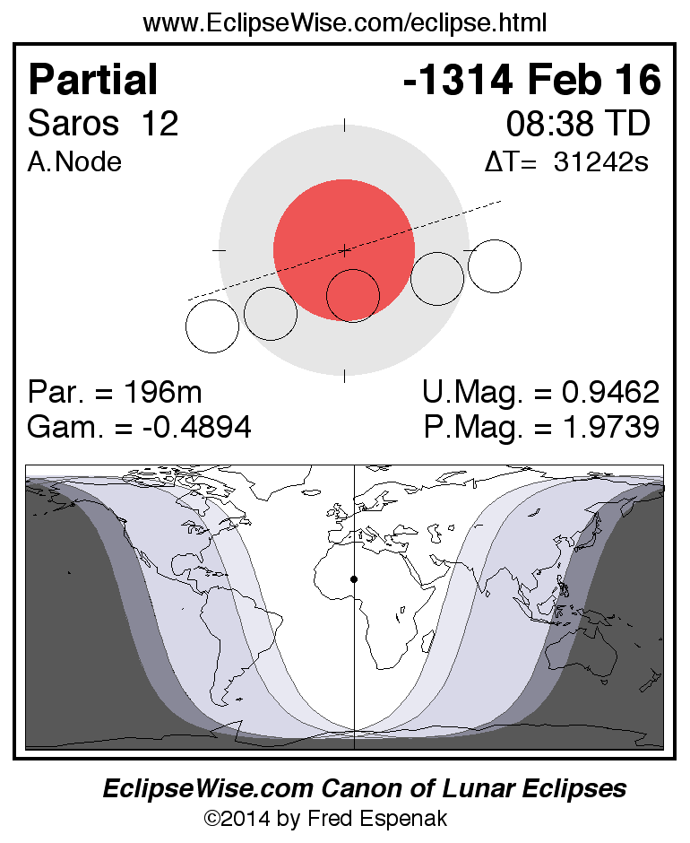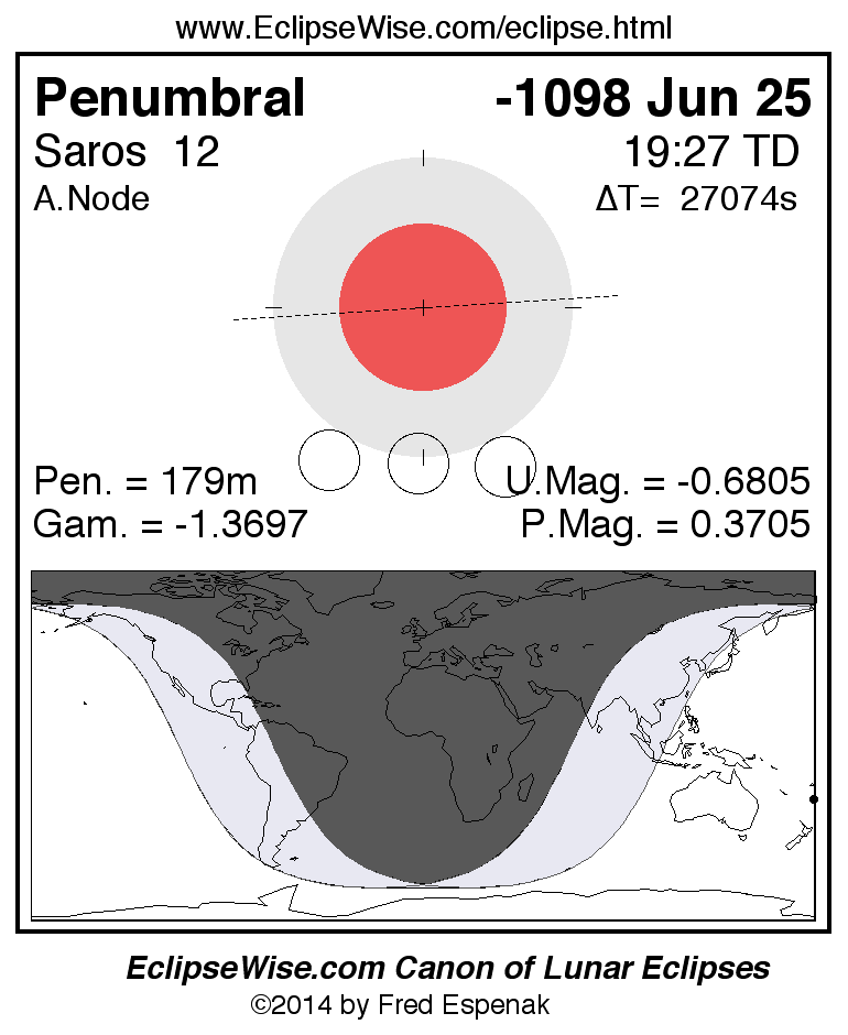 A panorama of all lunar eclipses belonging to Saros 12 is presented here. Each figure shows the Moon's path with respect to Earth's penumbral and umbral shadows. Below the path is a map depicting the geographic region of visibility for the eclipse. The date and time are given for the instant of Greatest Eclipse. Every figure serves as a hyperlink to the EclipseWise Prime page for that eclipse with a larger figure and complete details for the eclipse. Visit the Key to Lunar Eclipse Figures for a detailed explanation of these diagrams. Near the bottom of this page are a series of hyperlinks for more on lunar eclipses.