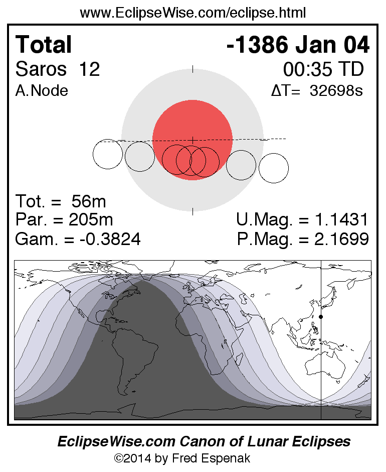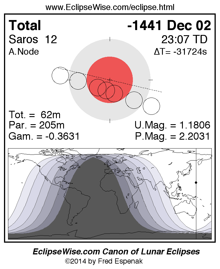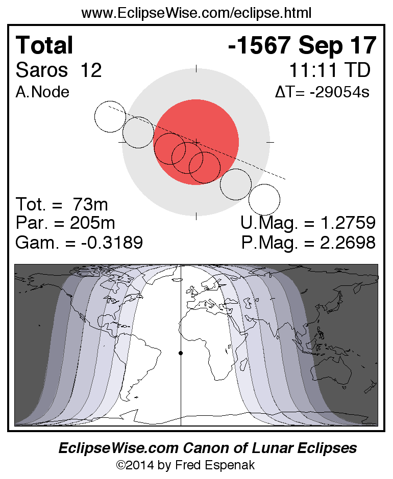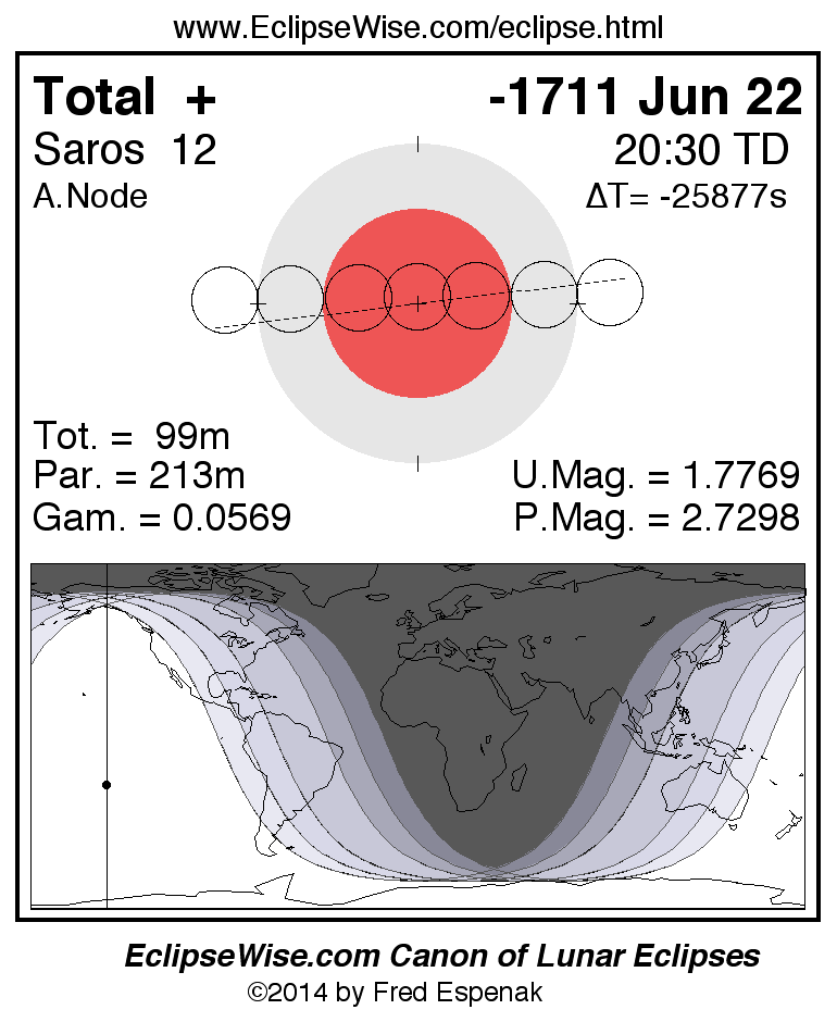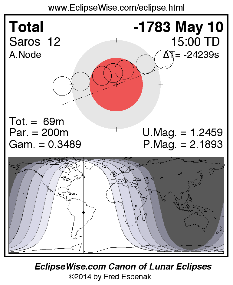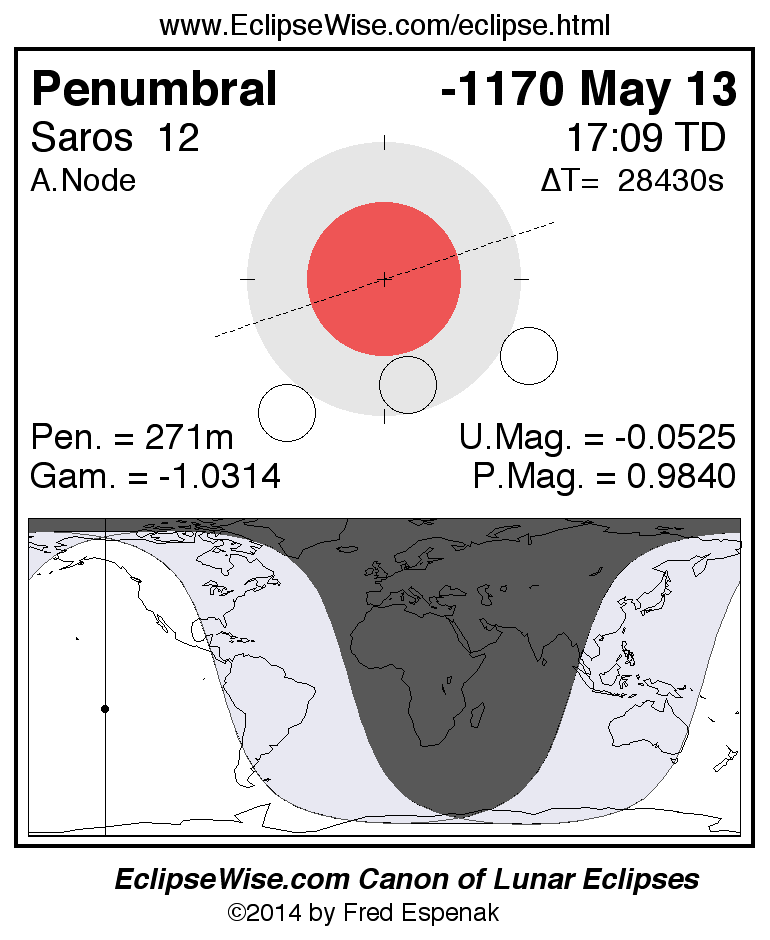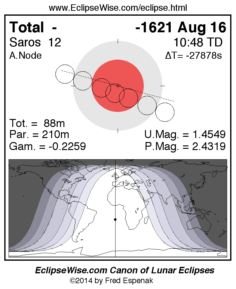 A panorama of all lunar eclipses belonging to Saros 12 is presented here. Each figure shows the Moon's path with respect to Earth's penumbral and umbral shadows. Below the path is a map depicting the geographic region of visibility for the eclipse. The date and time are given for the instant of Greatest Eclipse. Every figure serves as a hyperlink to the EclipseWise Prime page for that eclipse with a larger figure and complete details for the eclipse. Visit the Key to Lunar Eclipse Figures for a detailed explanation of these diagrams. Near the bottom of this page are a series of hyperlinks for more on lunar eclipses.