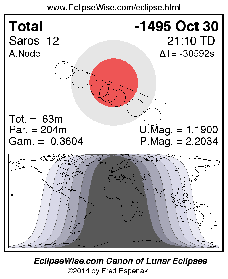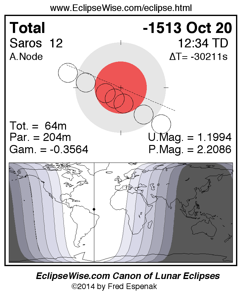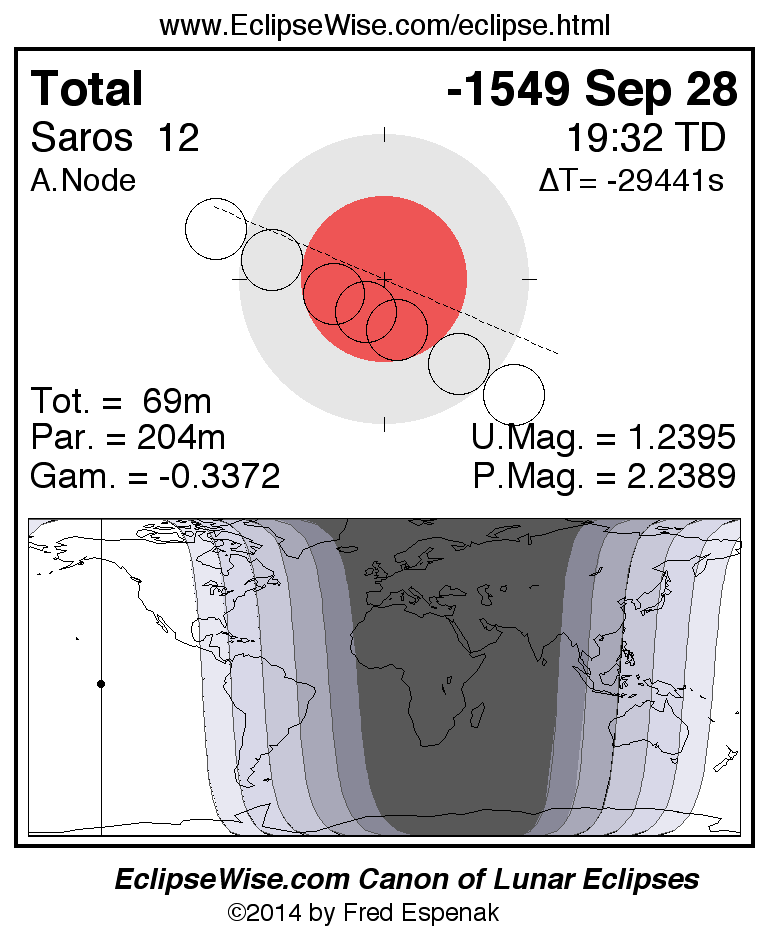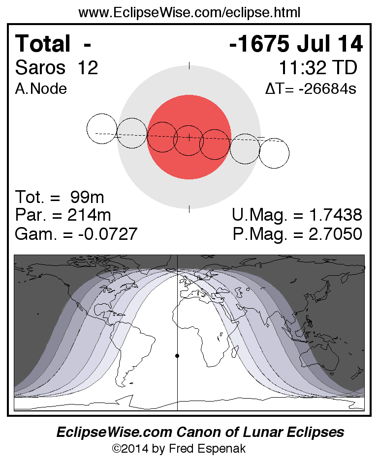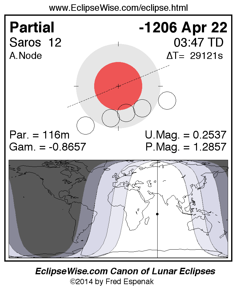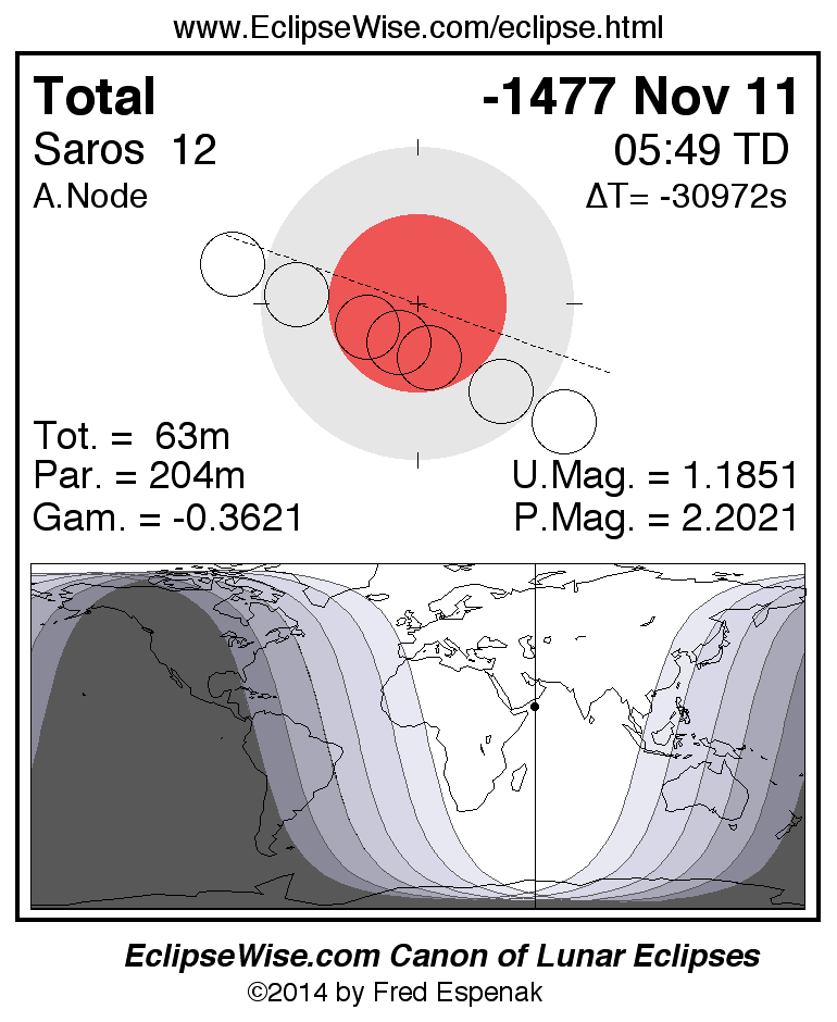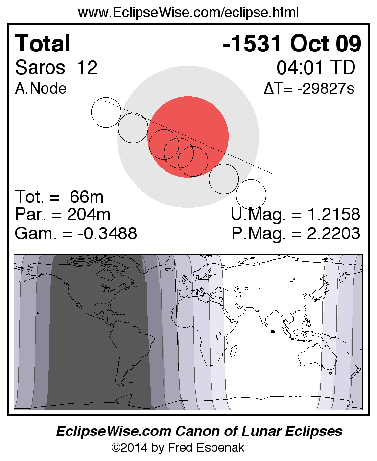 A panorama of all lunar eclipses belonging to Saros 12 is presented here. Each figure shows the Moon's path with respect to Earth's penumbral and umbral shadows. Below the path is a map depicting the geographic region of visibility for the eclipse. The date and time are given for the instant of Greatest Eclipse. Every figure serves as a hyperlink to the EclipseWise Prime page for that eclipse with a larger figure and complete details for the eclipse. Visit the Key to Lunar Eclipse Figures for a detailed explanation of these diagrams. Near the bottom of this page are a series of hyperlinks for more on lunar eclipses.