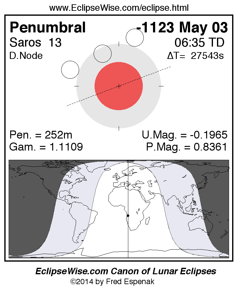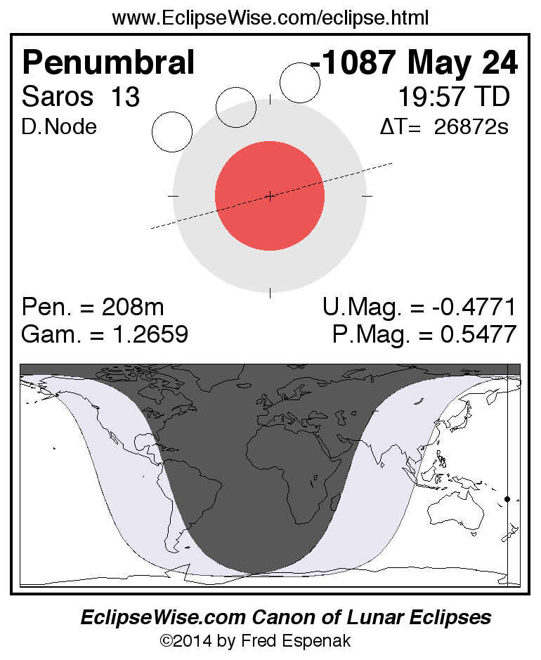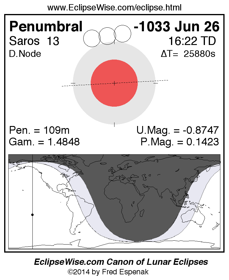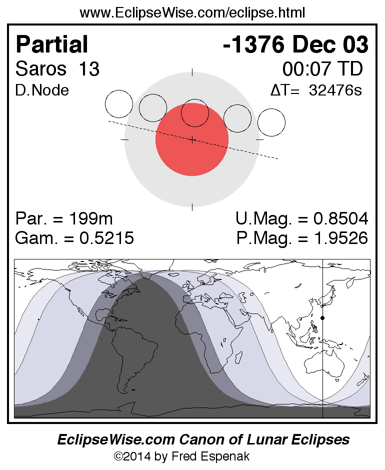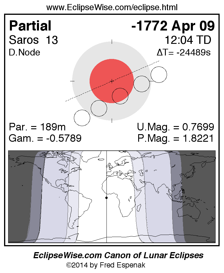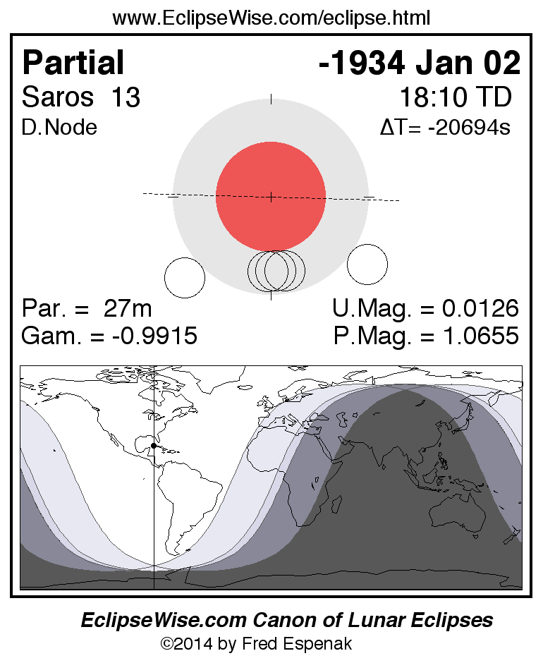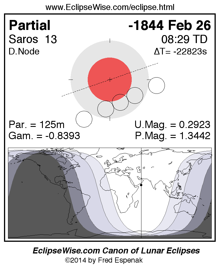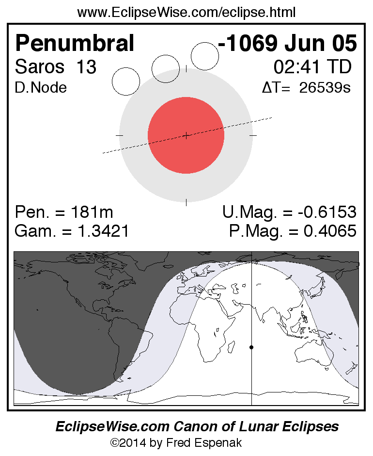 A panorama of all lunar eclipses belonging to Saros 13 is presented here. Each figure shows the Moon's path with respect to Earth's penumbral and umbral shadows. Below the path is a map depicting the geographic region of visibility for the eclipse. The date and time are given for the instant of Greatest Eclipse. Every figure serves as a hyperlink to the EclipseWise Prime page for that eclipse with a larger figure and complete details for the eclipse. Visit the Key to Lunar Eclipse Figures for a detailed explanation of these diagrams. Near the bottom of this page are a series of hyperlinks for more on lunar eclipses.