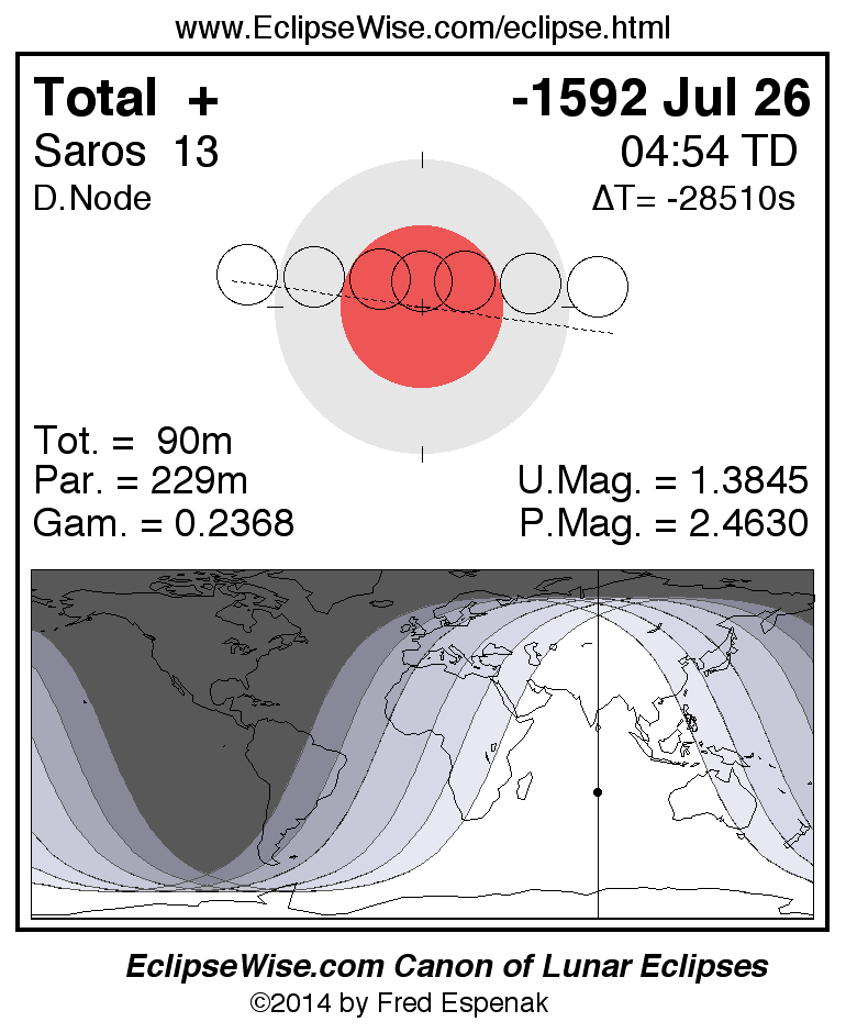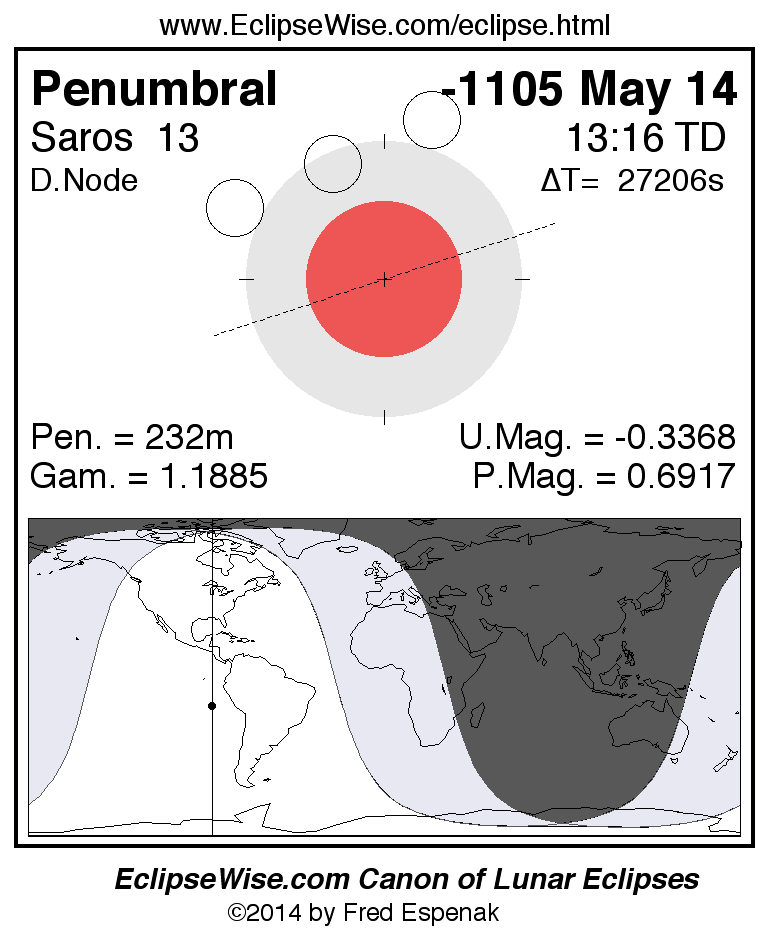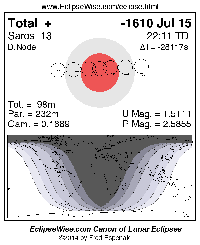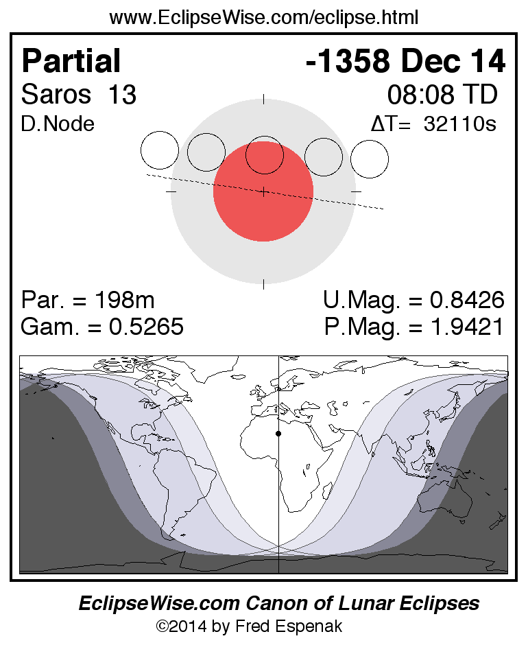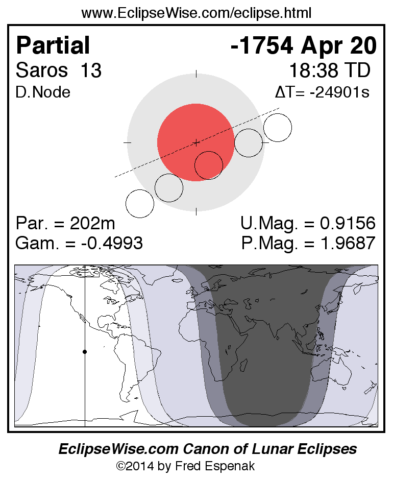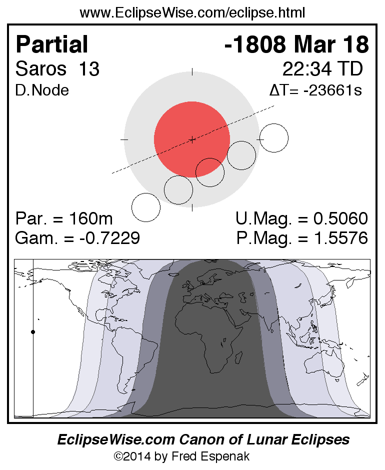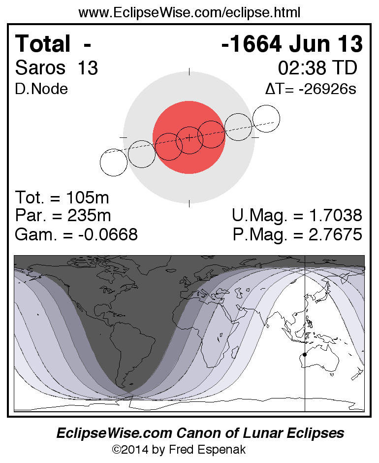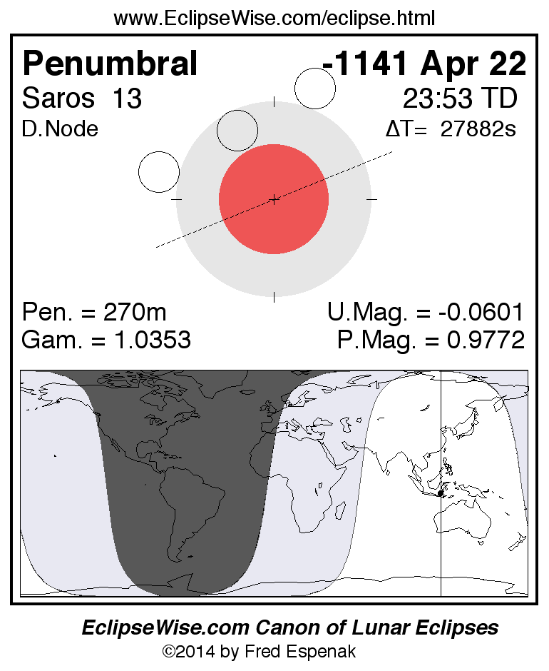 A panorama of all lunar eclipses belonging to Saros 13 is presented here. Each figure shows the Moon's path with respect to Earth's penumbral and umbral shadows. Below the path is a map depicting the geographic region of visibility for the eclipse. The date and time are given for the instant of Greatest Eclipse. Every figure serves as a hyperlink to the EclipseWise Prime page for that eclipse with a larger figure and complete details for the eclipse. Visit the Key to Lunar Eclipse Figures for a detailed explanation of these diagrams. Near the bottom of this page are a series of hyperlinks for more on lunar eclipses.