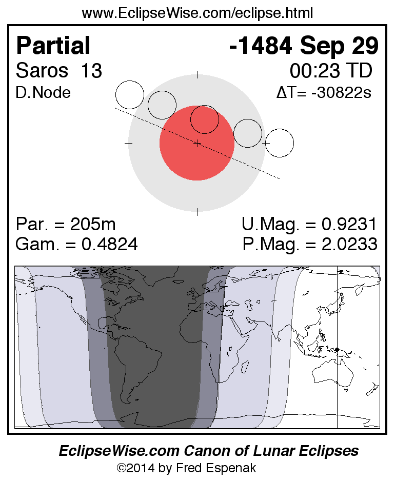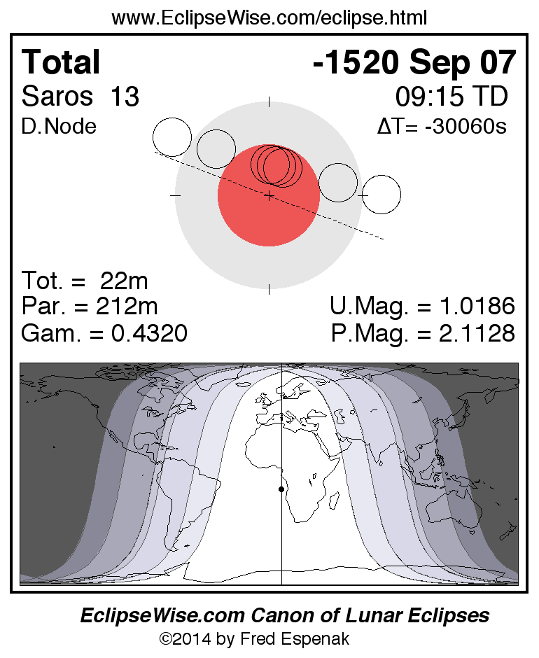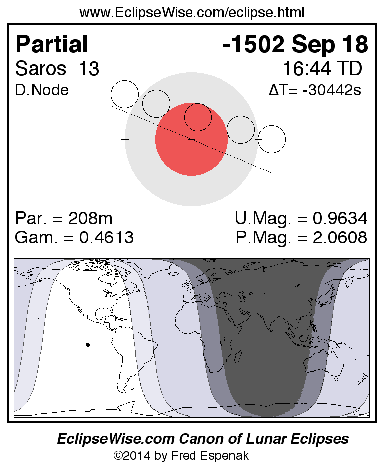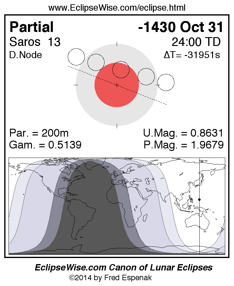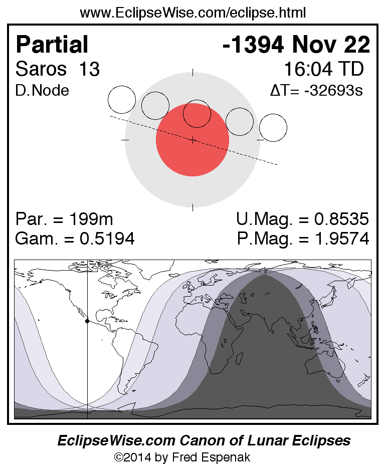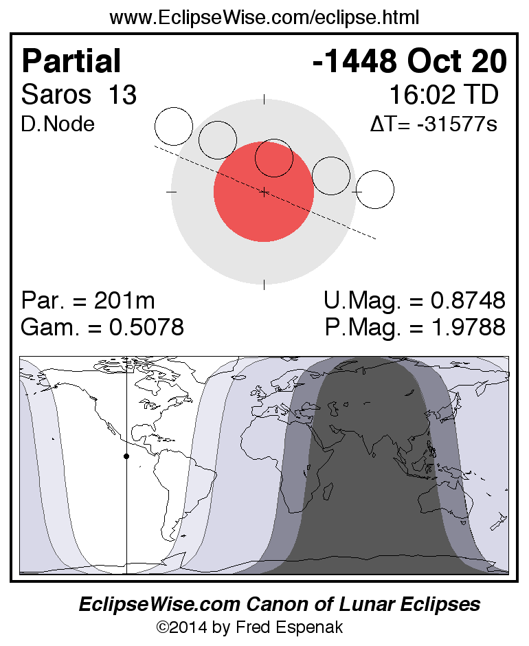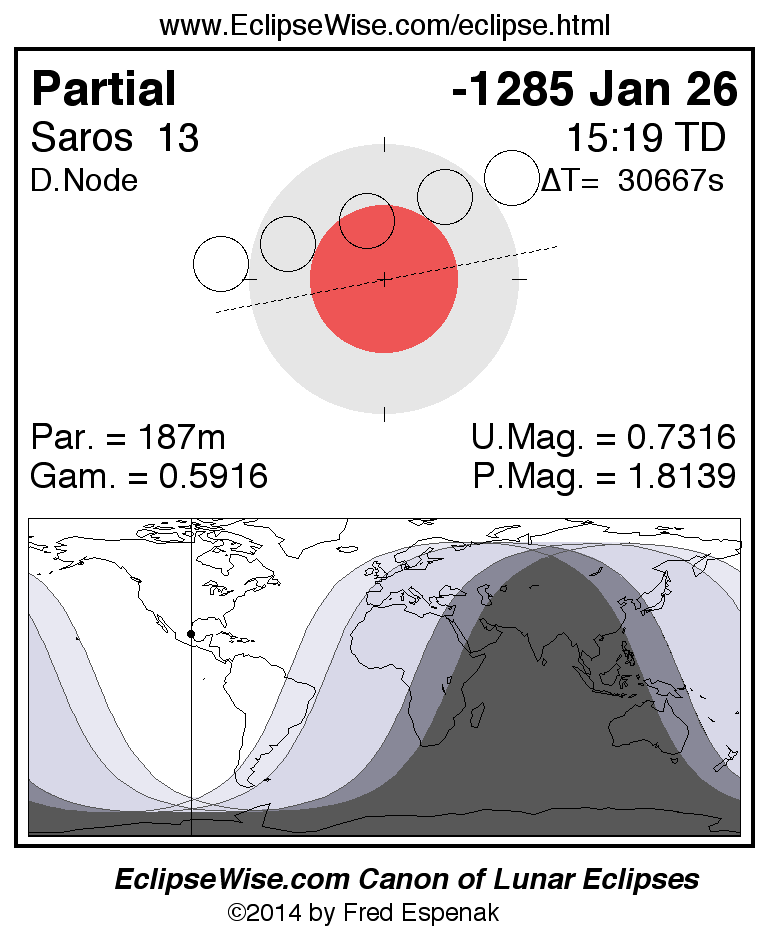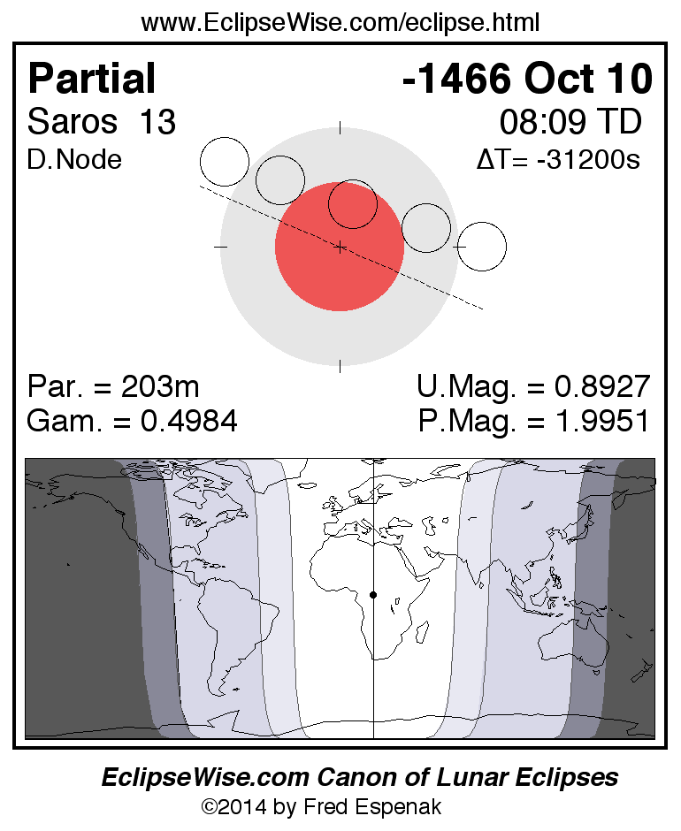 A panorama of all lunar eclipses belonging to Saros 13 is presented here. Each figure shows the Moon's path with respect to Earth's penumbral and umbral shadows. Below the path is a map depicting the geographic region of visibility for the eclipse. The date and time are given for the instant of Greatest Eclipse. Every figure serves as a hyperlink to the EclipseWise Prime page for that eclipse with a larger figure and complete details for the eclipse. Visit the Key to Lunar Eclipse Figures for a detailed explanation of these diagrams. Near the bottom of this page are a series of hyperlinks for more on lunar eclipses.