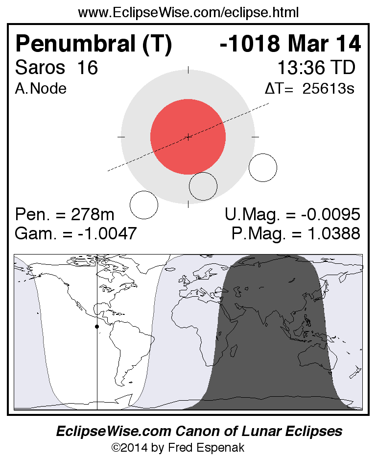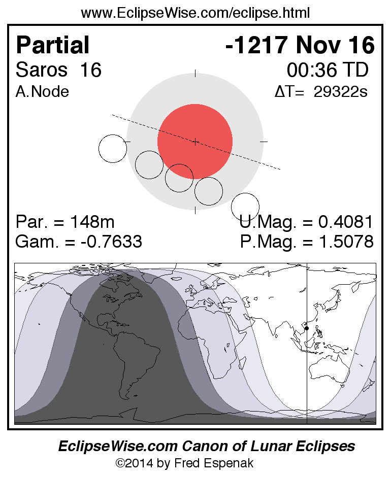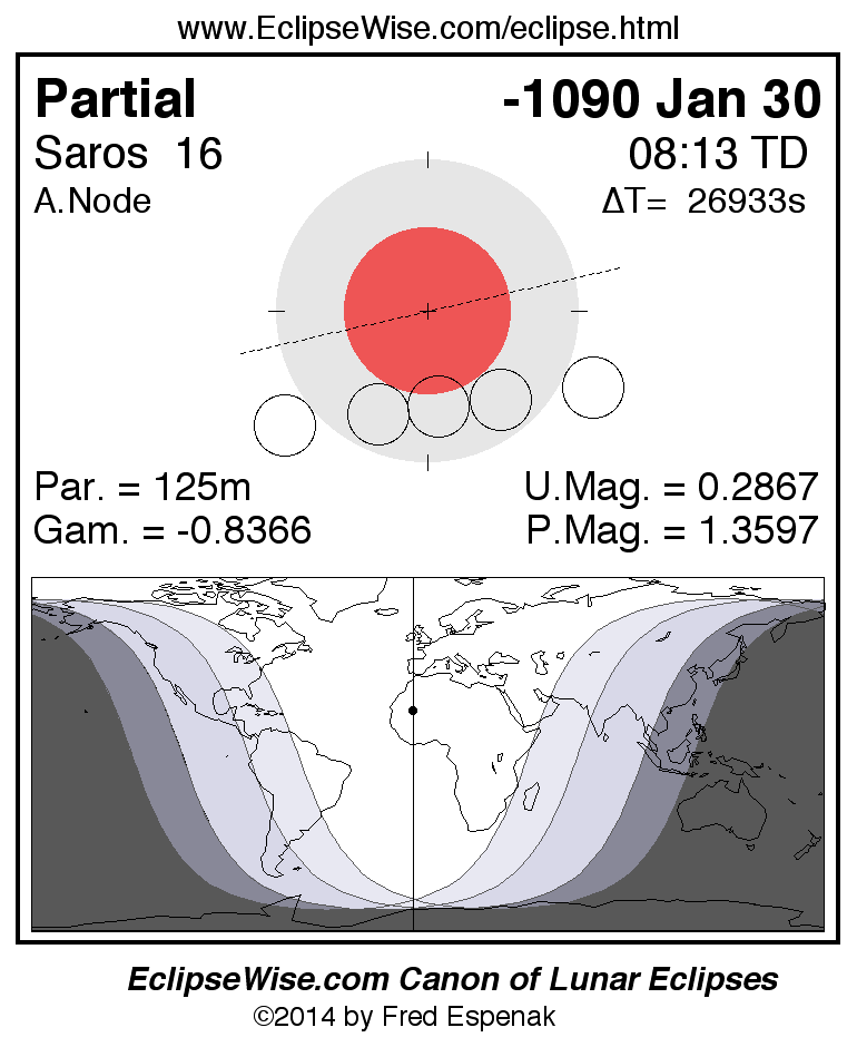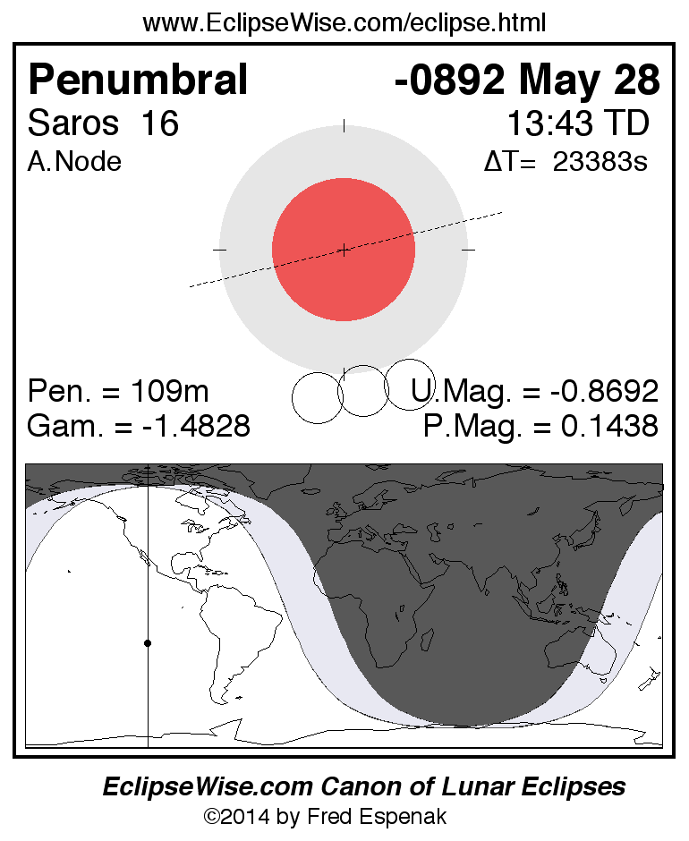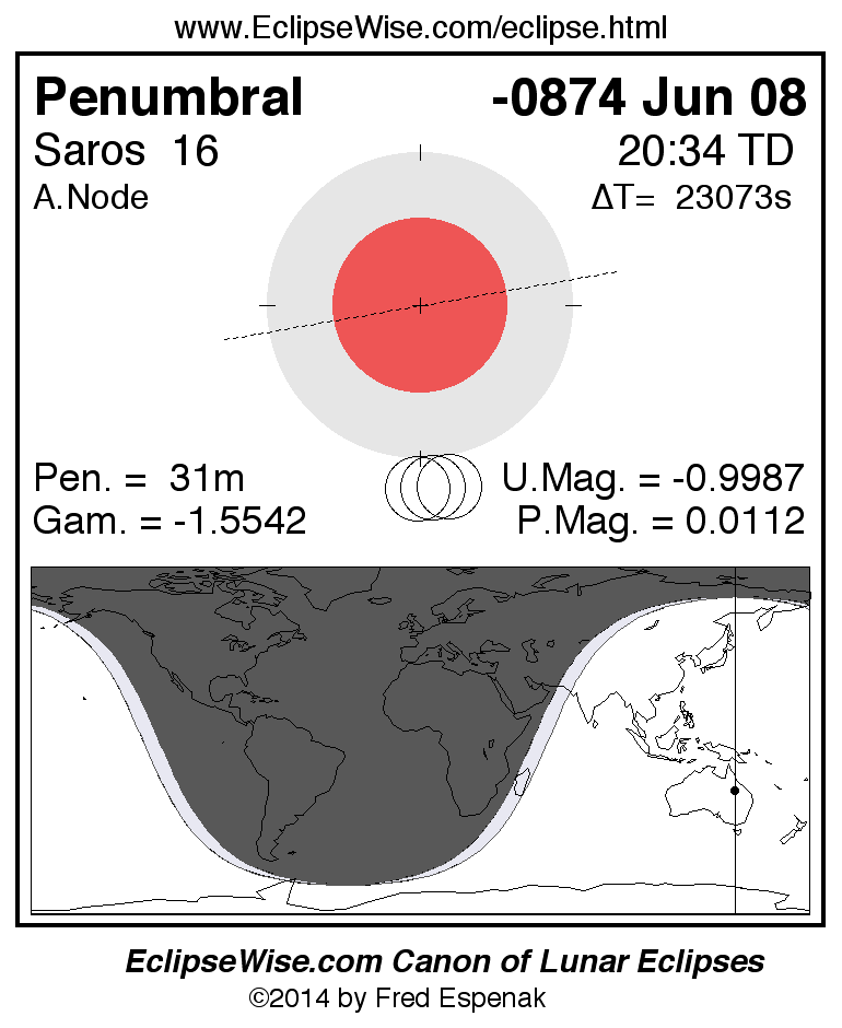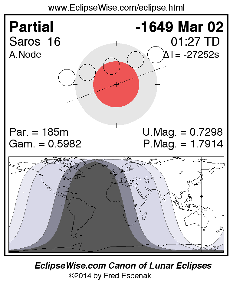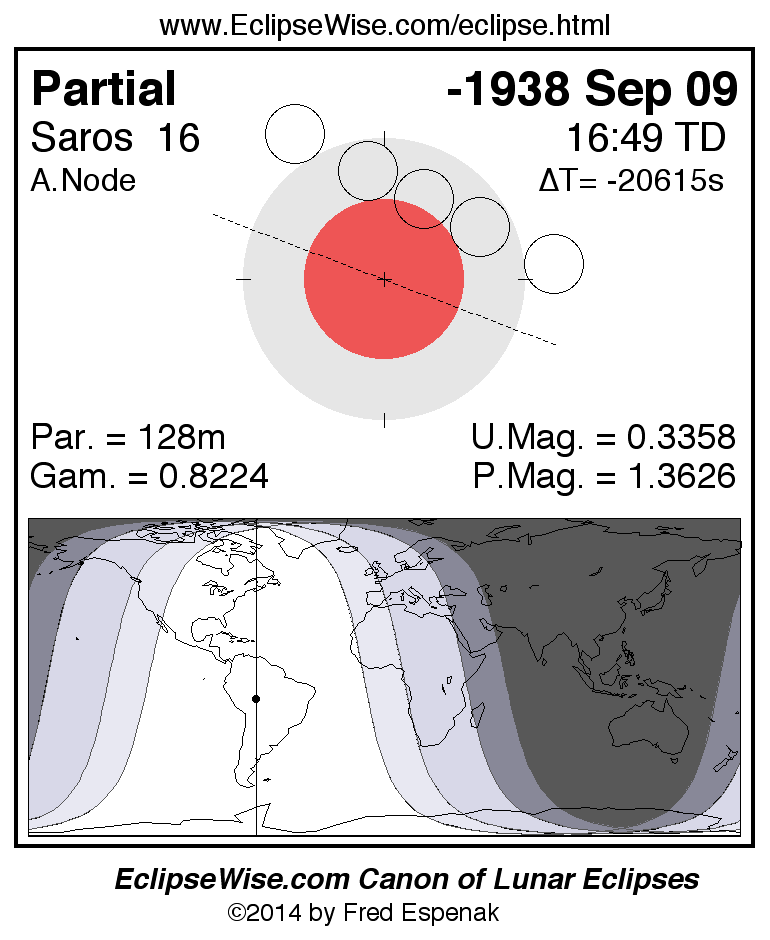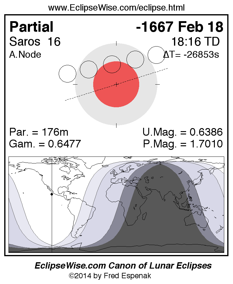A panorama of all lunar eclipses belonging to Saros 16 is presented here. Each figure shows the Moon's path with respect to Earth's penumbral and umbral shadows. Below the path is a map depicting the geographic region of visibility for the eclipse. The date and time are given for the instant of Greatest Eclipse. Every figure serves as a hyperlink to the EclipseWise Prime page for that eclipse with a larger figure and complete details for the eclipse. Visit the Key to Lunar Eclipse Figures for a detailed explanation of these diagrams. Near the bottom of this page are a series of hyperlinks for more on lunar eclipses.