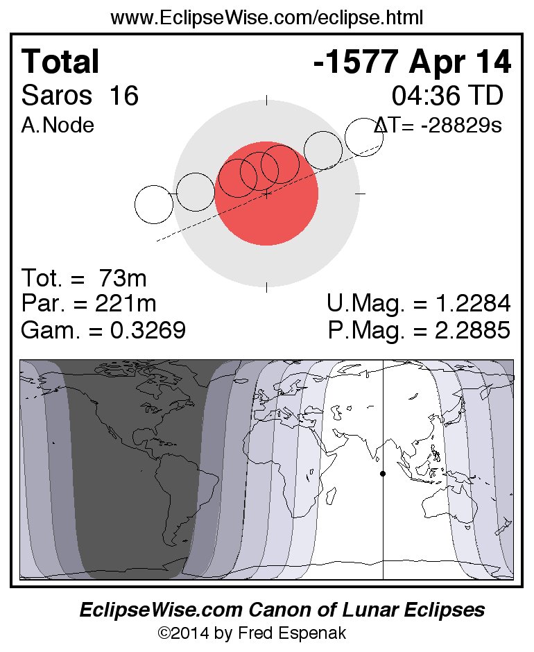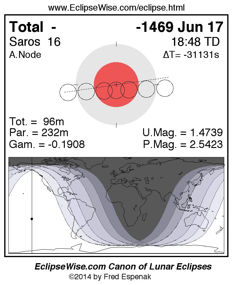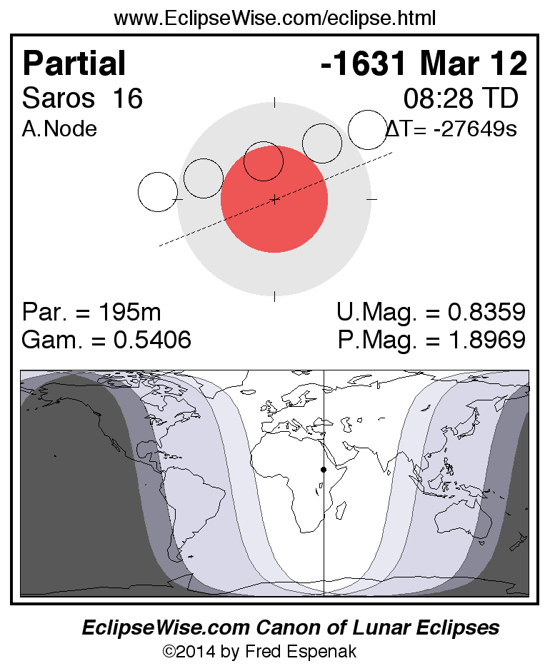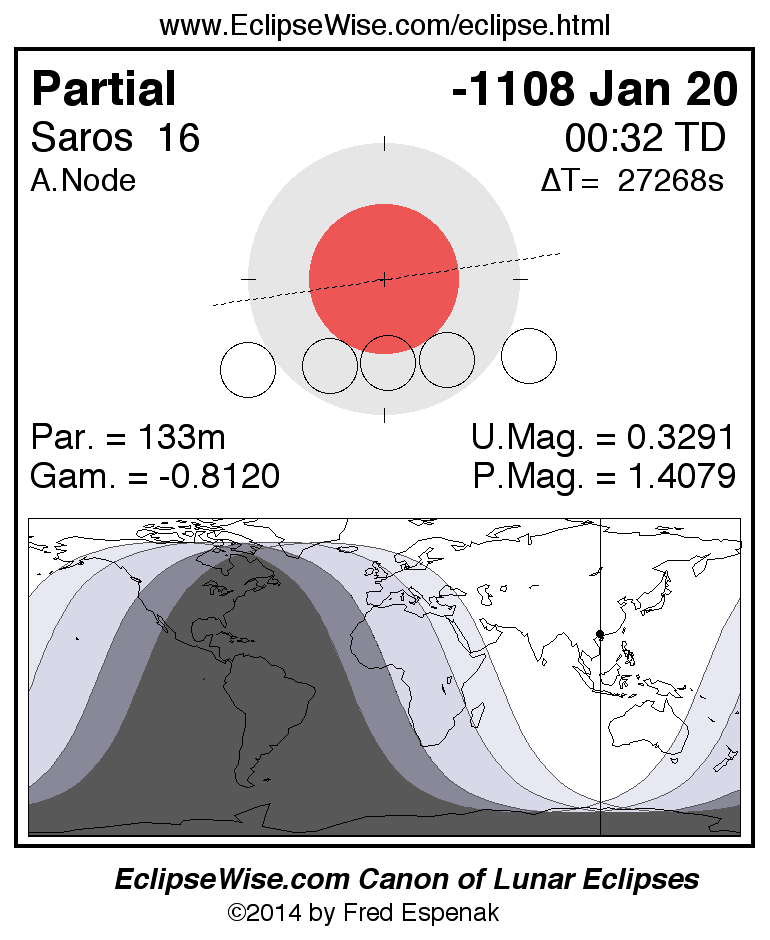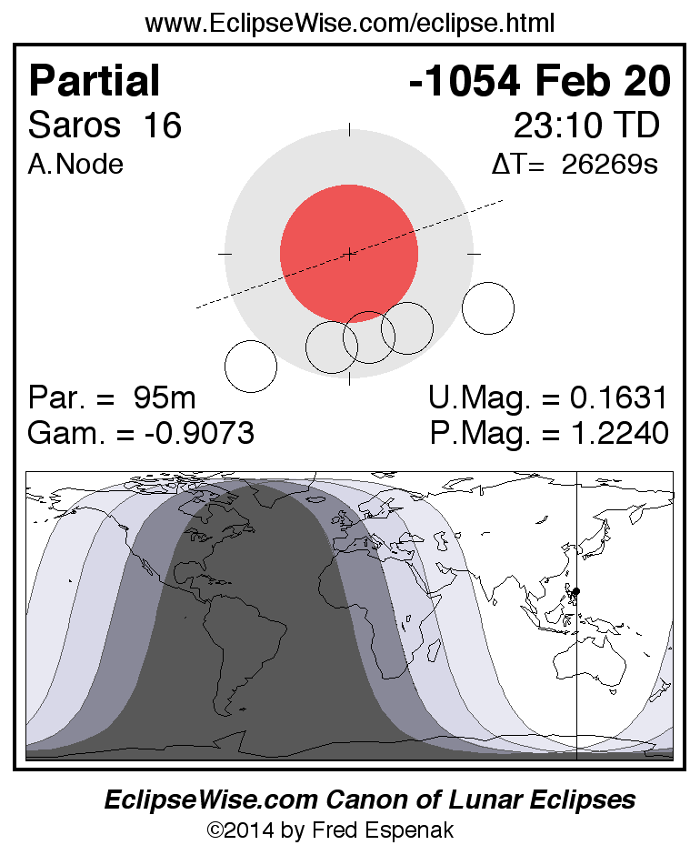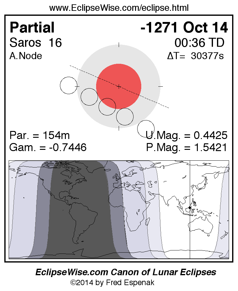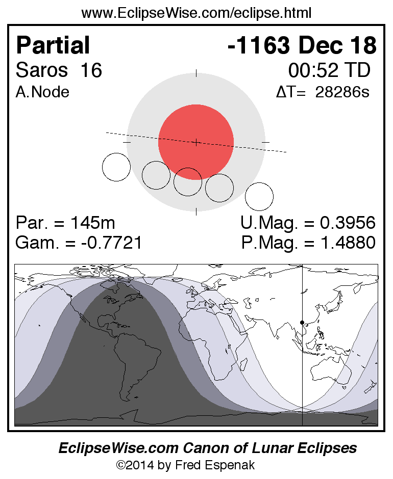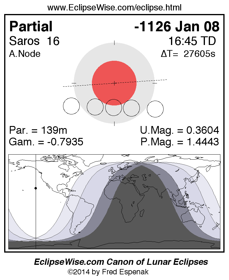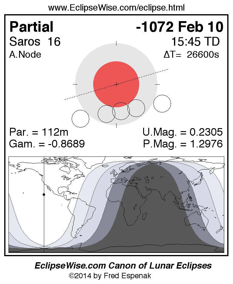 A panorama of all lunar eclipses belonging to Saros 16 is presented here. Each figure shows the Moon's path with respect to Earth's penumbral and umbral shadows. Below the path is a map depicting the geographic region of visibility for the eclipse. The date and time are given for the instant of Greatest Eclipse. Every figure serves as a hyperlink to the EclipseWise Prime page for that eclipse with a larger figure and complete details for the eclipse. Visit the Key to Lunar Eclipse Figures for a detailed explanation of these diagrams. Near the bottom of this page are a series of hyperlinks for more on lunar eclipses.