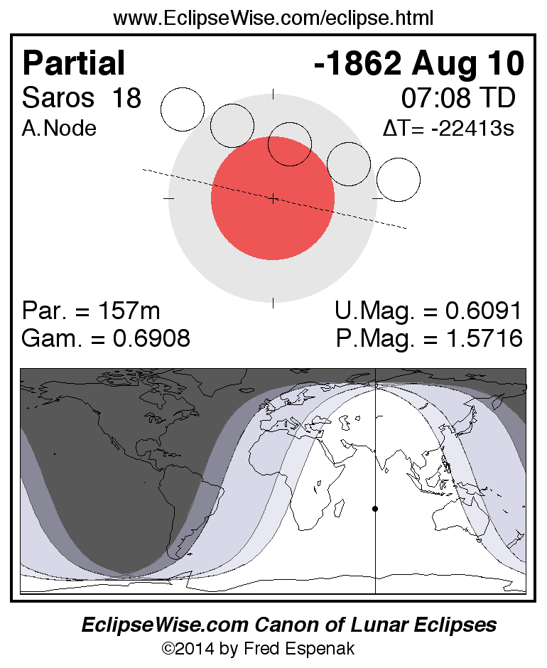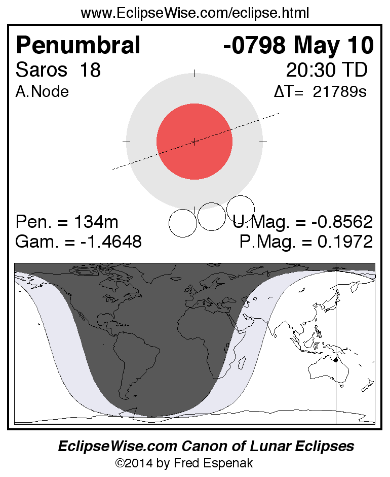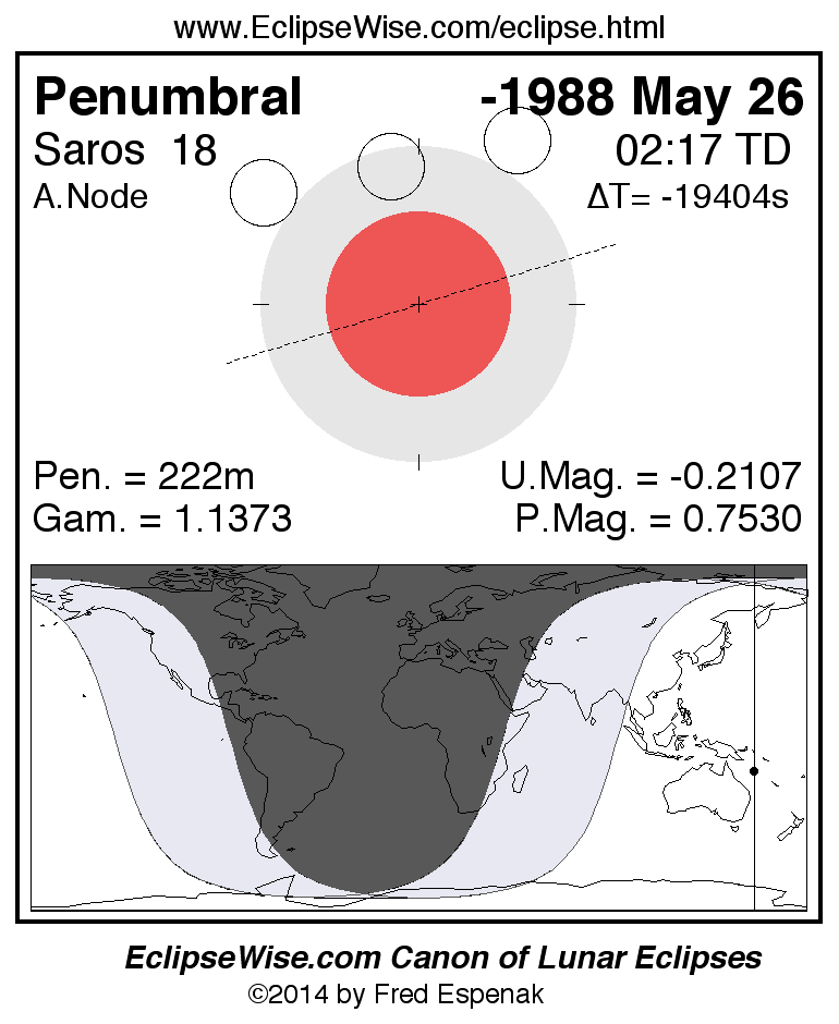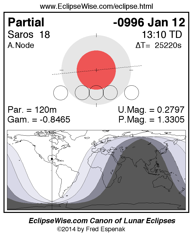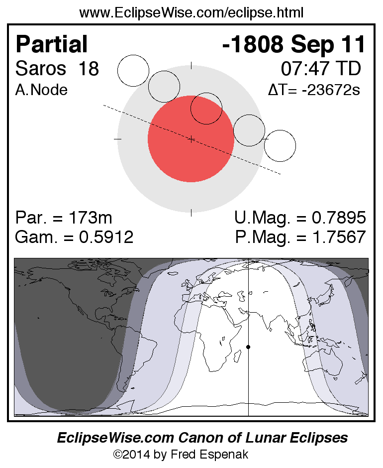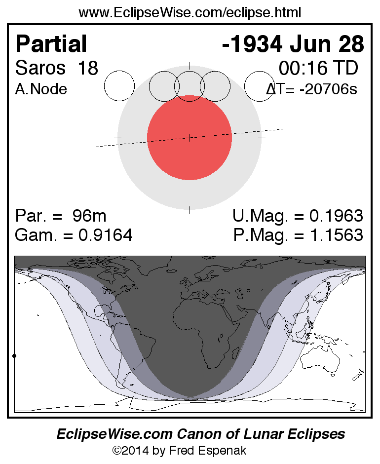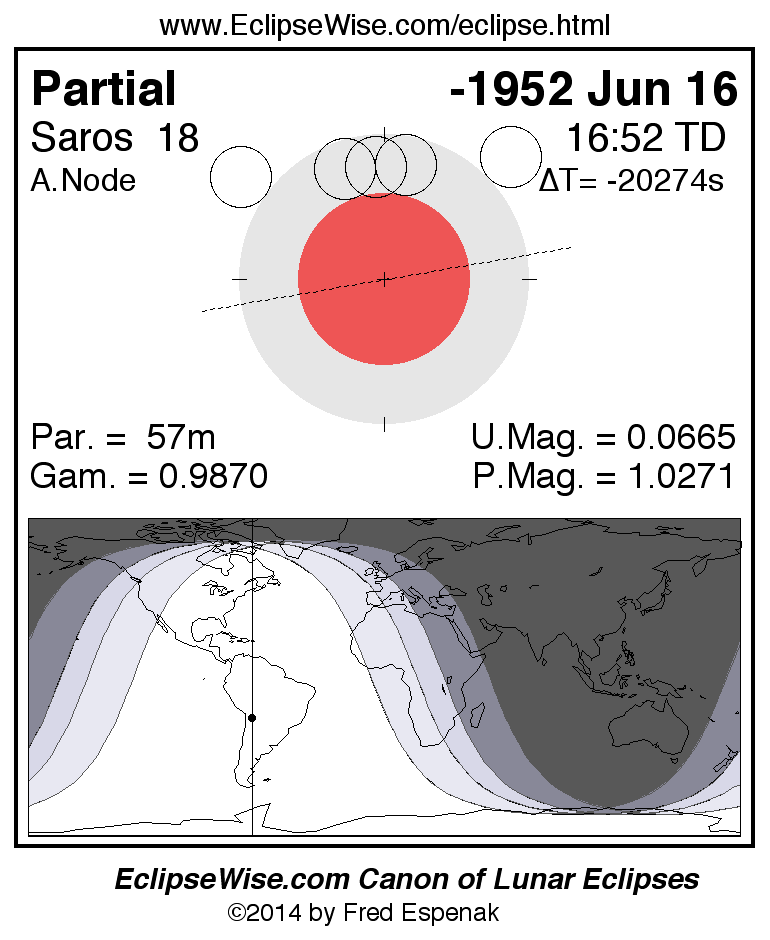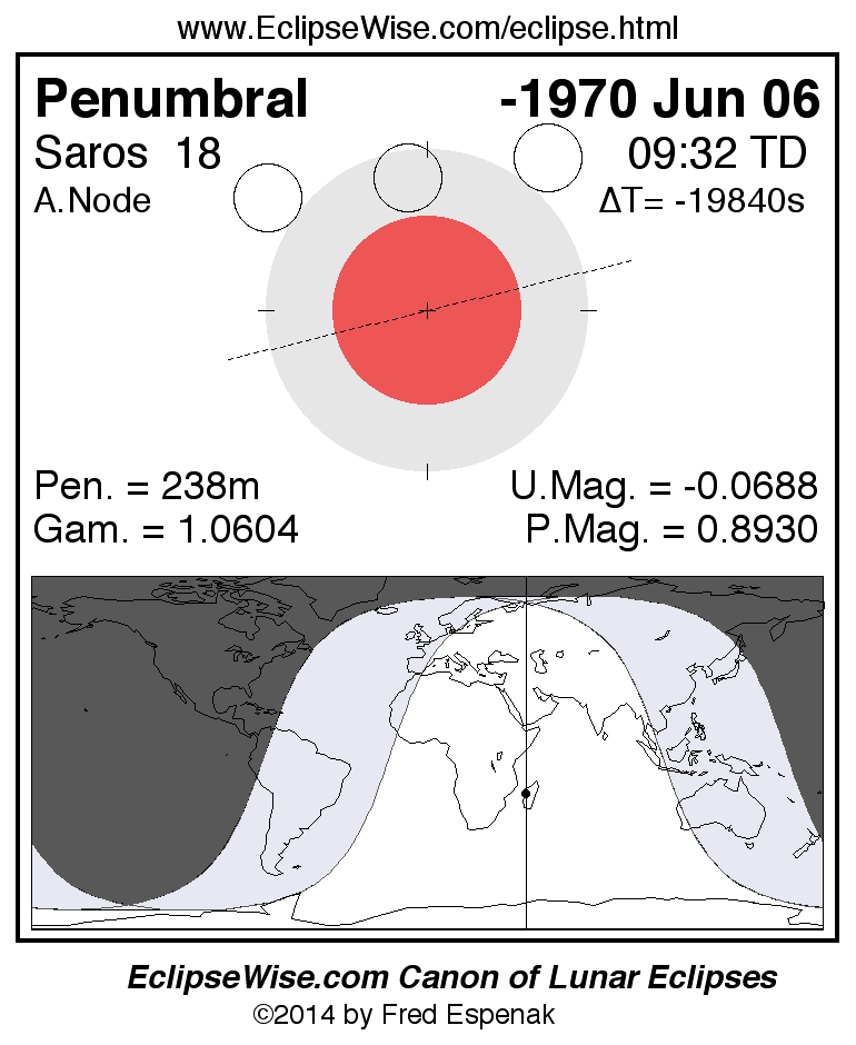 A panorama of all lunar eclipses belonging to Saros 18 is presented here. Each figure shows the Moon's path with respect to Earth's penumbral and umbral shadows. Below the path is a map depicting the geographic region of visibility for the eclipse. The date and time are given for the instant of Greatest Eclipse. Every figure serves as a hyperlink to the EclipseWise Prime page for that eclipse with a larger figure and complete details for the eclipse. Visit the Key to Lunar Eclipse Figures for a detailed explanation of these diagrams. Near the bottom of this page are a series of hyperlinks for more on lunar eclipses.