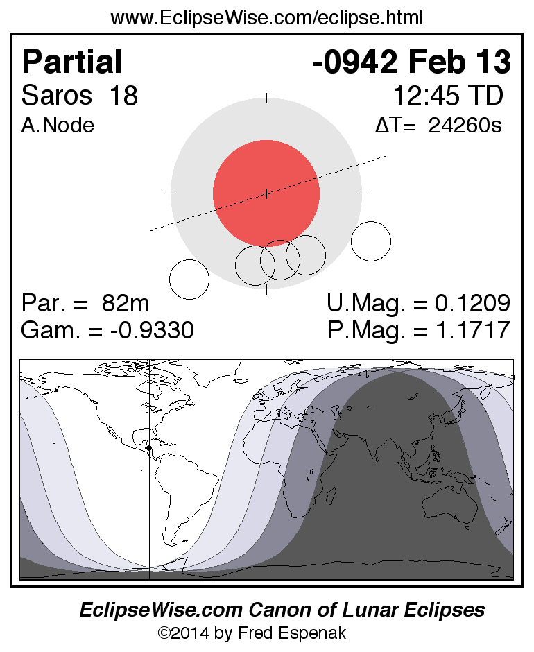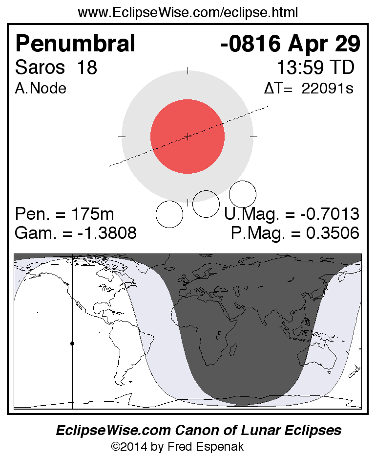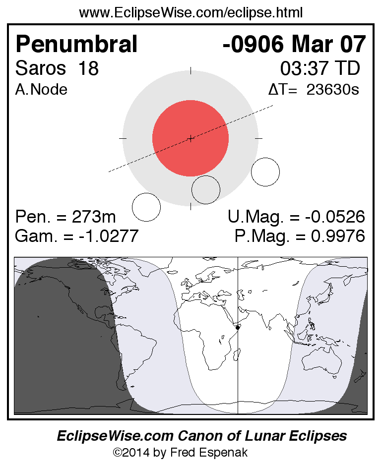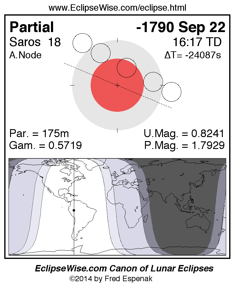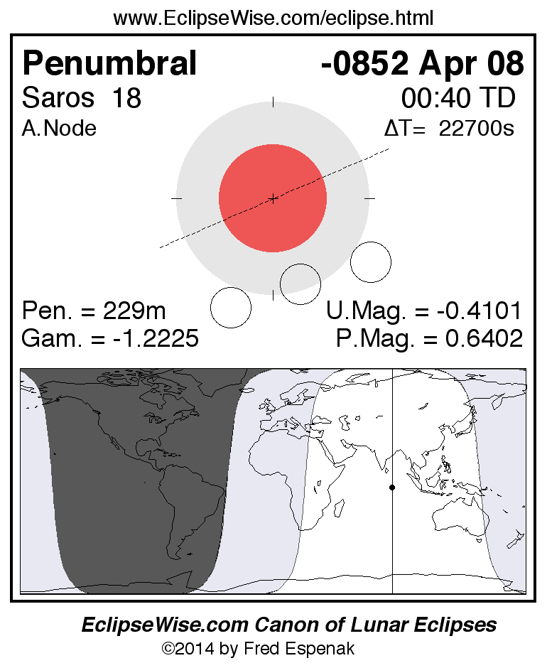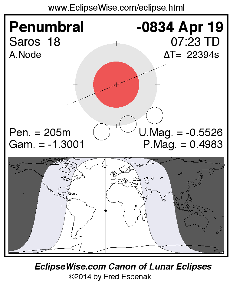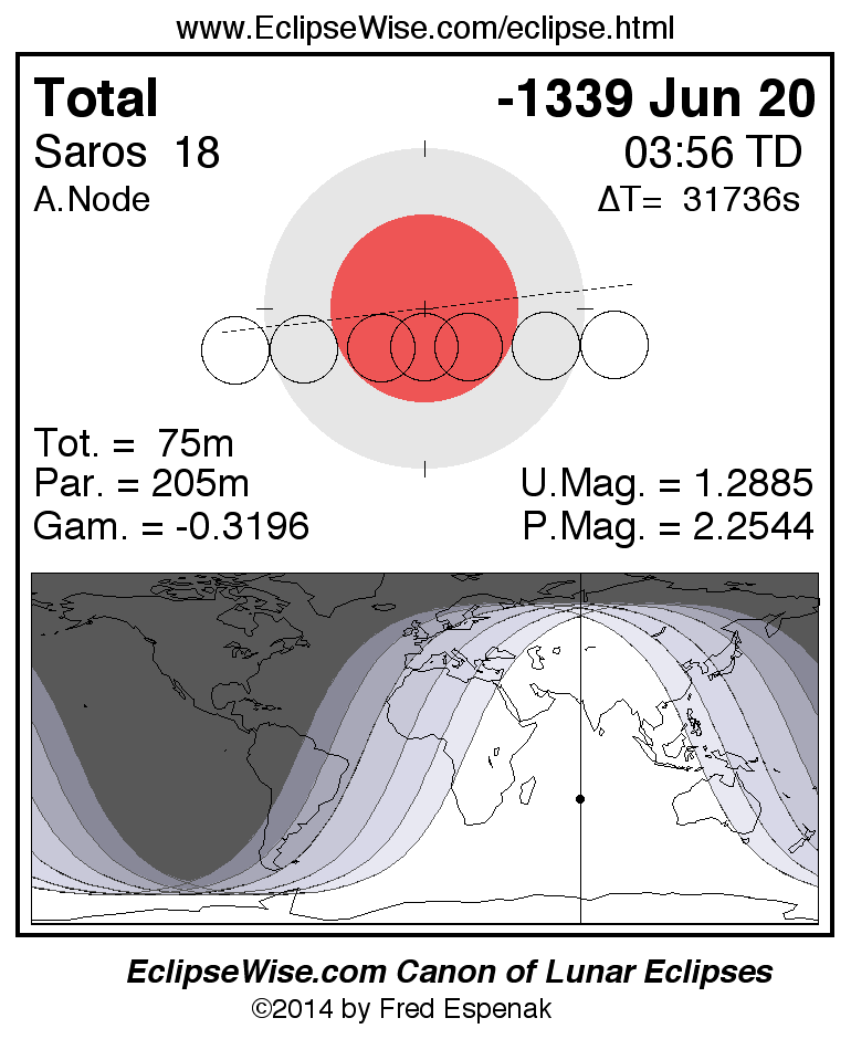 A panorama of all lunar eclipses belonging to Saros 18 is presented here. Each figure shows the Moon's path with respect to Earth's penumbral and umbral shadows. Below the path is a map depicting the geographic region of visibility for the eclipse. The date and time are given for the instant of Greatest Eclipse. Every figure serves as a hyperlink to the EclipseWise Prime page for that eclipse with a larger figure and complete details for the eclipse. Visit the Key to Lunar Eclipse Figures for a detailed explanation of these diagrams. Near the bottom of this page are a series of hyperlinks for more on lunar eclipses.