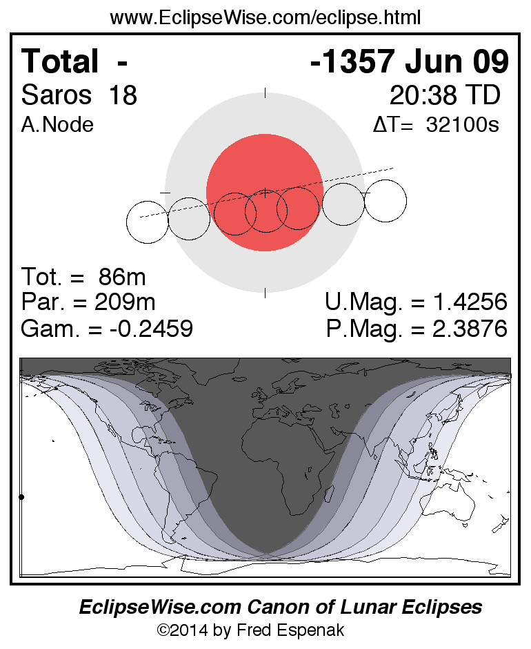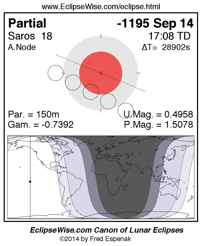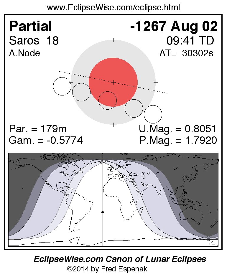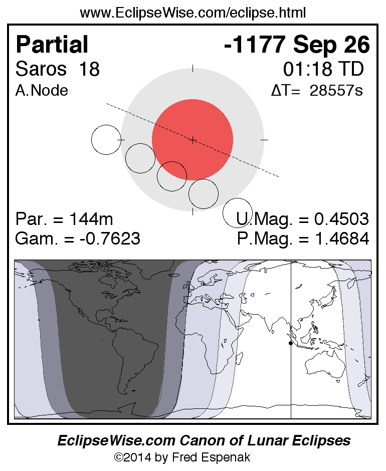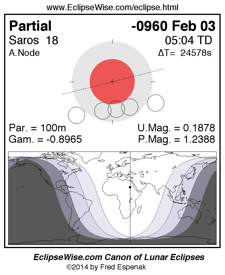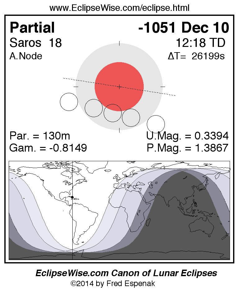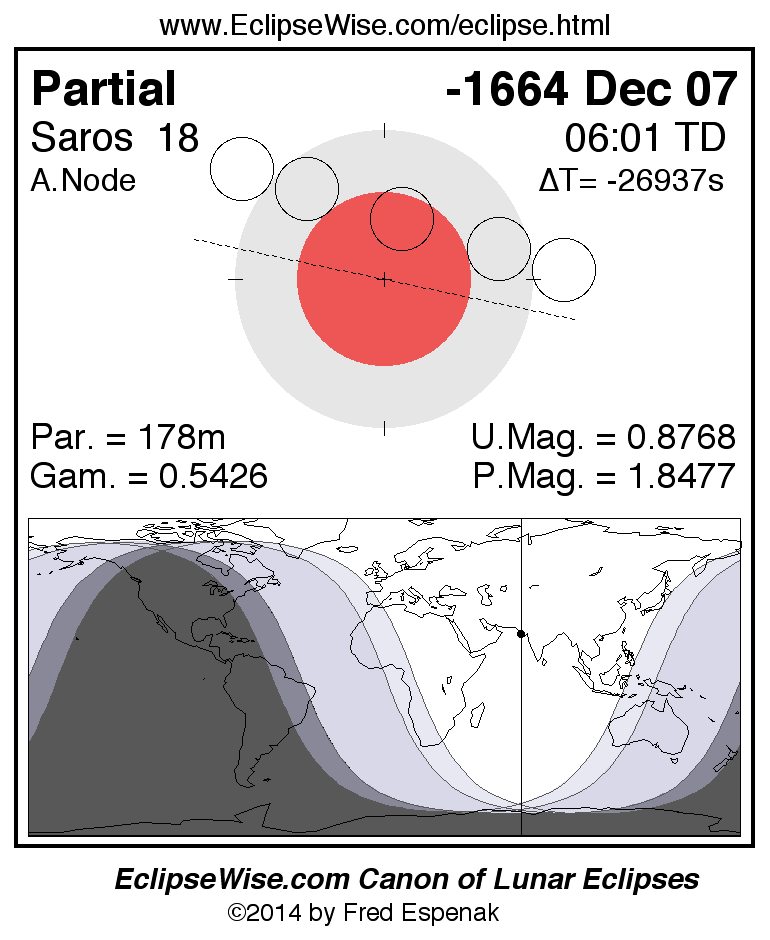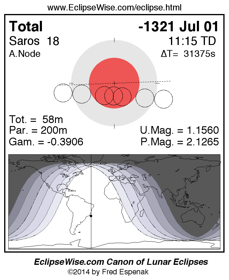 A panorama of all lunar eclipses belonging to Saros 18 is presented here. Each figure shows the Moon's path with respect to Earth's penumbral and umbral shadows. Below the path is a map depicting the geographic region of visibility for the eclipse. The date and time are given for the instant of Greatest Eclipse. Every figure serves as a hyperlink to the EclipseWise Prime page for that eclipse with a larger figure and complete details for the eclipse. Visit the Key to Lunar Eclipse Figures for a detailed explanation of these diagrams. Near the bottom of this page are a series of hyperlinks for more on lunar eclipses.