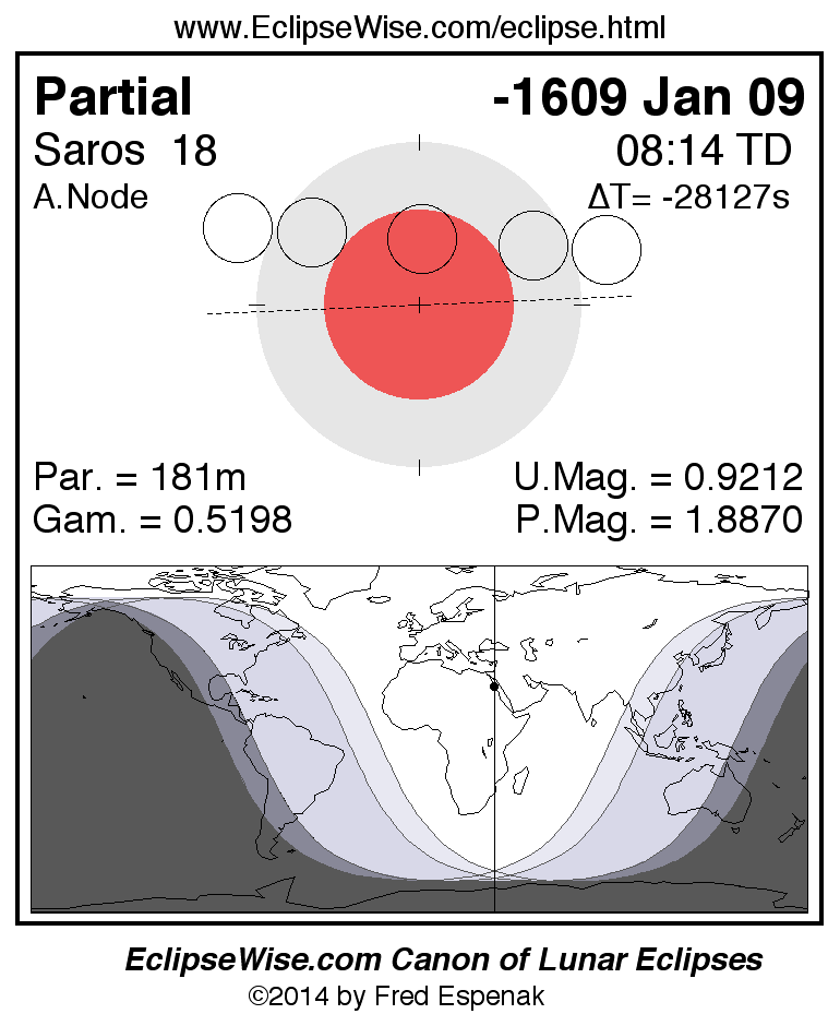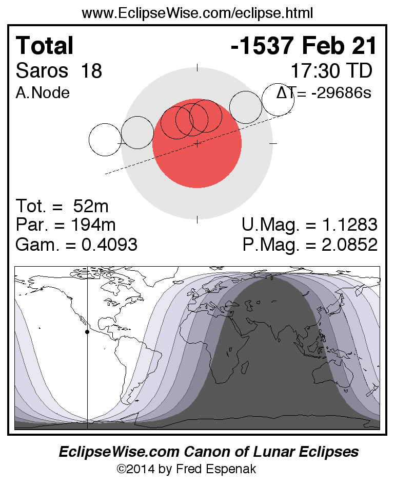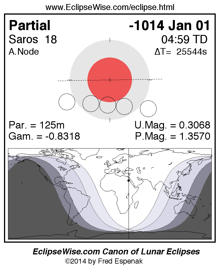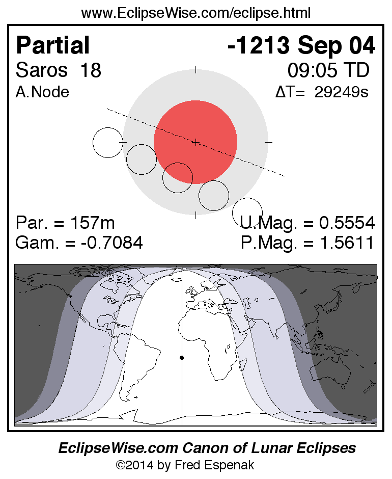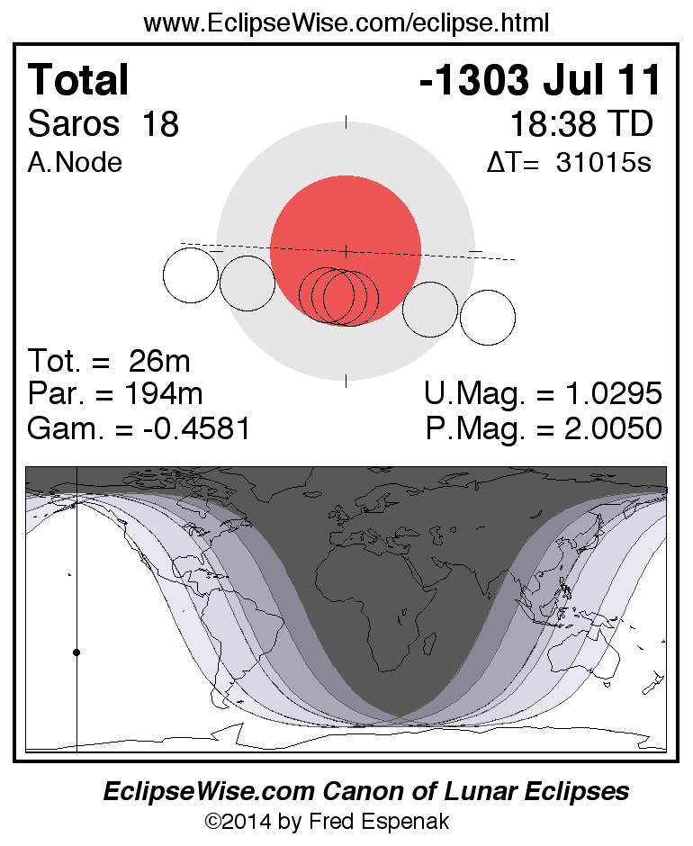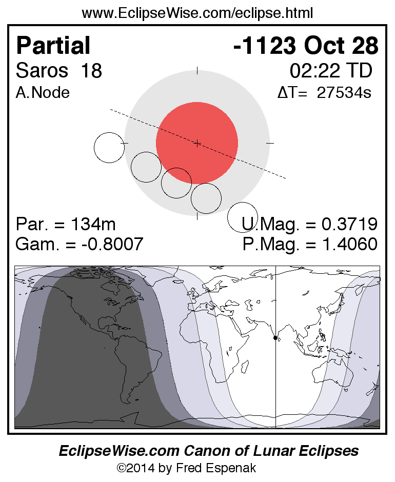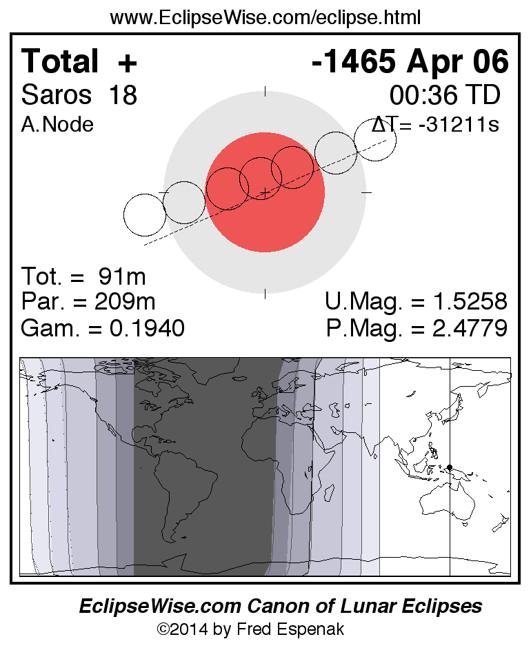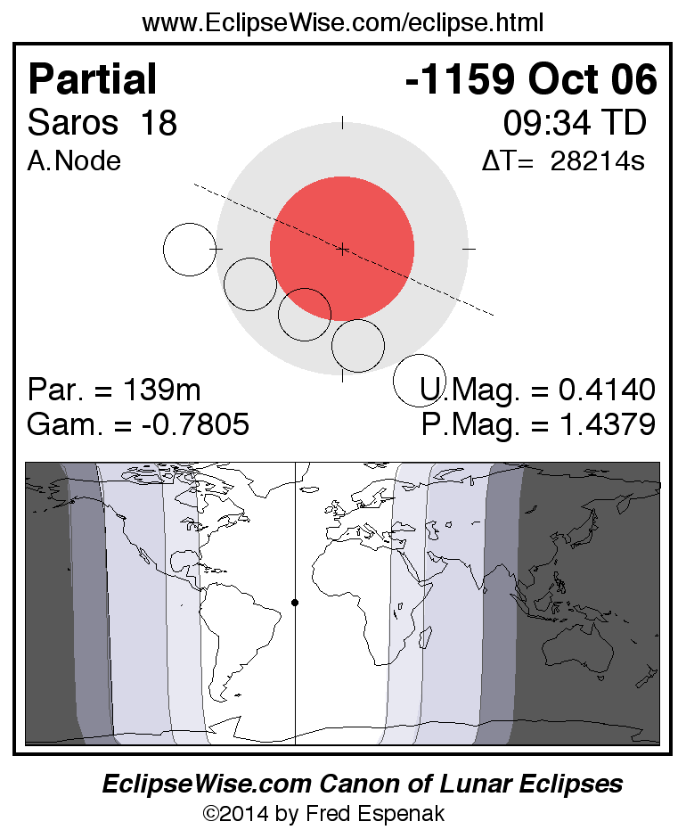 A panorama of all lunar eclipses belonging to Saros 18 is presented here. Each figure shows the Moon's path with respect to Earth's penumbral and umbral shadows. Below the path is a map depicting the geographic region of visibility for the eclipse. The date and time are given for the instant of Greatest Eclipse. Every figure serves as a hyperlink to the EclipseWise Prime page for that eclipse with a larger figure and complete details for the eclipse. Visit the Key to Lunar Eclipse Figures for a detailed explanation of these diagrams. Near the bottom of this page are a series of hyperlinks for more on lunar eclipses.