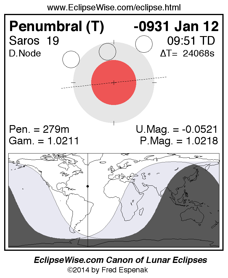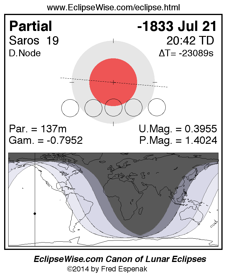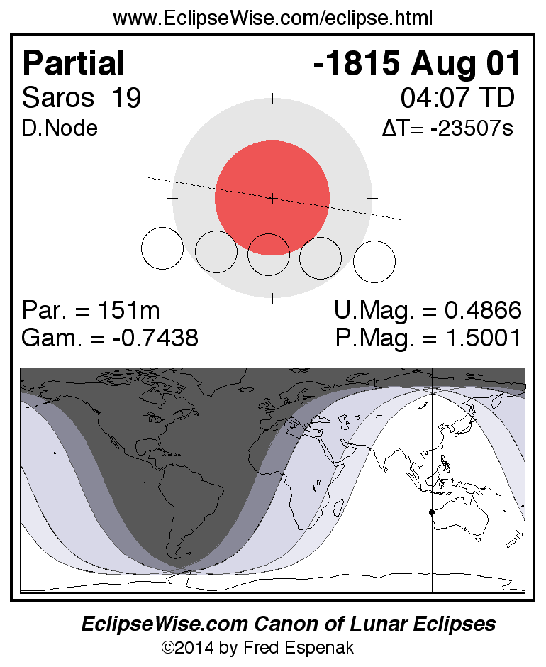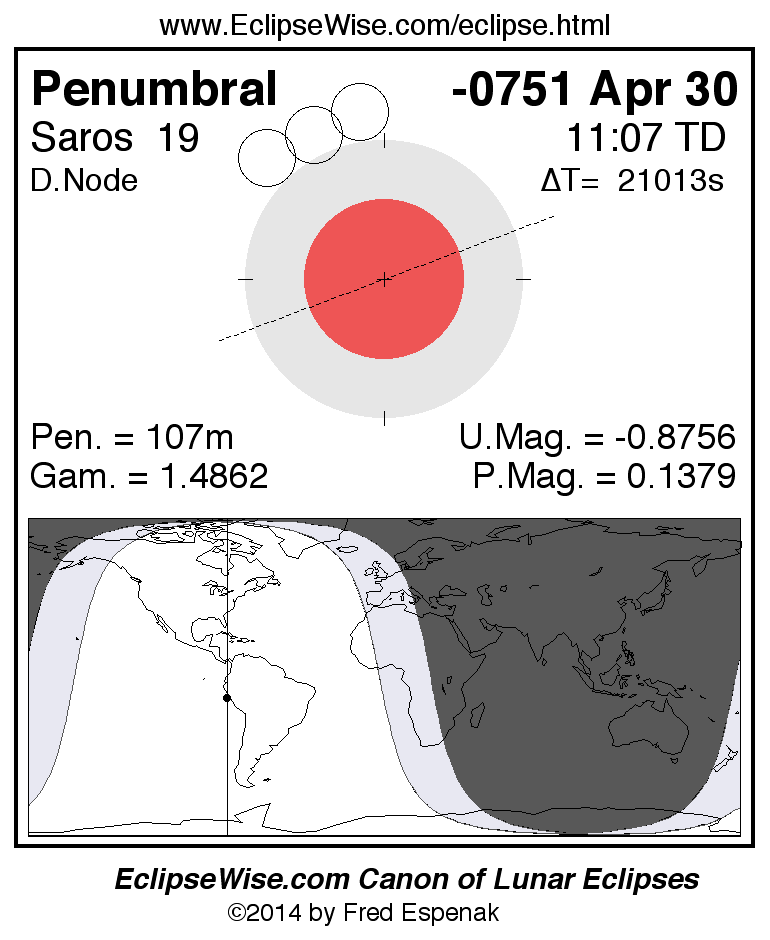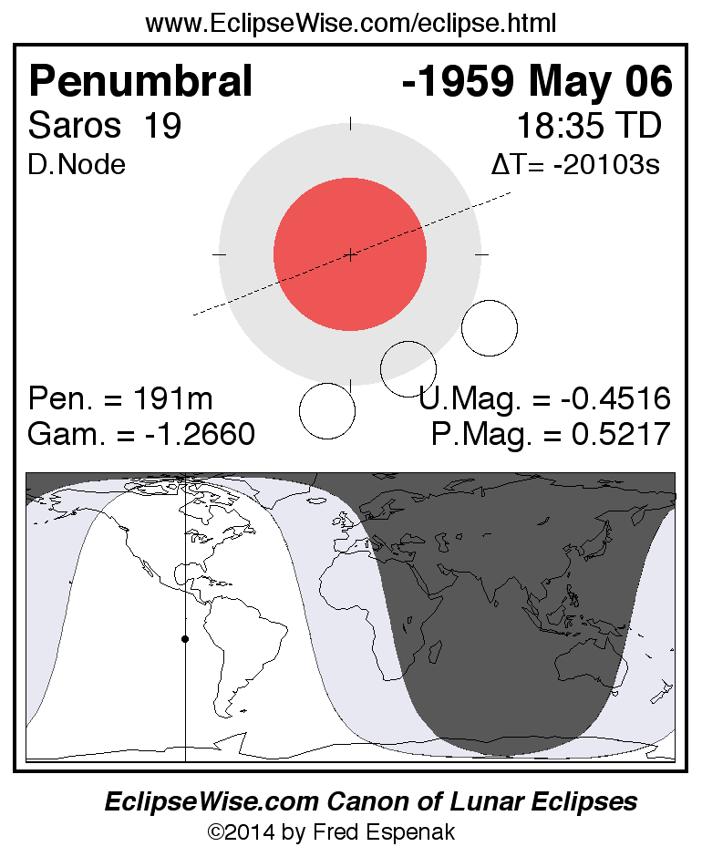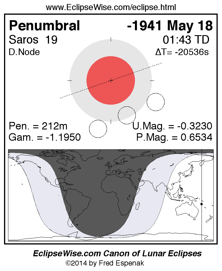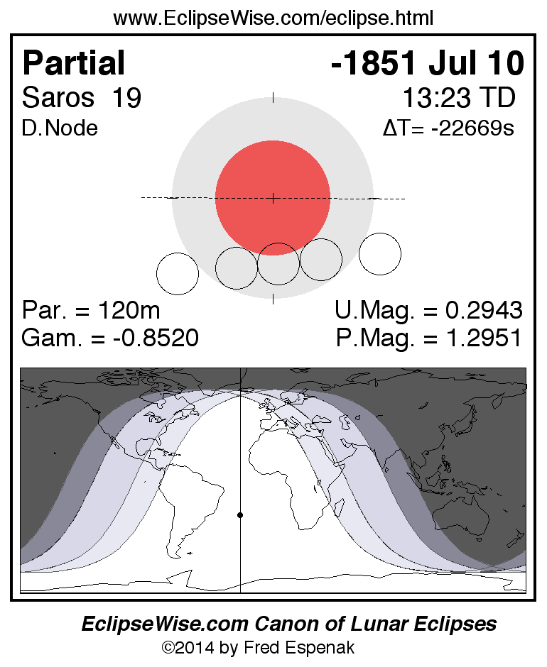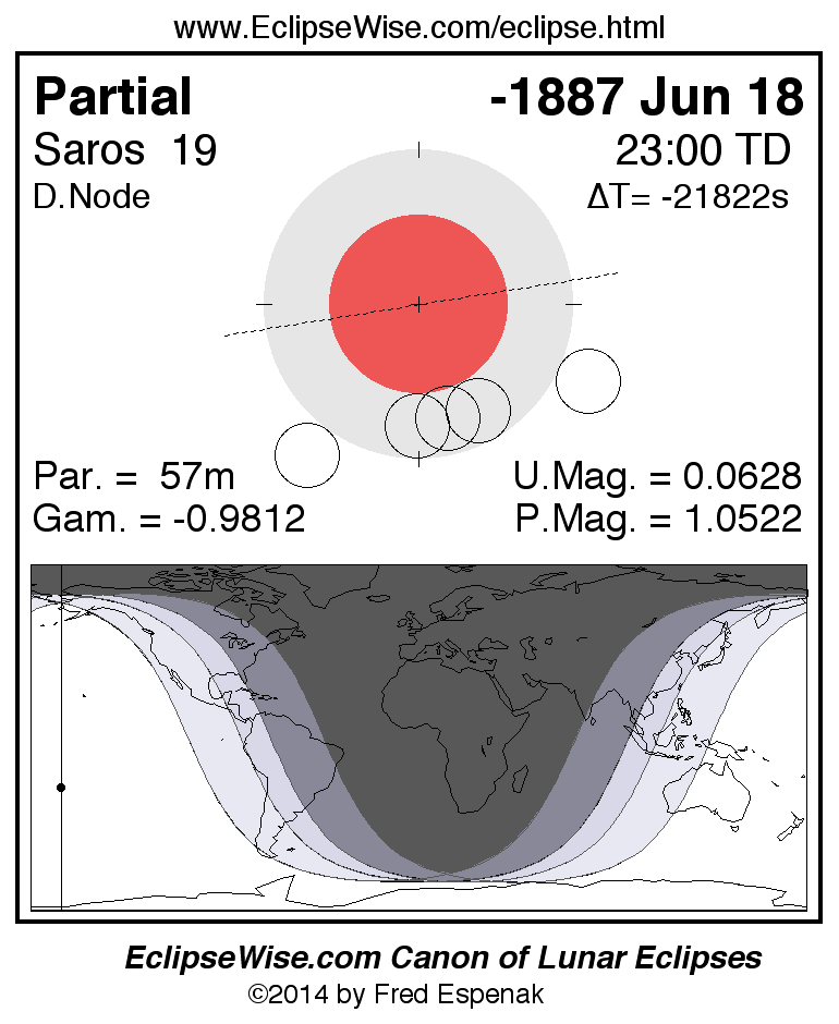 A panorama of all lunar eclipses belonging to Saros 19 is presented here. Each figure shows the Moon's path with respect to Earth's penumbral and umbral shadows. Below the path is a map depicting the geographic region of visibility for the eclipse. The date and time are given for the instant of Greatest Eclipse. Every figure serves as a hyperlink to the EclipseWise Prime page for that eclipse with a larger figure and complete details for the eclipse. Visit the Key to Lunar Eclipse Figures for a detailed explanation of these diagrams. Near the bottom of this page are a series of hyperlinks for more on lunar eclipses.