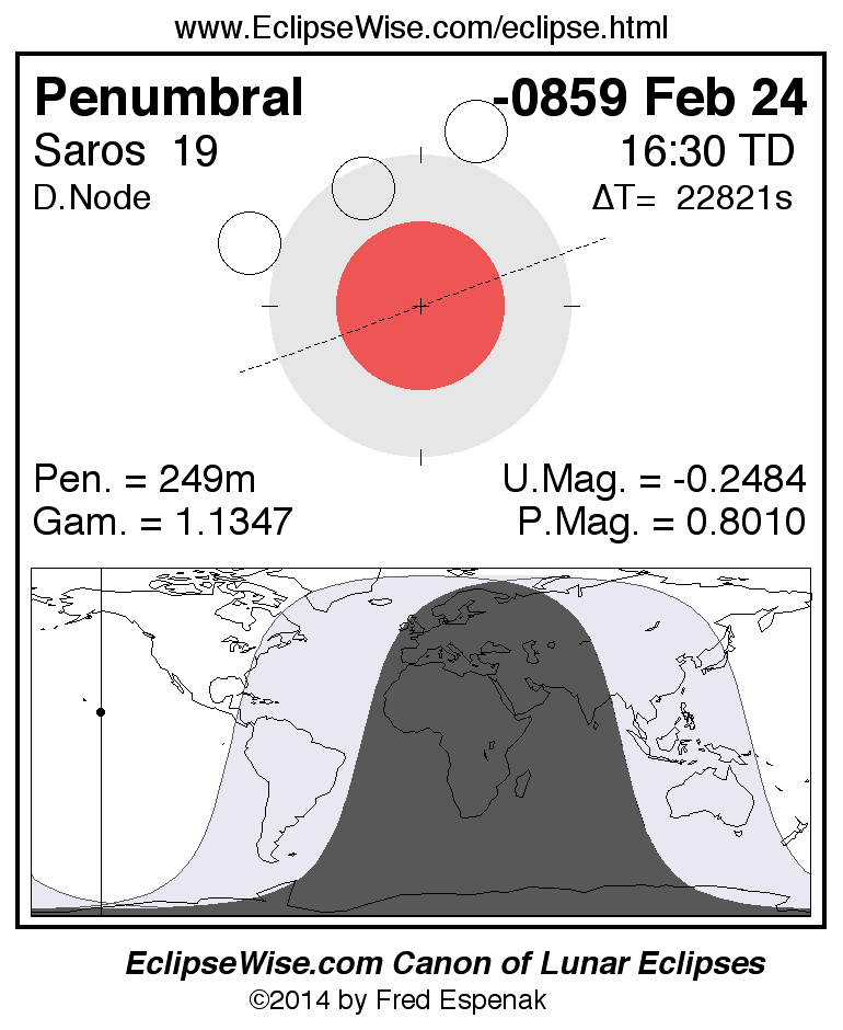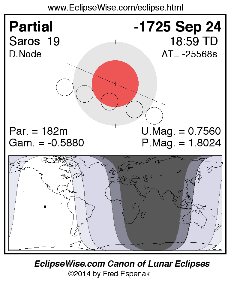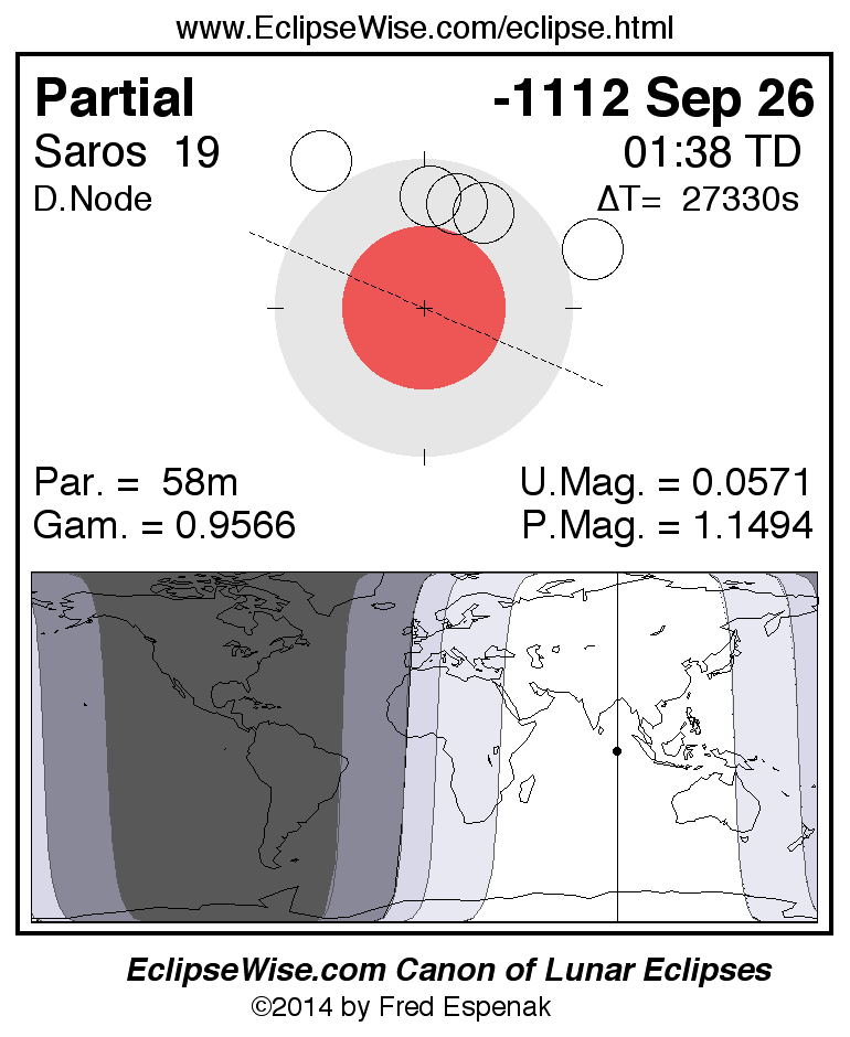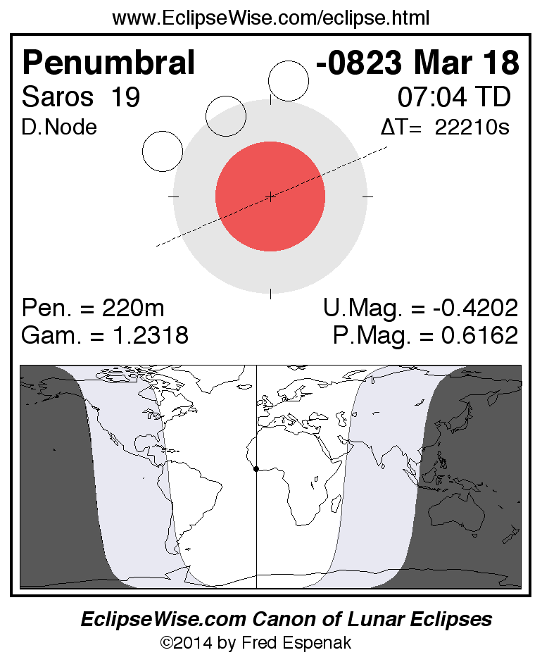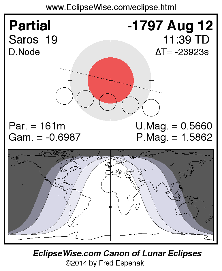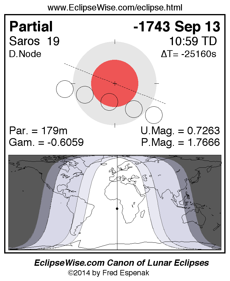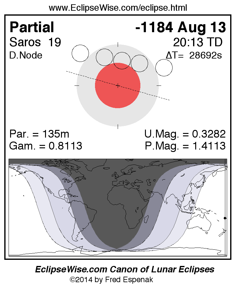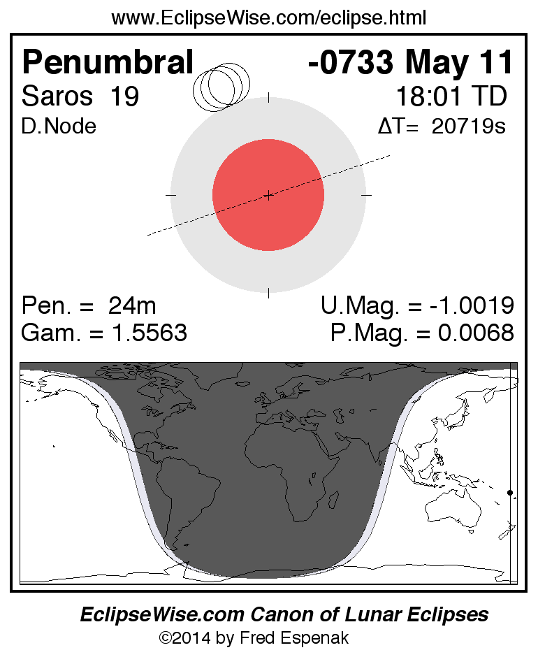 A panorama of all lunar eclipses belonging to Saros 19 is presented here. Each figure shows the Moon's path with respect to Earth's penumbral and umbral shadows. Below the path is a map depicting the geographic region of visibility for the eclipse. The date and time are given for the instant of Greatest Eclipse. Every figure serves as a hyperlink to the EclipseWise Prime page for that eclipse with a larger figure and complete details for the eclipse. Visit the Key to Lunar Eclipse Figures for a detailed explanation of these diagrams. Near the bottom of this page are a series of hyperlinks for more on lunar eclipses.