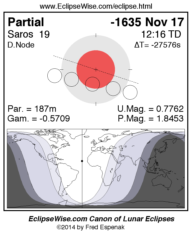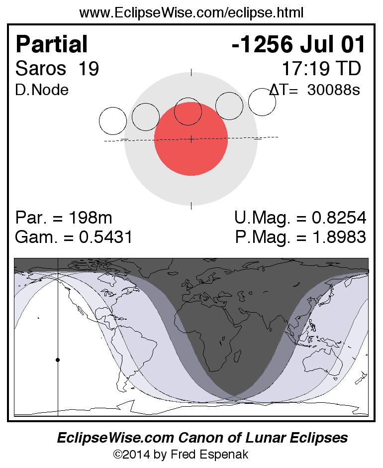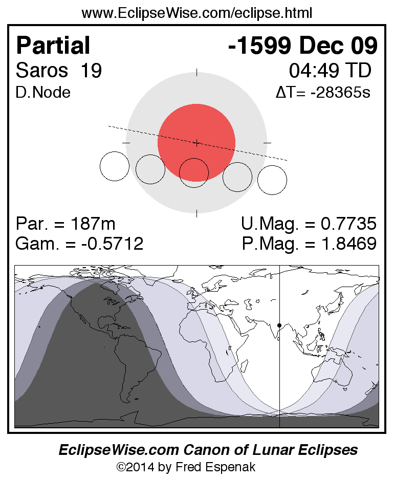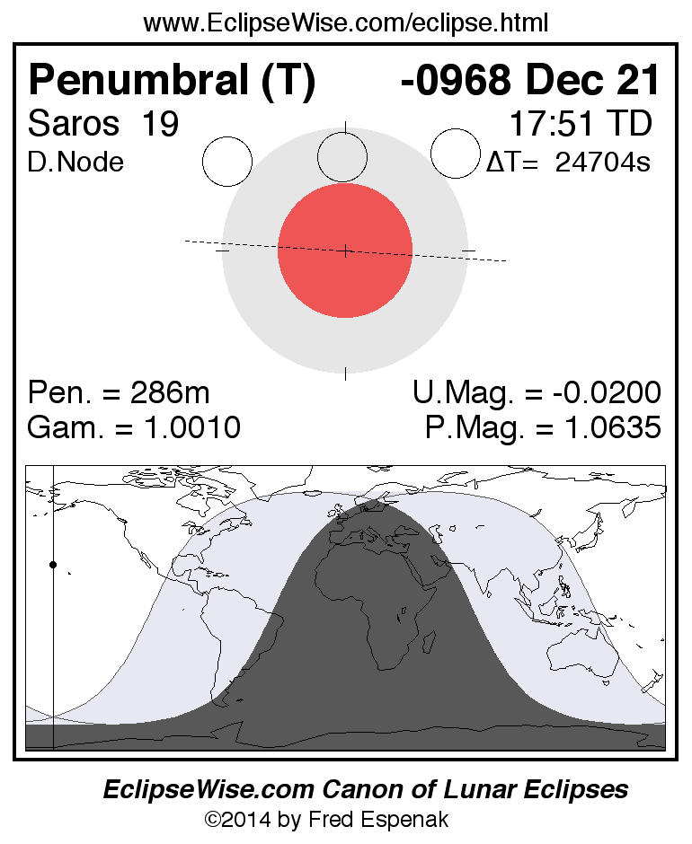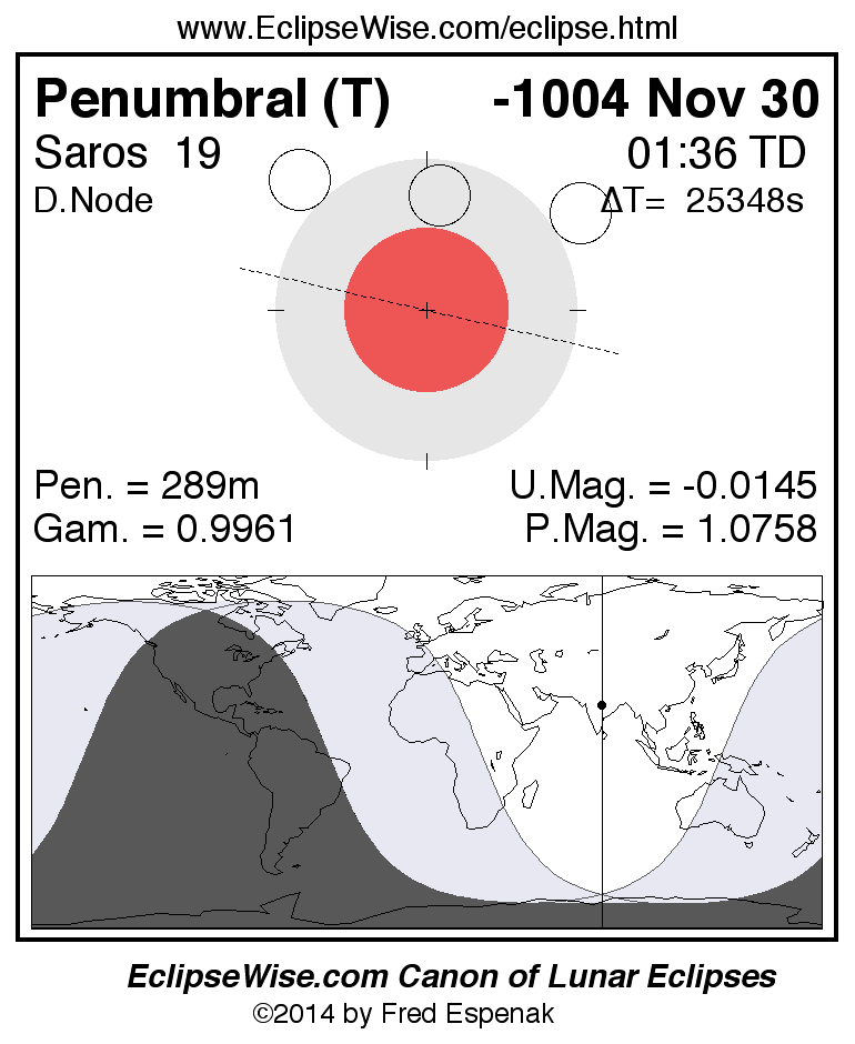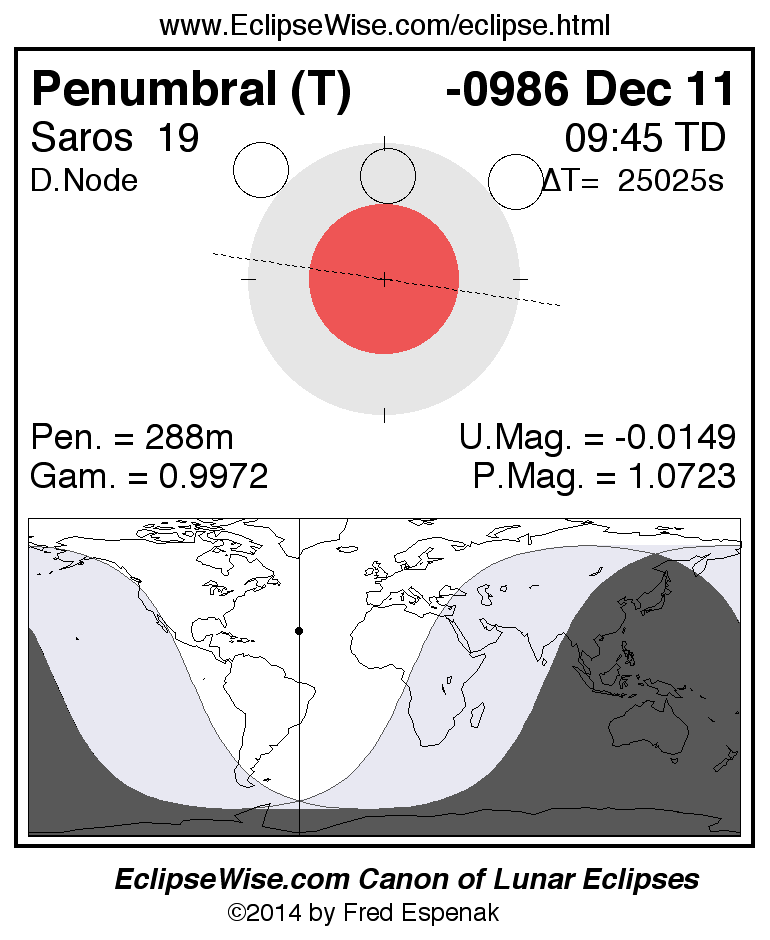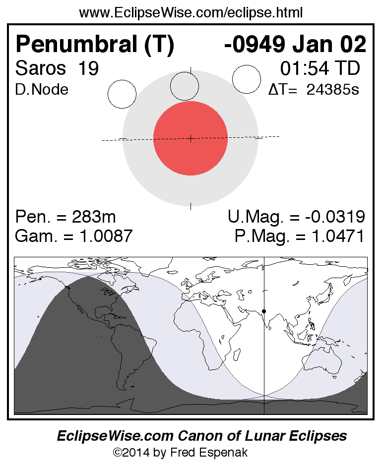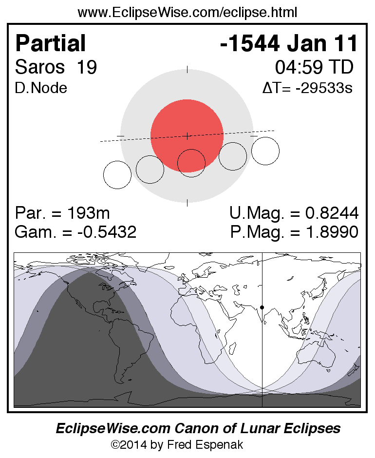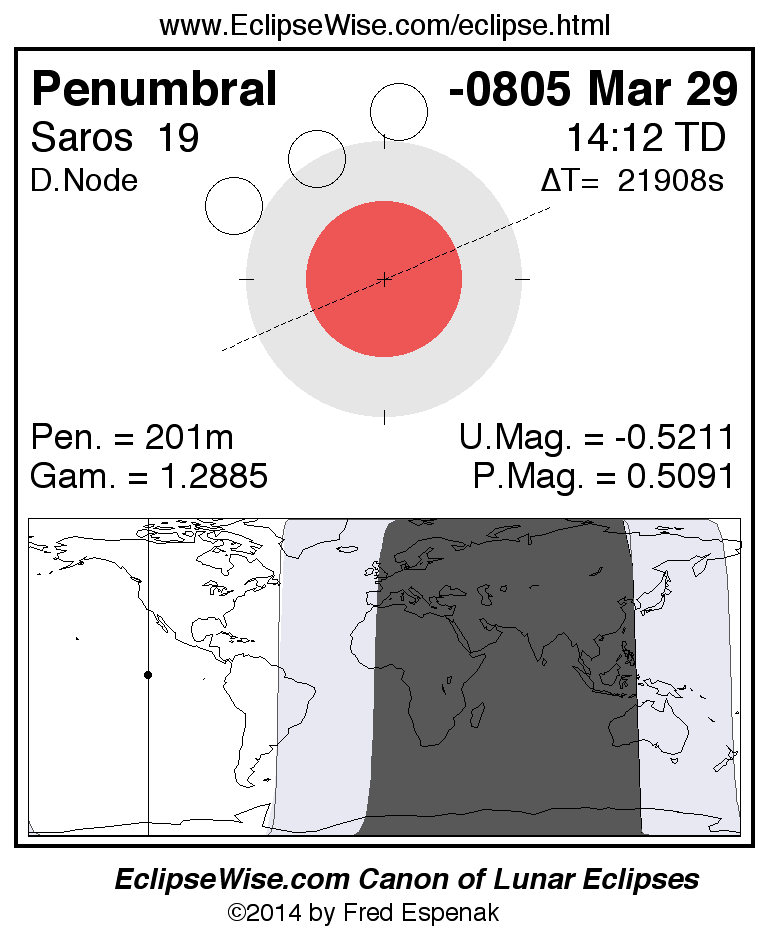 A panorama of all lunar eclipses belonging to Saros 19 is presented here. Each figure shows the Moon's path with respect to Earth's penumbral and umbral shadows. Below the path is a map depicting the geographic region of visibility for the eclipse. The date and time are given for the instant of Greatest Eclipse. Every figure serves as a hyperlink to the EclipseWise Prime page for that eclipse with a larger figure and complete details for the eclipse. Visit the Key to Lunar Eclipse Figures for a detailed explanation of these diagrams. Near the bottom of this page are a series of hyperlinks for more on lunar eclipses.