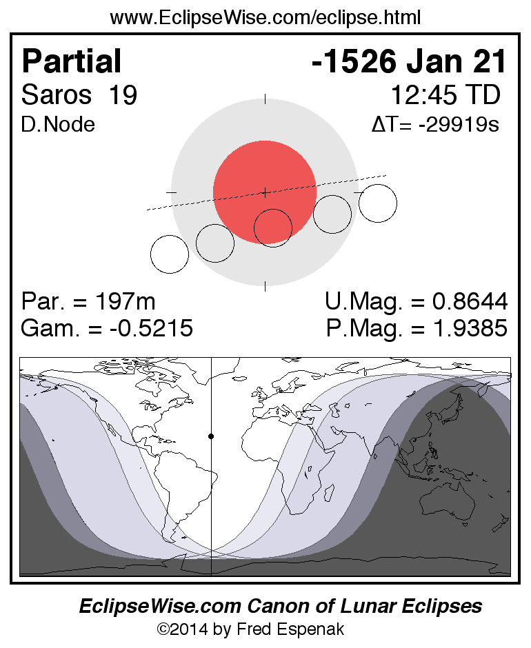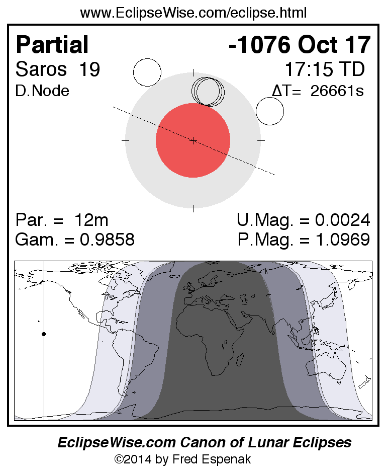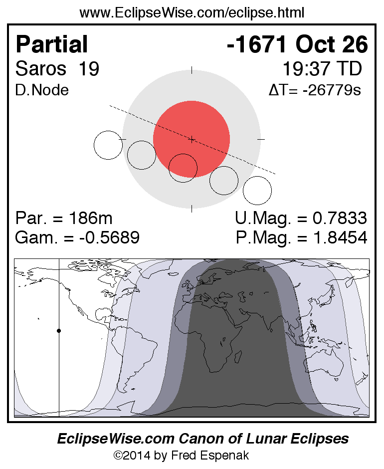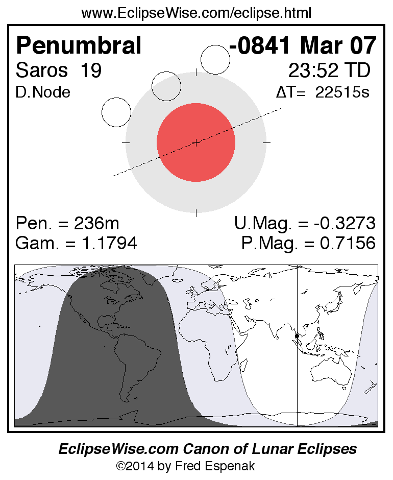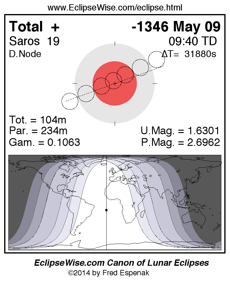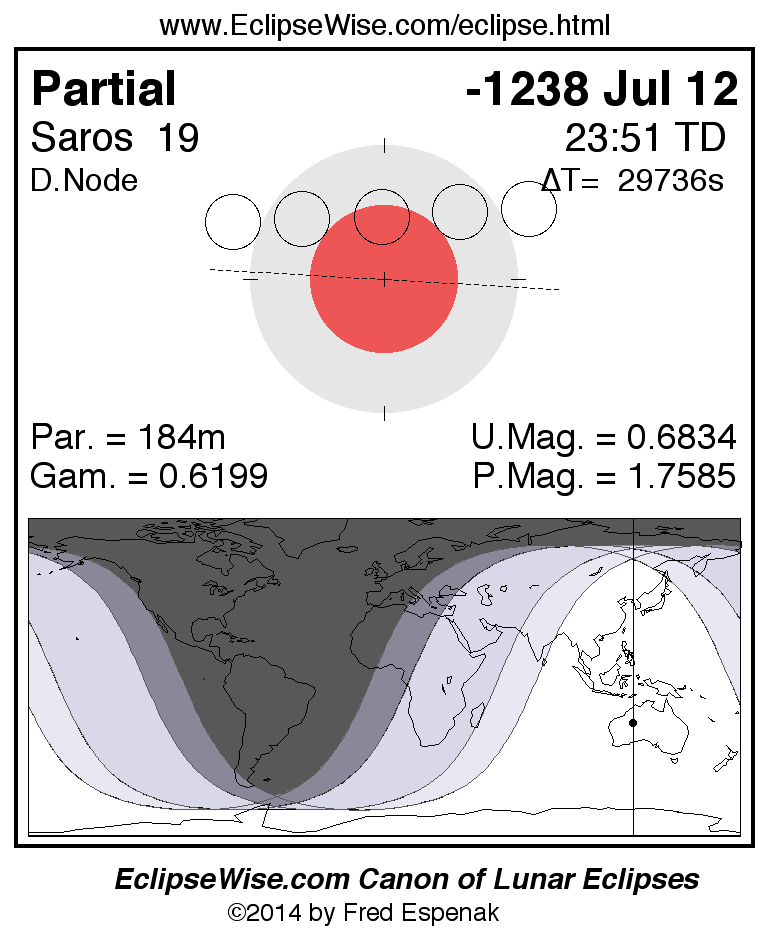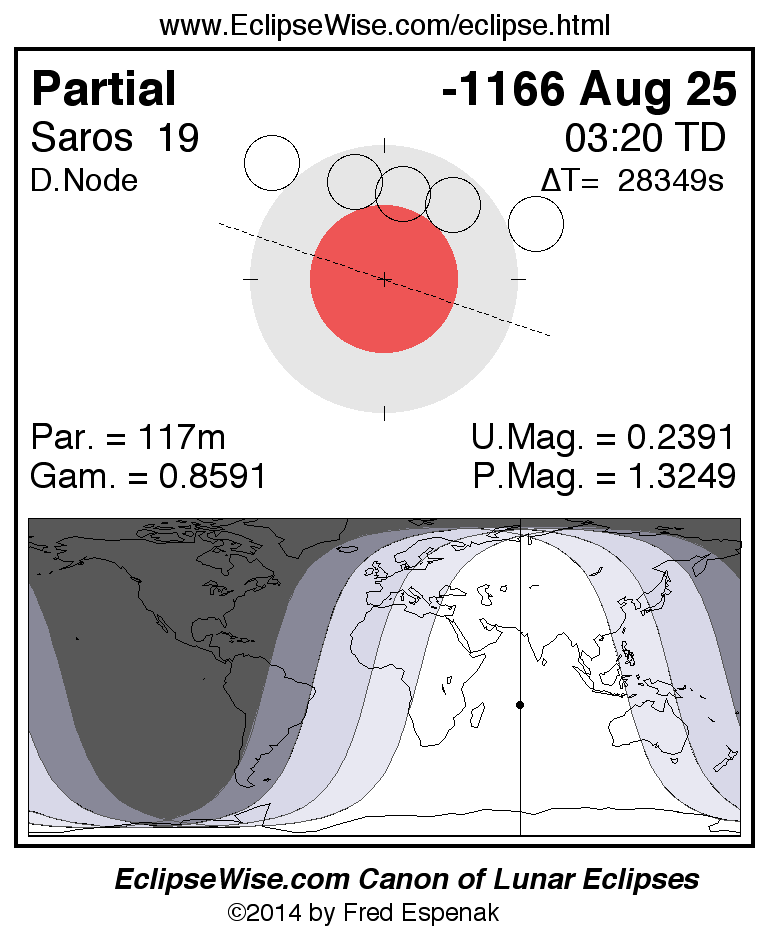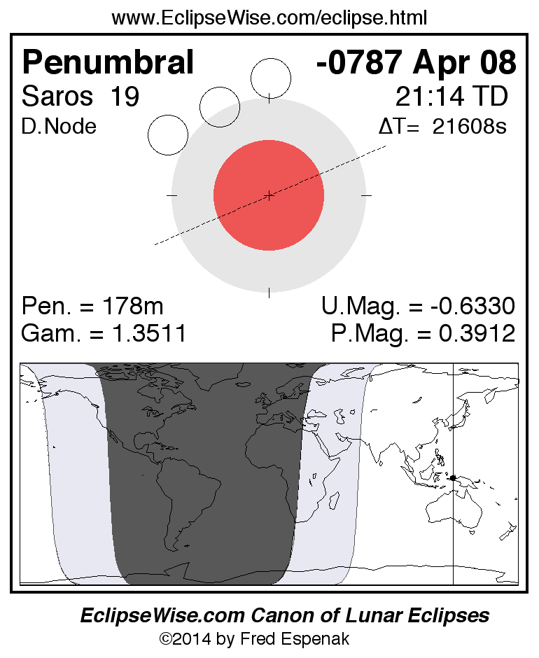 A panorama of all lunar eclipses belonging to Saros 19 is presented here. Each figure shows the Moon's path with respect to Earth's penumbral and umbral shadows. Below the path is a map depicting the geographic region of visibility for the eclipse. The date and time are given for the instant of Greatest Eclipse. Every figure serves as a hyperlink to the EclipseWise Prime page for that eclipse with a larger figure and complete details for the eclipse. Visit the Key to Lunar Eclipse Figures for a detailed explanation of these diagrams. Near the bottom of this page are a series of hyperlinks for more on lunar eclipses.