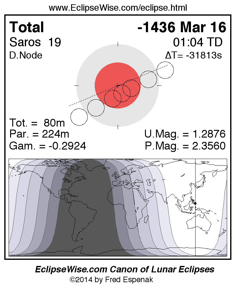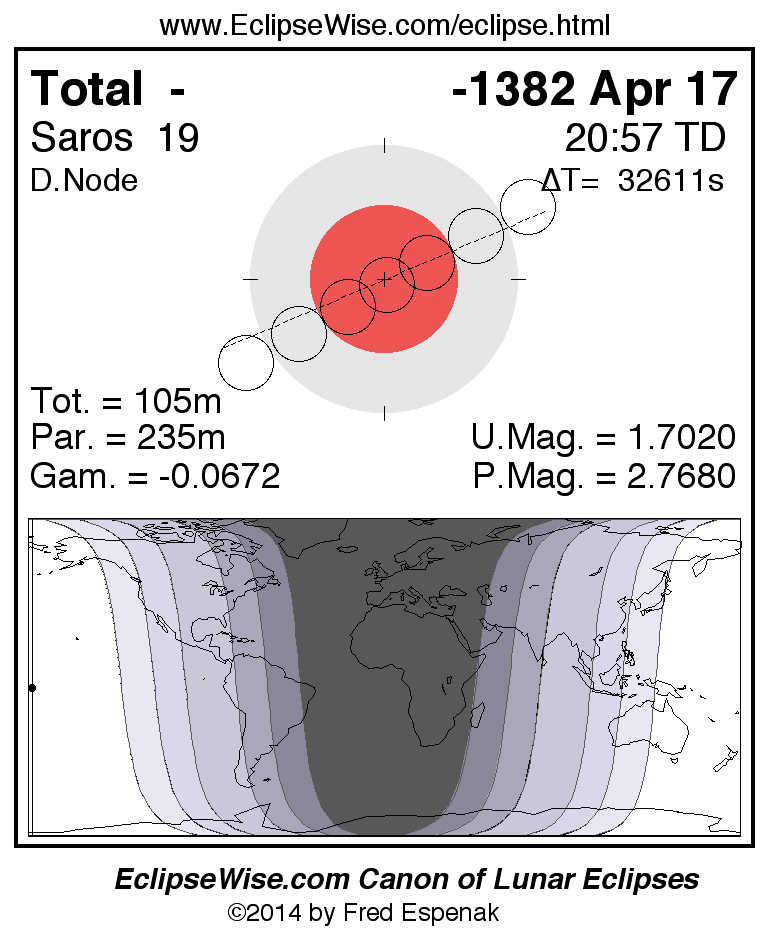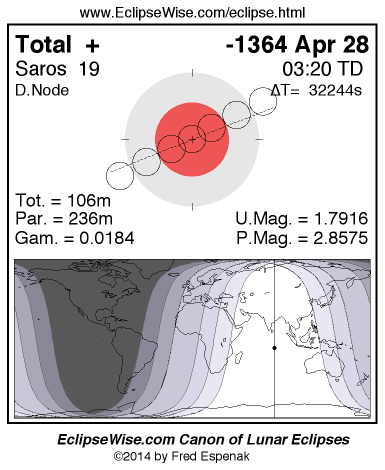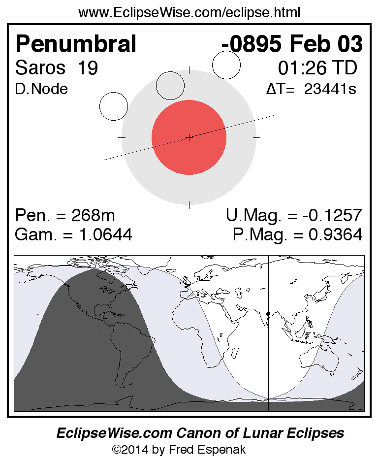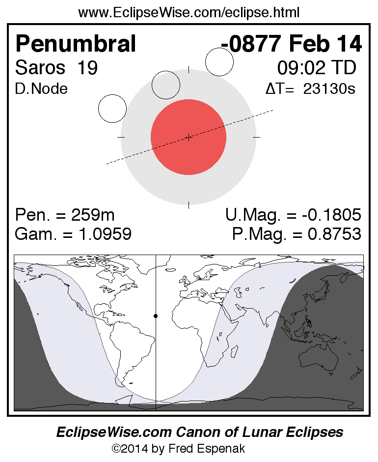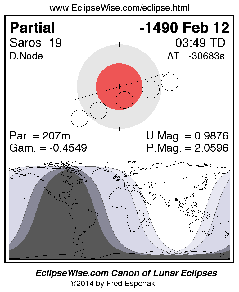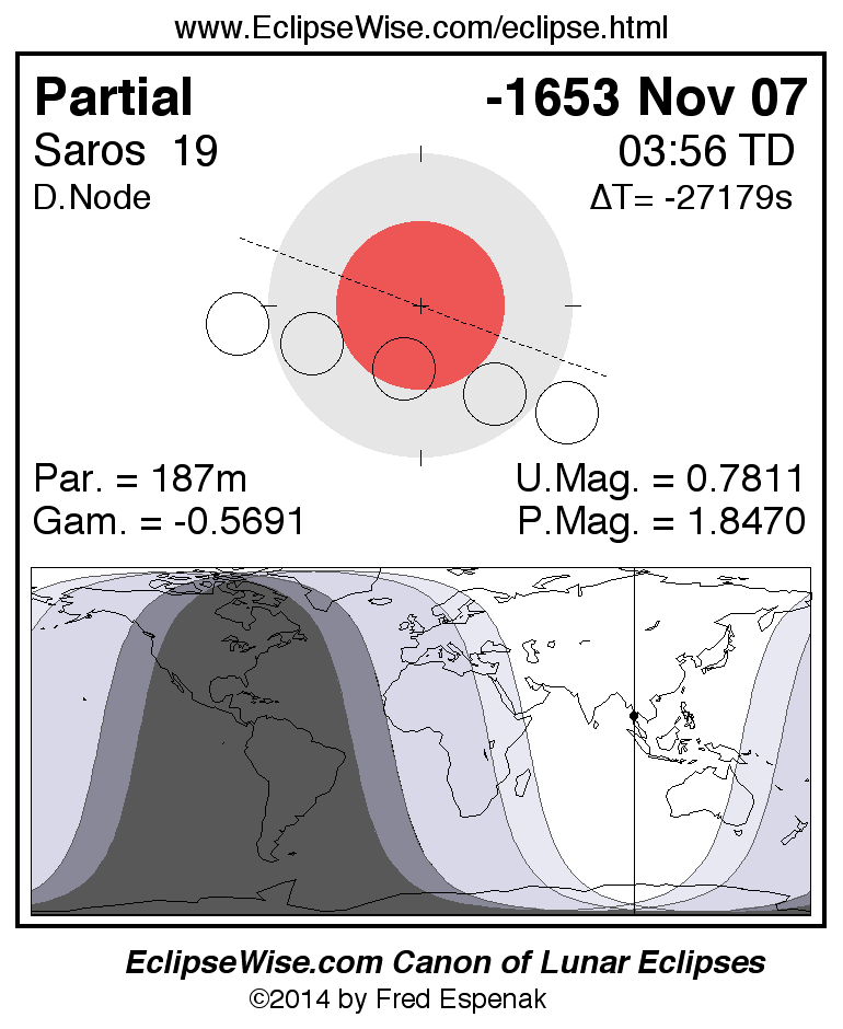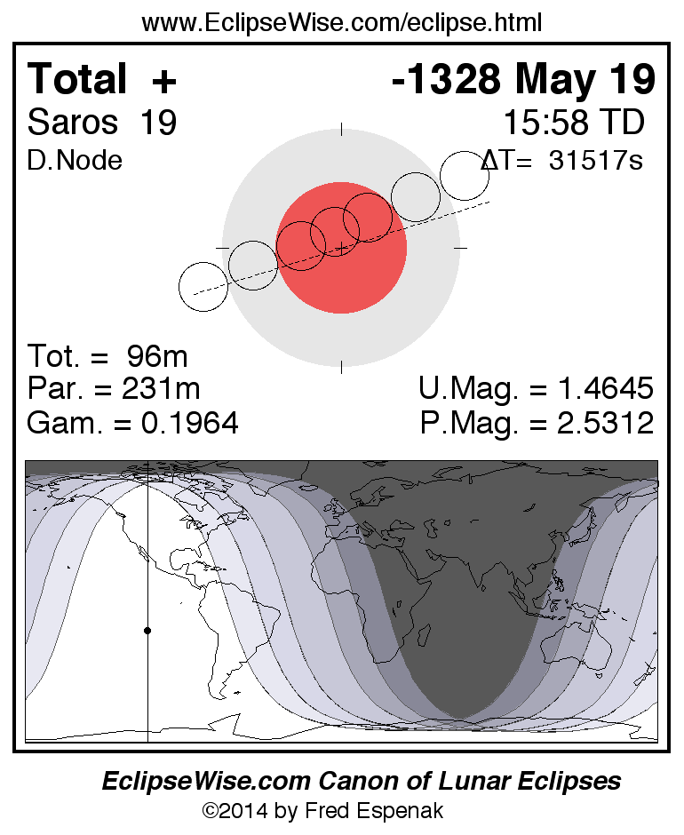 A panorama of all lunar eclipses belonging to Saros 19 is presented here. Each figure shows the Moon's path with respect to Earth's penumbral and umbral shadows. Below the path is a map depicting the geographic region of visibility for the eclipse. The date and time are given for the instant of Greatest Eclipse. Every figure serves as a hyperlink to the EclipseWise Prime page for that eclipse with a larger figure and complete details for the eclipse. Visit the Key to Lunar Eclipse Figures for a detailed explanation of these diagrams. Near the bottom of this page are a series of hyperlinks for more on lunar eclipses.