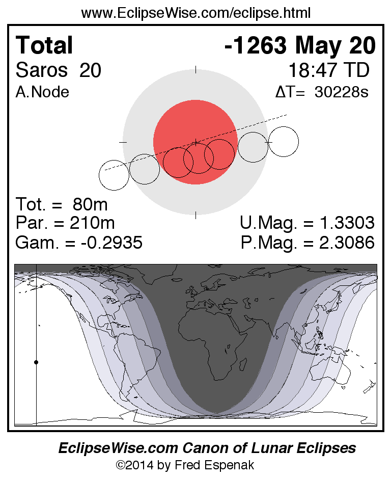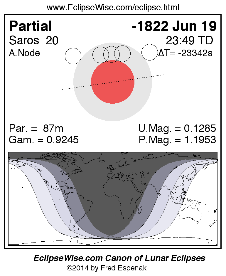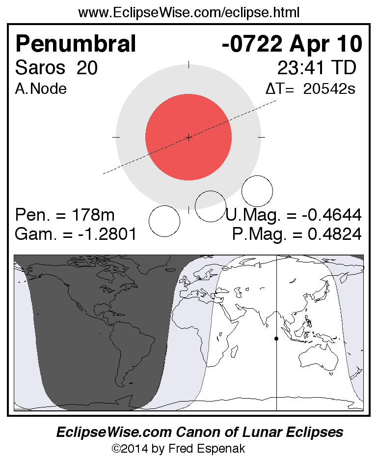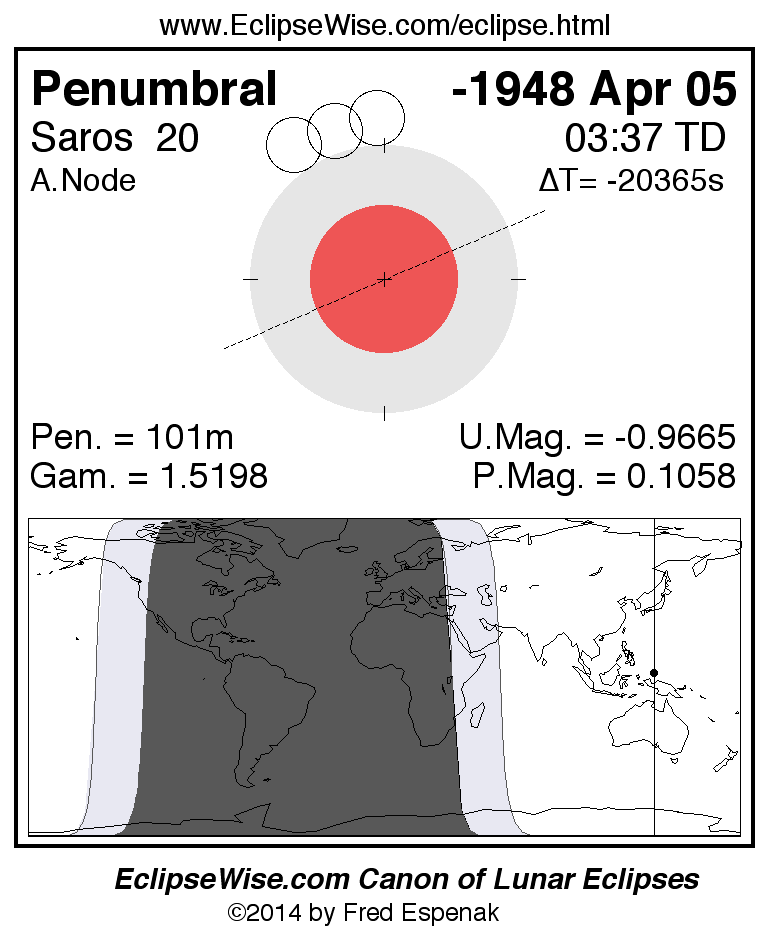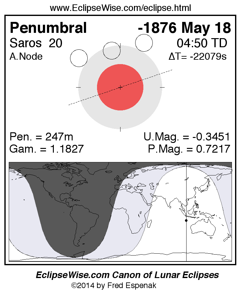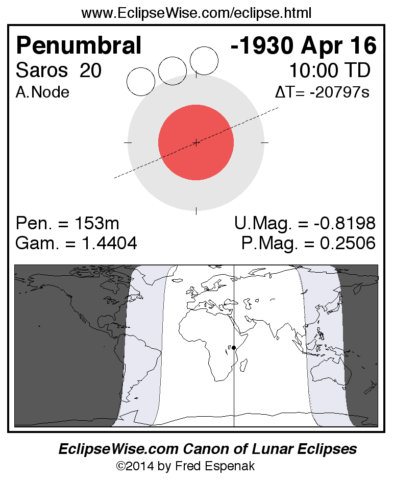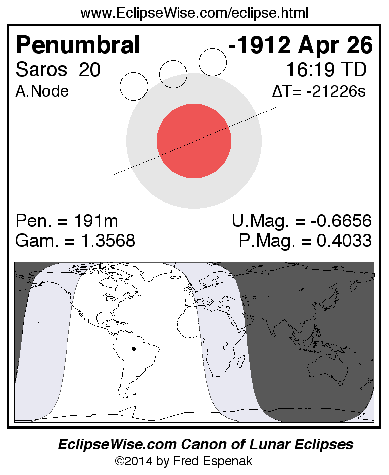 A panorama of all lunar eclipses belonging to Saros 20 is presented here. Each figure shows the Moon's path with respect to Earth's penumbral and umbral shadows. Below the path is a map depicting the geographic region of visibility for the eclipse. The date and time are given for the instant of Greatest Eclipse. Every figure serves as a hyperlink to the EclipseWise Prime page for that eclipse with a larger figure and complete details for the eclipse. Visit the Key to Lunar Eclipse Figures for a detailed explanation of these diagrams. Near the bottom of this page are a series of hyperlinks for more on lunar eclipses.